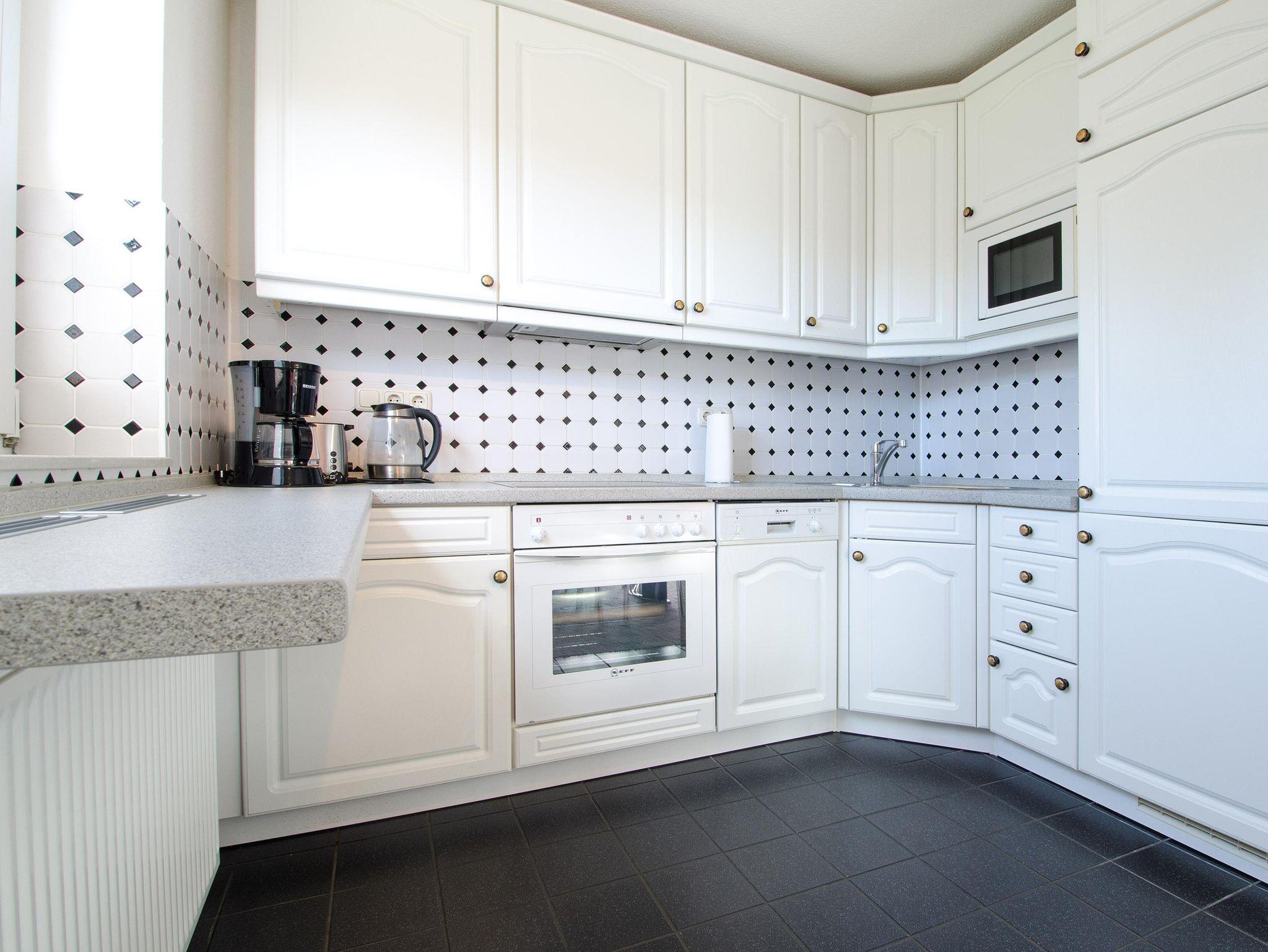Komplett ausgestattet mit Kühlschrank, Gefrierschrank, Elektroherd mit Ceranfeld und Backofen, Mikrowelle, Spülmaschine, Kaffeemaschine, Toaster und Wasserkocher.