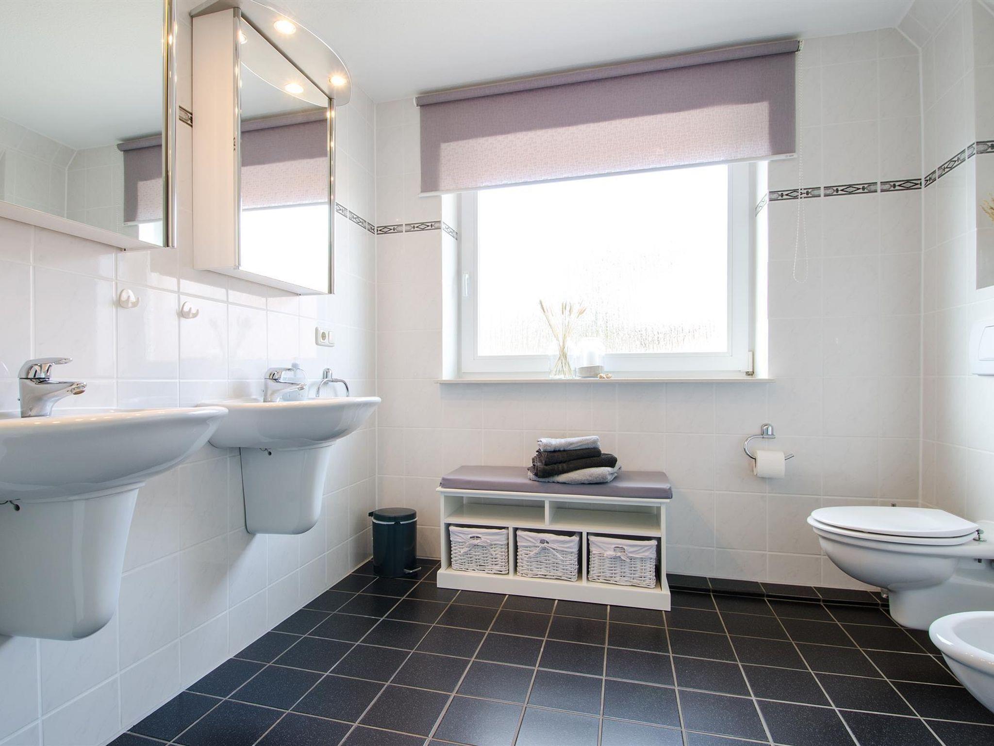 Dusche, WC, Bidet, zwei Waschbecken, Fußbodenheizung. Zusätzlich separates Gäste-WC.