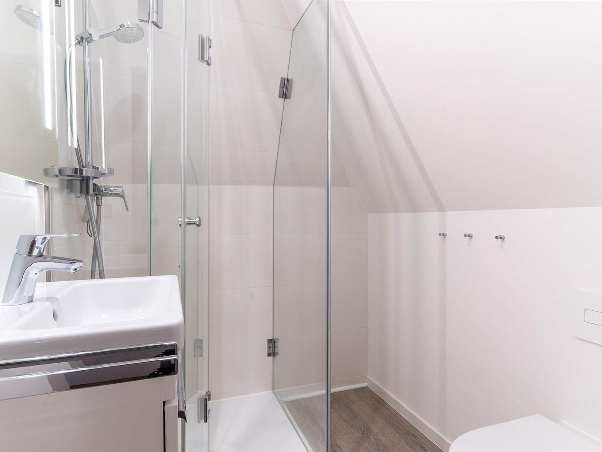 Das moderne Bad mit Fenster verfügt über eine bodentiefe Regendusche, Handtuchheizung, Waschbecken und WC.