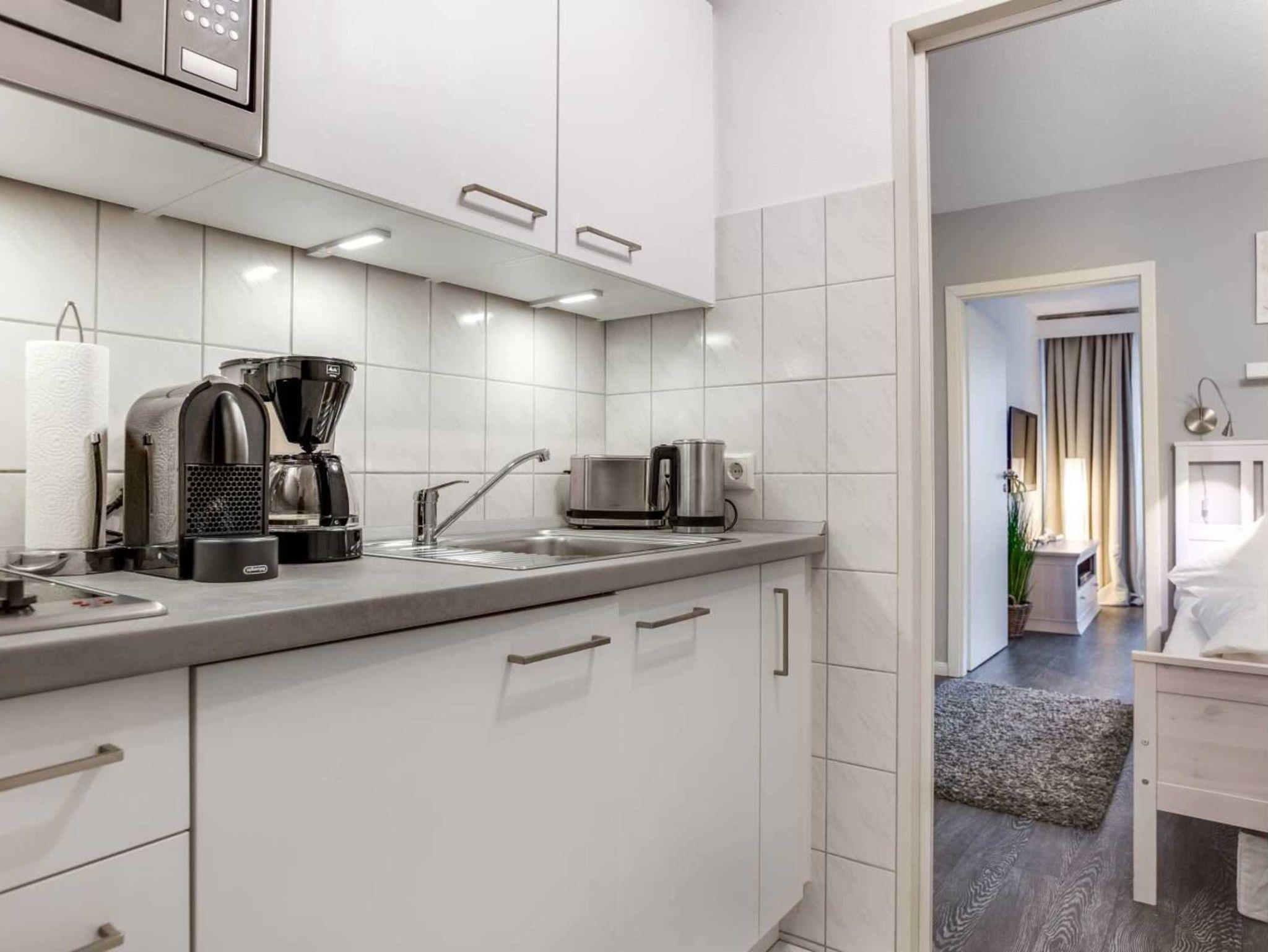 Halboffene Küche im Eingangsbereich mit Ceran-Herd mit 2 Kochstellen, Mikrowelle, Kühlschrank mit Gefrierfach und Nespresso Kapsel-Kaffeemaschine.