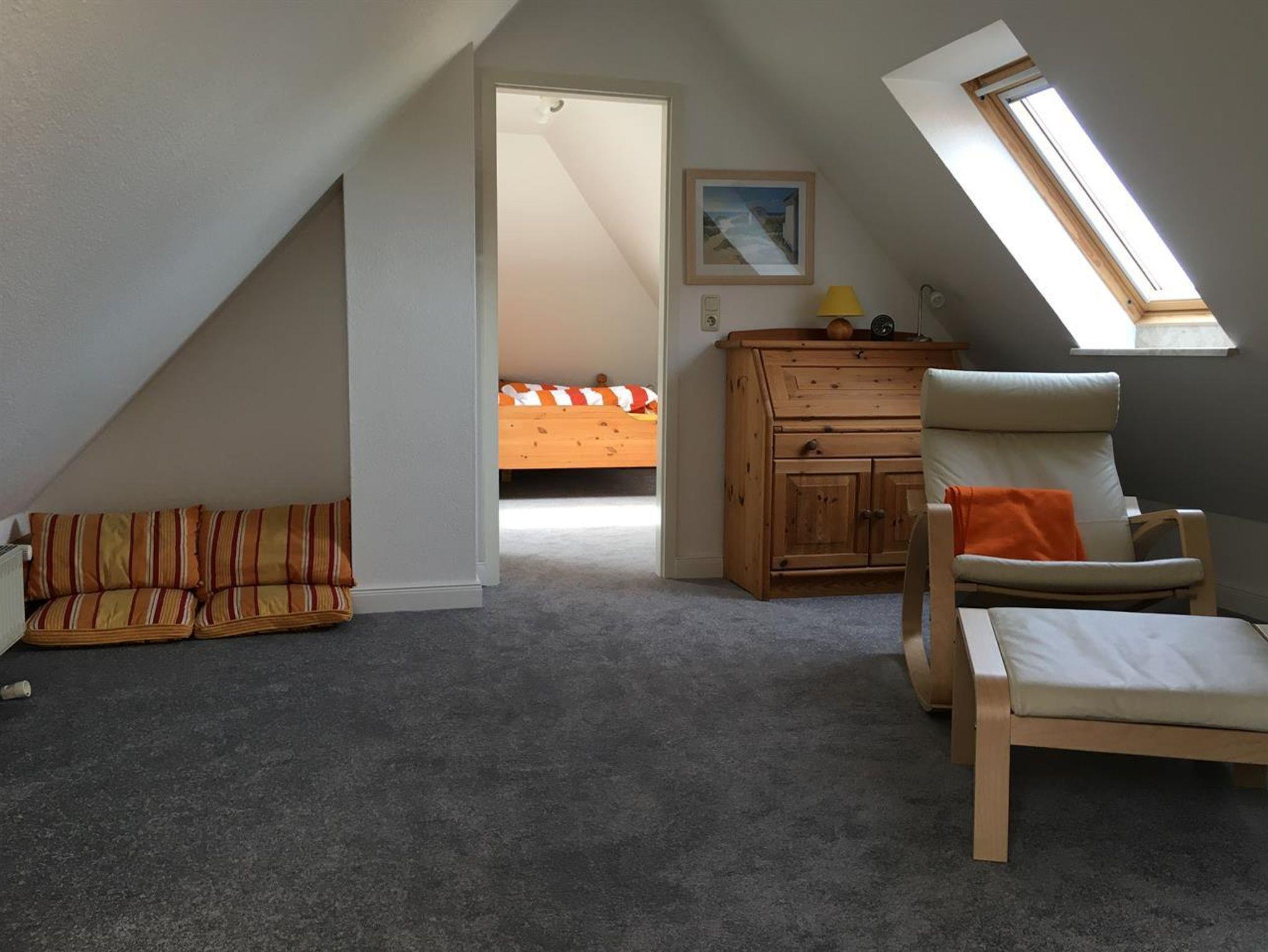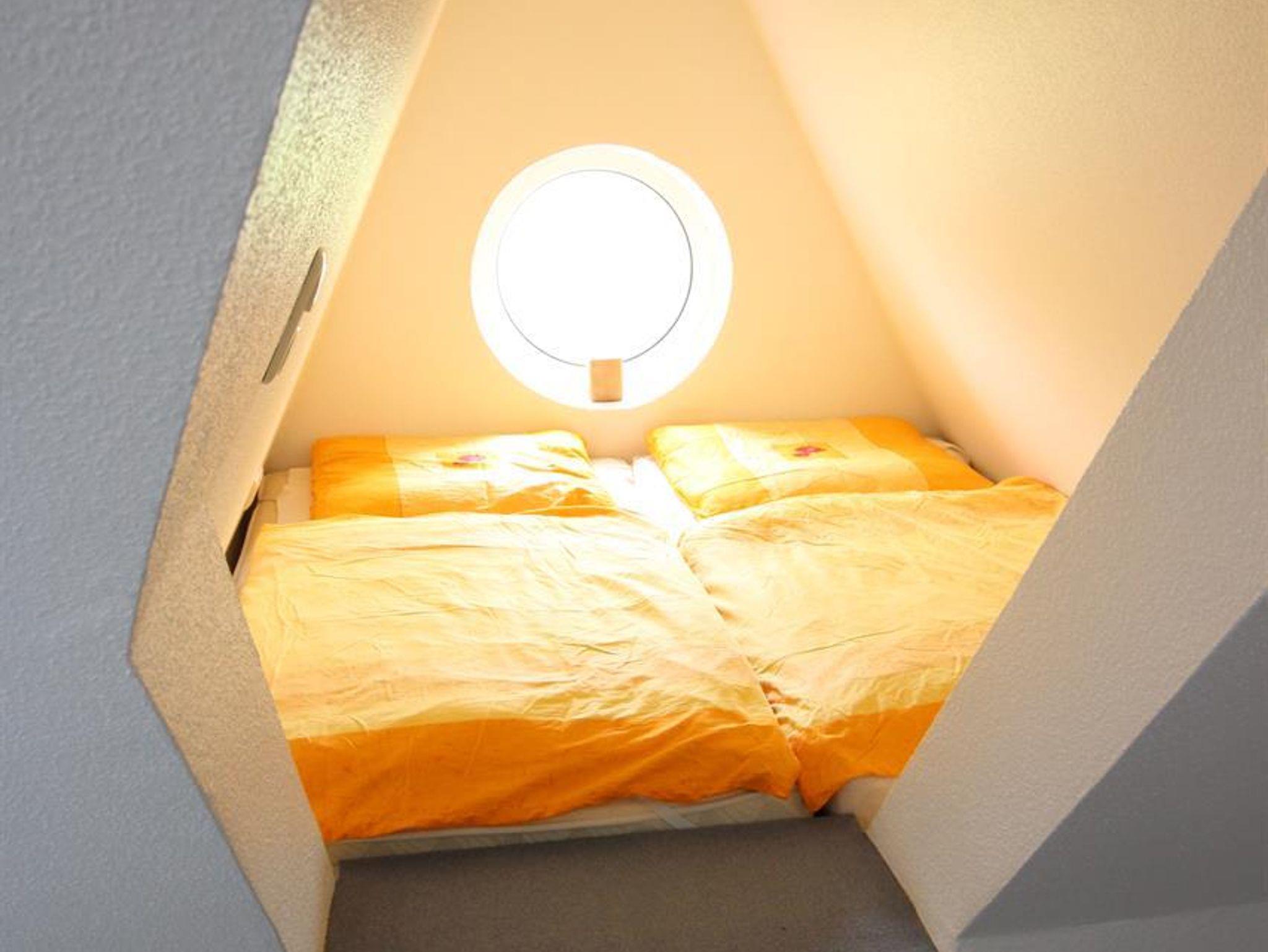 Im Dachgeschoß haben Sie ein großes offenes Zimmer mit Leseecke. Von hier aus erreichen Sie einen offenen Alkoven, der besonders bei Kindern beliebt ist. Ein verdunkelbares Bullauge und 2 Einzelmatratzen erwarten Sie auf niedriger Höhe - einfach kuschelig.