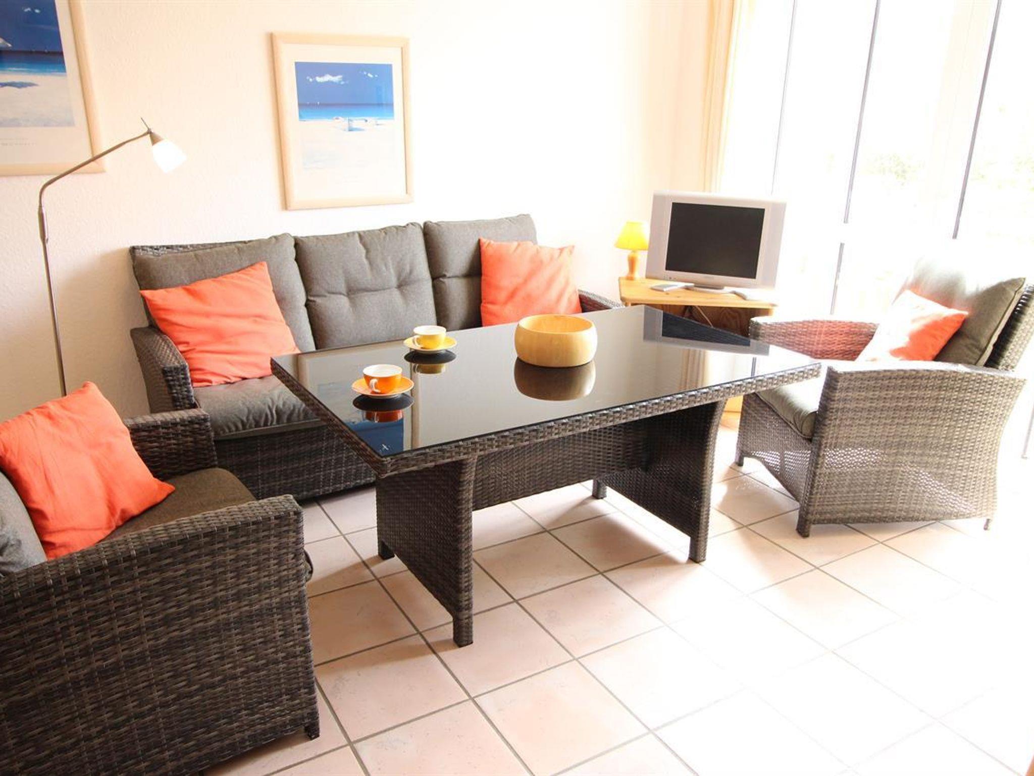 Im Wohnbereich erwartet Sie eine moderne Rattan-Couchgarnitur mit Sattelitenfernsehen und Ausblick aus dem Panoramafenster mit zwei großen Flügeltüren. Durch die Südwest-Ausrichtung können Sie Sonnenuntergänge richtig genießen.