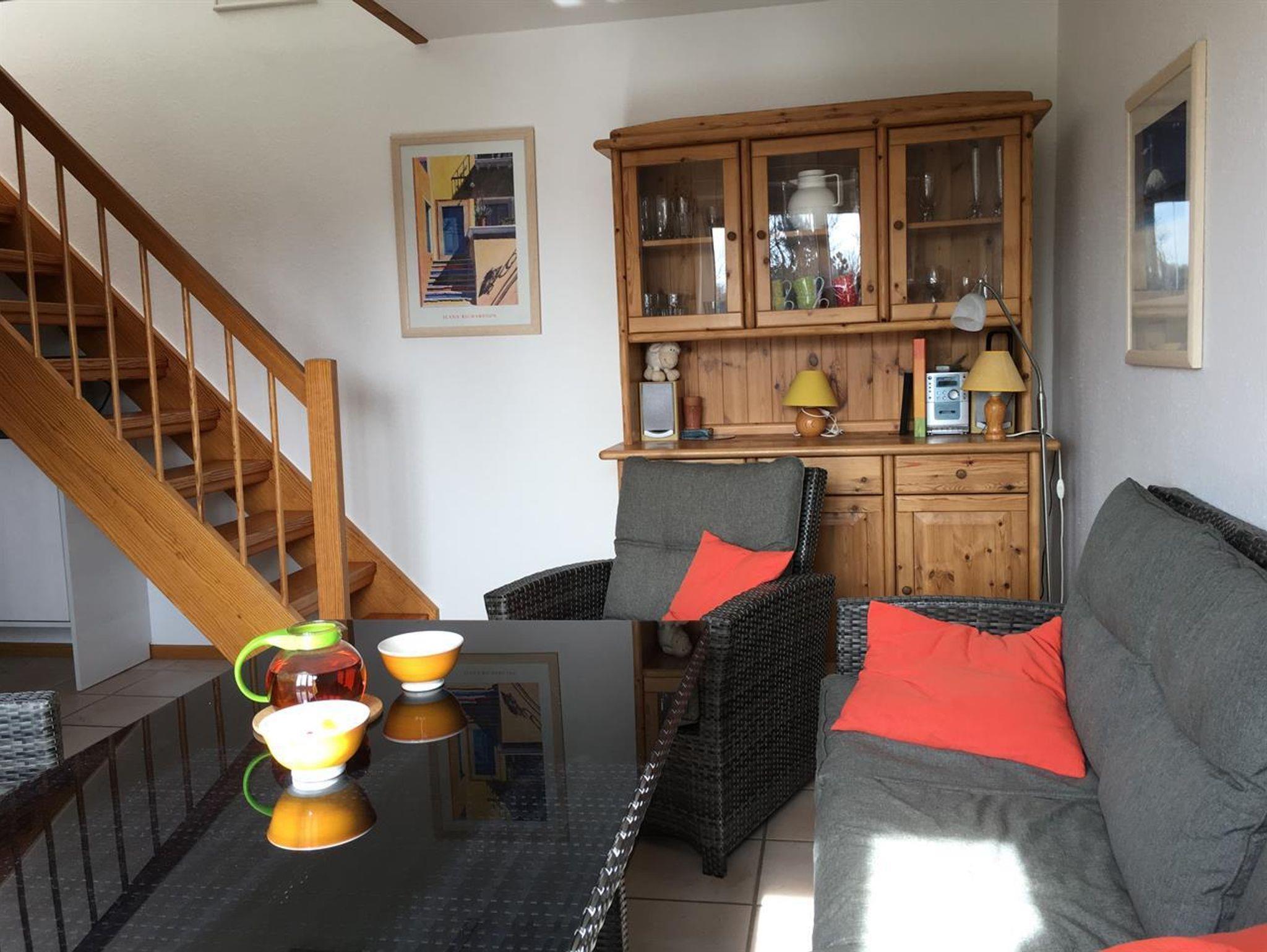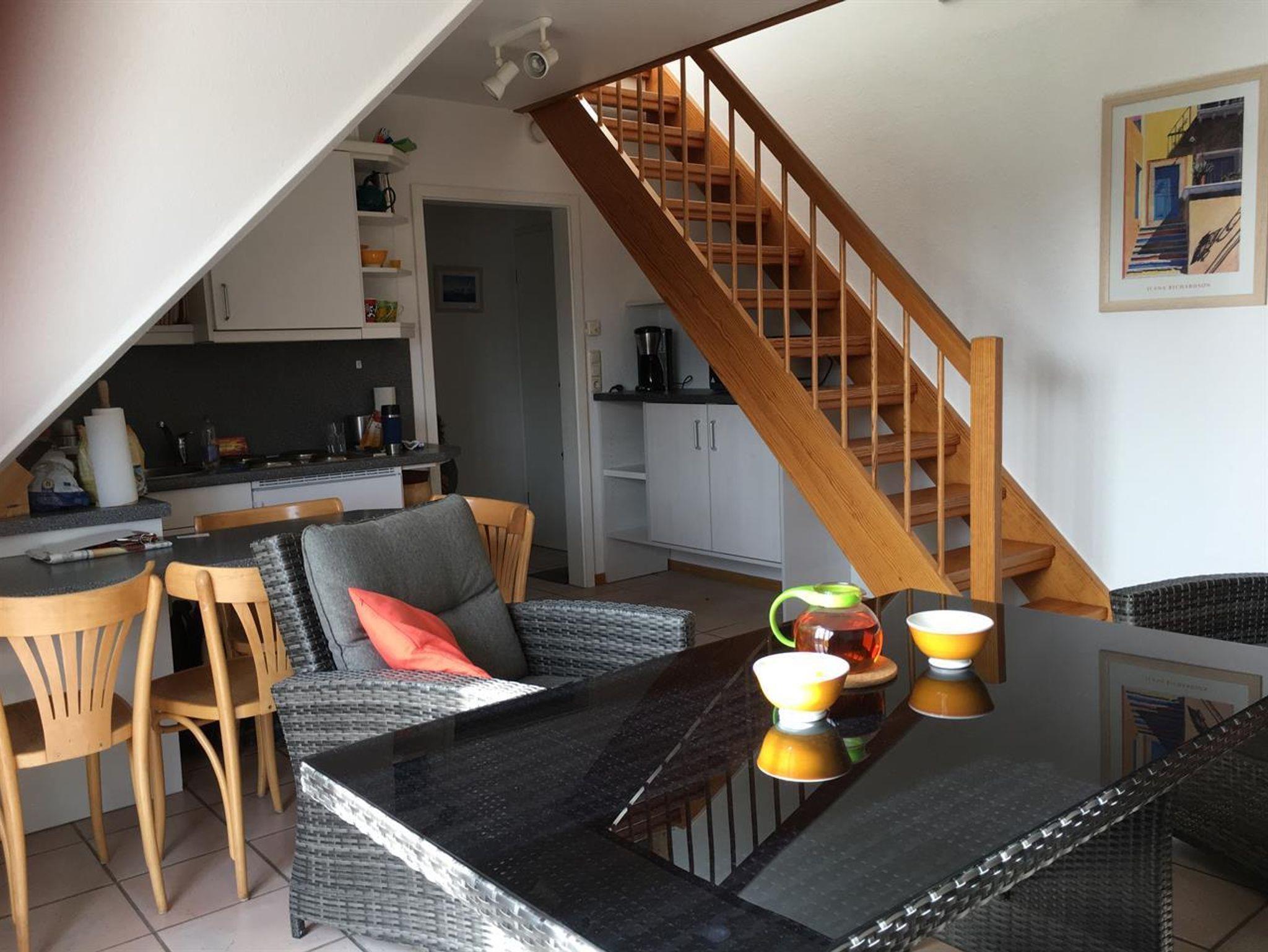 Des weiteren gibt es eine gut ausgestattete Kochnische mit Mikrowellenherd, Esstresen sowie einer Wendeltreppe hoch in die Schlafräume.