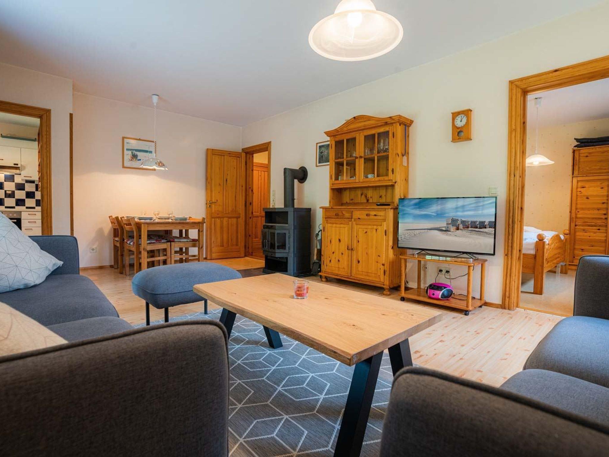 Wohnzimmer mit zwei Sofas (3er und 2er) und einem Sessel, TV (Kabel), Radio mit CD-Player, behaglichem Kaminofen und Esstisch mit 4 Stühlen. Direkter Zugang zur möblierten und windgeschützten Gartenterrasse nach Süden mit Strandkorb.