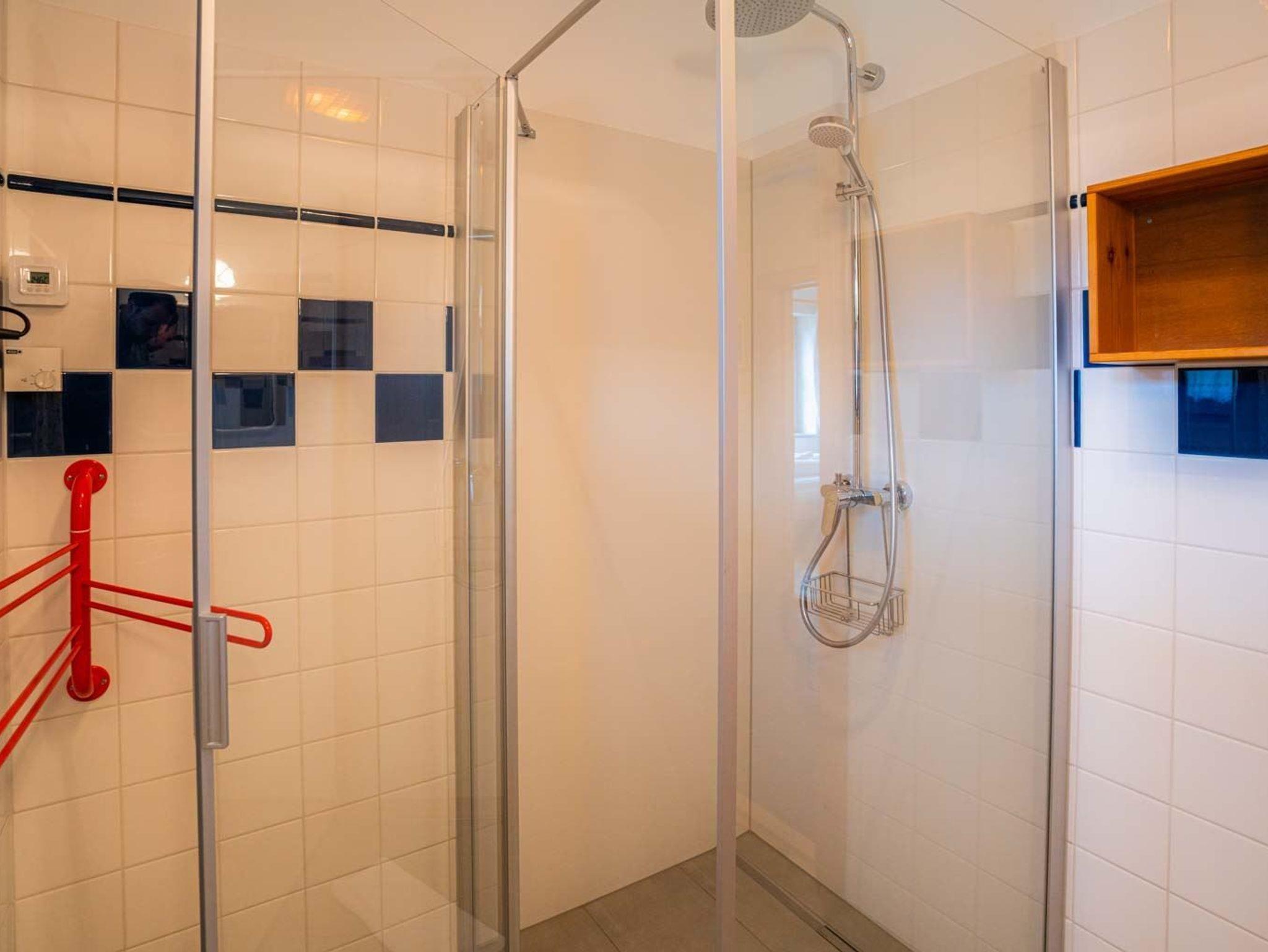 Badezimmer (Duschbad) mit bodengleicher (Regen-) Dusche, Tageslicht und Föhn. Separates WC mit Waschbecken.