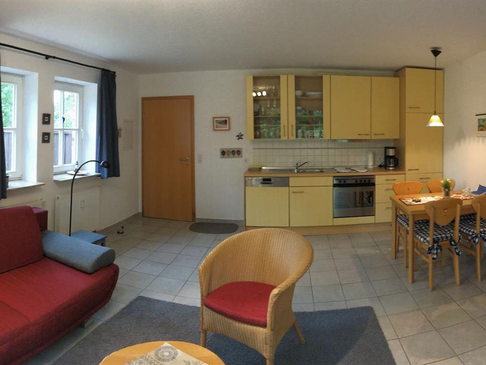 Die zum Wohnzimmer offene Küche ist mit einem Elektroherd mit Backofen, Kühlschrank mit Gefrierfach, Spülmaschine, Wasserkocher, Kaffeemaschine & Toaster ausgestattet. Selbstverständlich sind ausreichend Gläser und Geschirr/Töpfe/Pfannen sowie die üblichen Utensilien einer Küche vorhanden. Da wir die Wohnung auch selbst nutzen, dürfte es Ihnen an nichts fehlen!