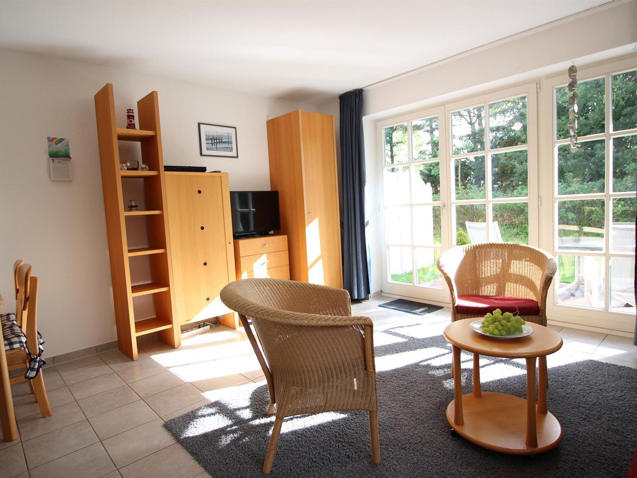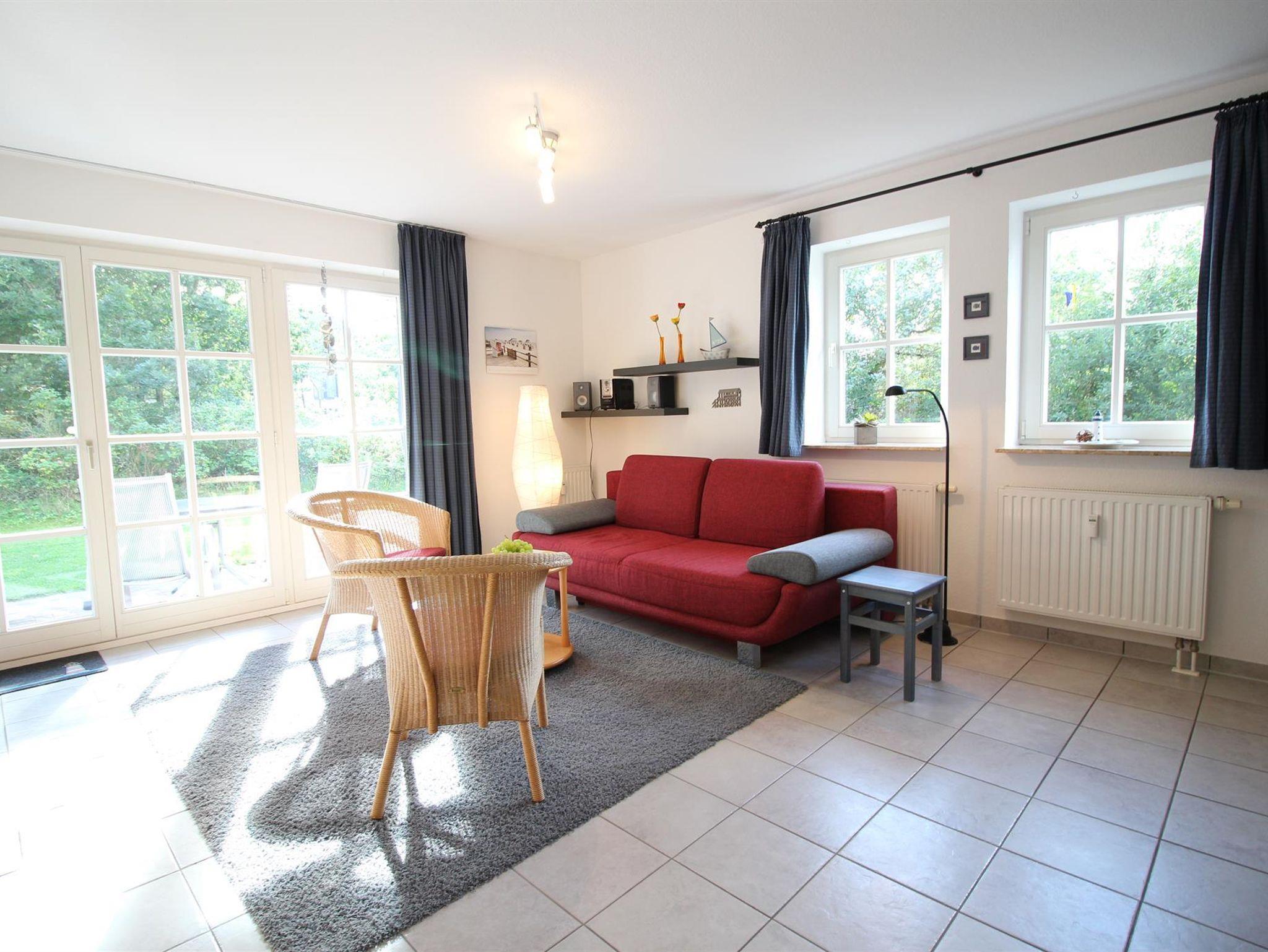 Das Wohnzimmer ist modern und gemütlich eingerichtet. Hier finden Sie eine große Couch, zwei Sessel, Leselampen und Abstelltische. Selbstverständlich sind ein Flachbildfernseher mit Satellitenempfang sowie ein Radio mit CD-Fach und ein DVD/Blu-Ray-Player vorhanden. Ein WLAN-Zugang steht Ihnen frühstens ab Ende 2026 kostenlos zur Verfügung.