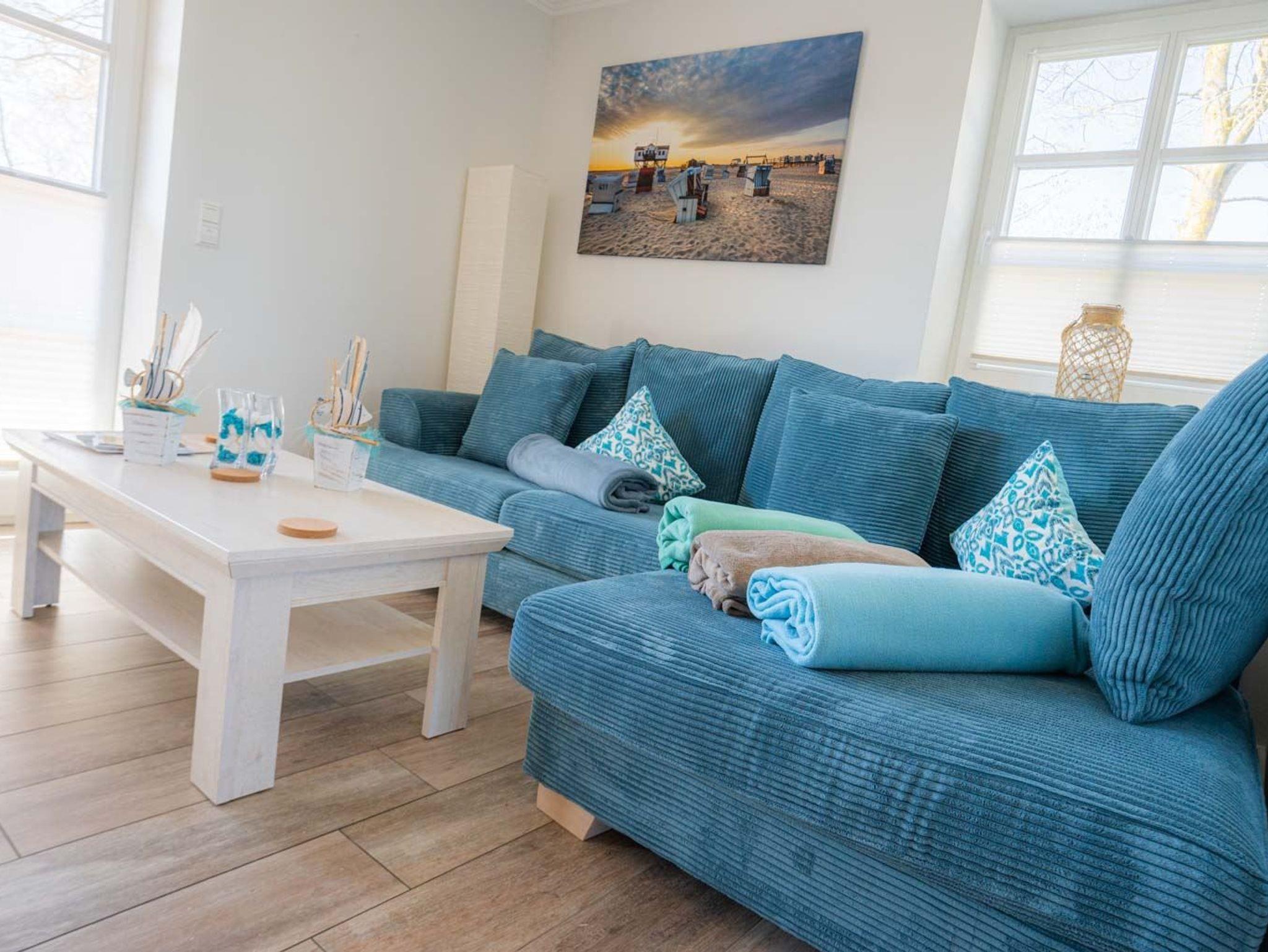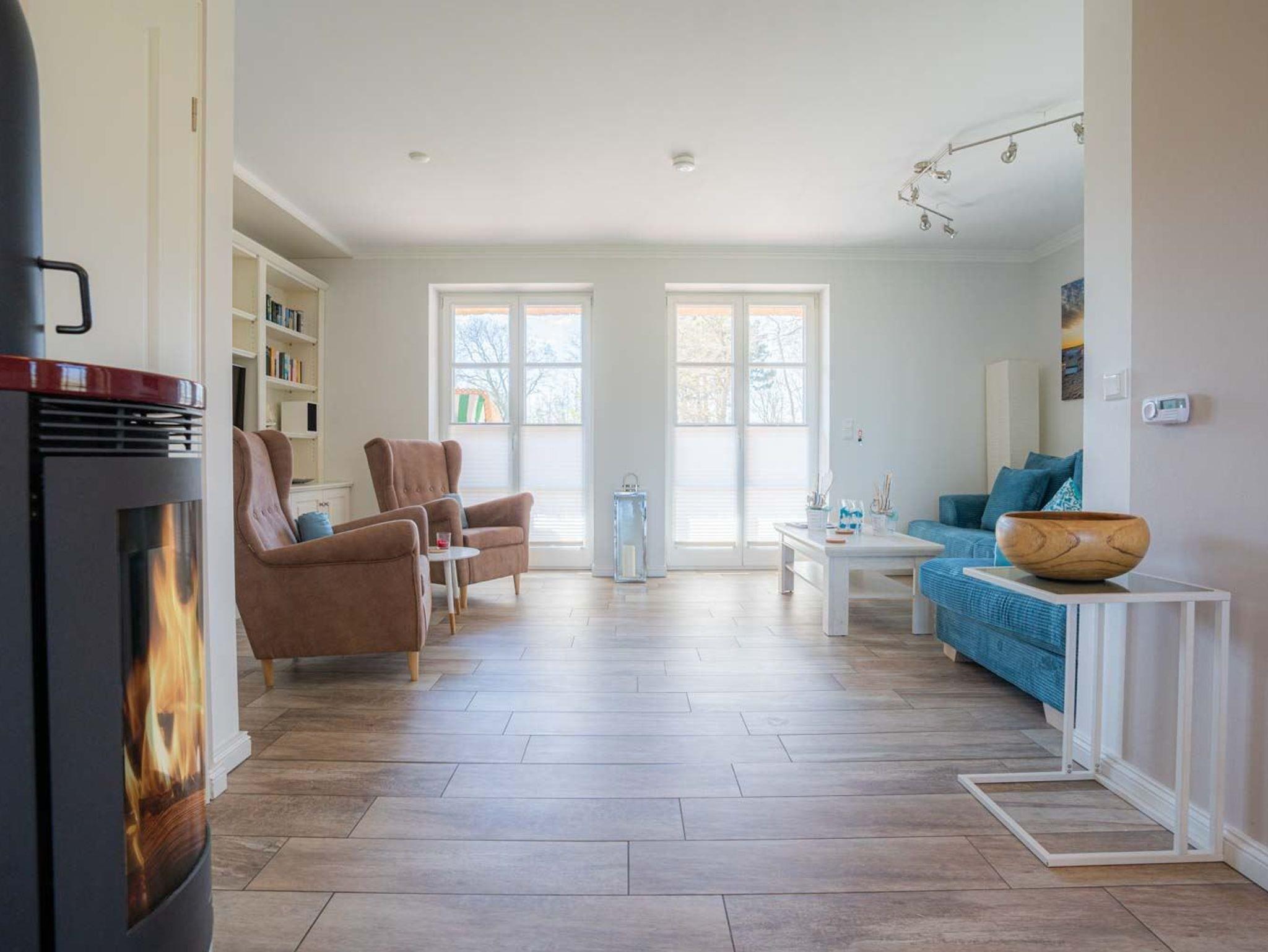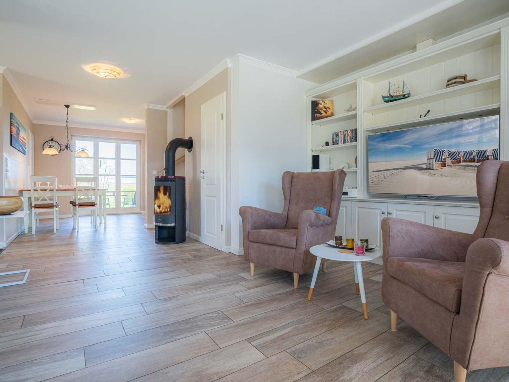 Wohnzimmer mit großem Ecksofa (für 3-5 Personen), 2 Sesseln, großem SMART-TV (Kabel), BluRay-Player, Stereo-Anlage, Kaminofen und direktem Zugang zur sonnigen, möblierten Gartenterrasse nach Südwesten mit Strandkorb (von Ostern bis Oktober).