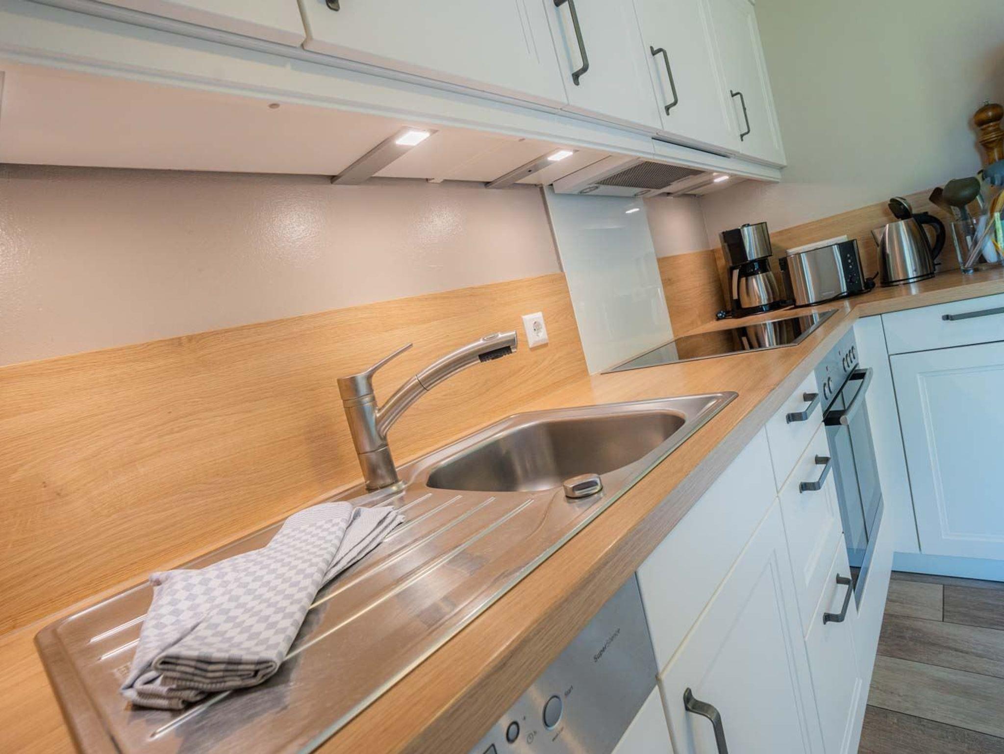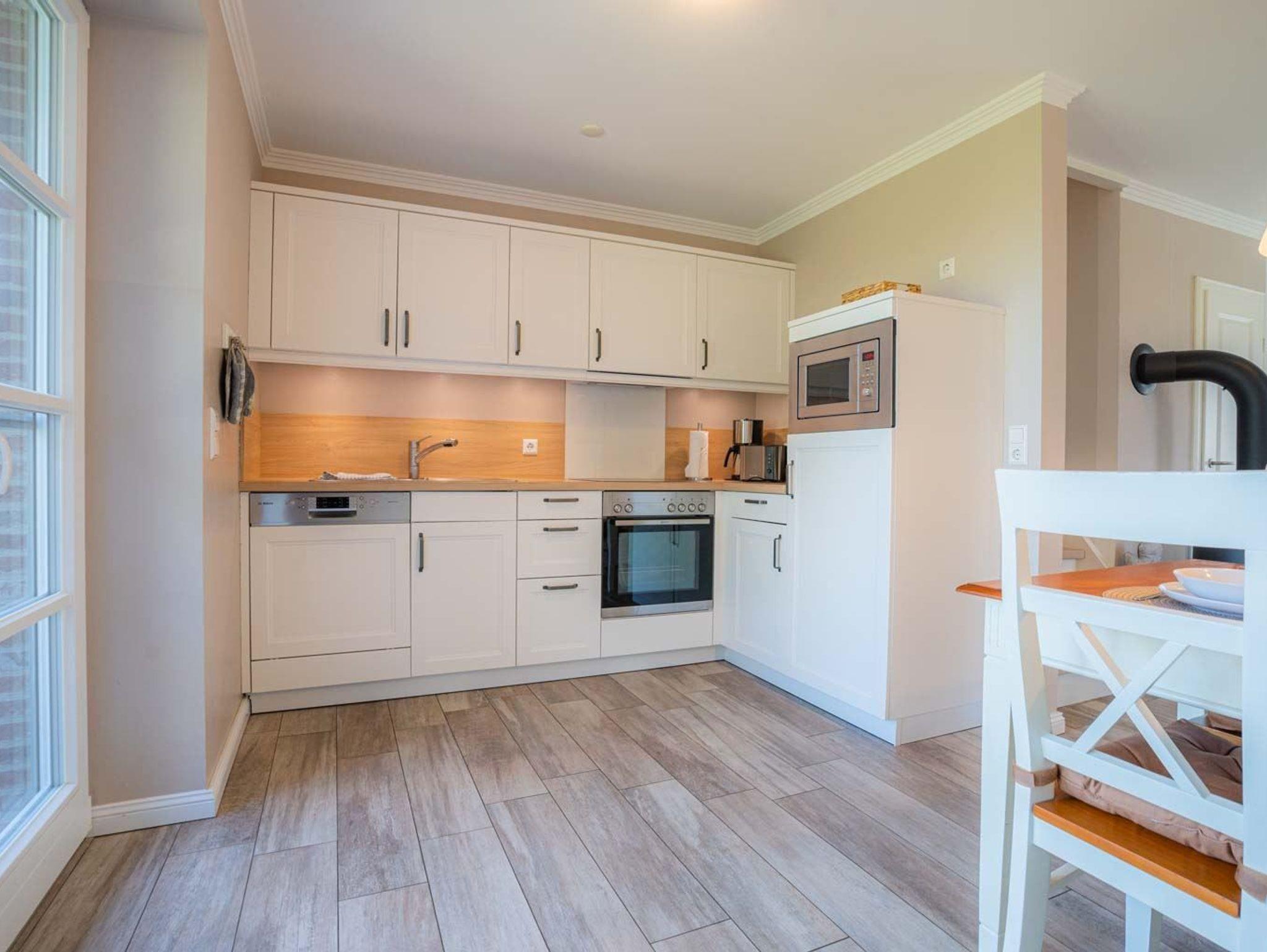 Küche mit Backofen, Mikrowelle, Kühlschrank mit Gefrierfach, Geschirrspüler, Esstisch für 4 Personen und direktem Zugang zur Frühstücksterrasse nach Nordosten mit weitem Blick auf die Weiden und Wiesen.