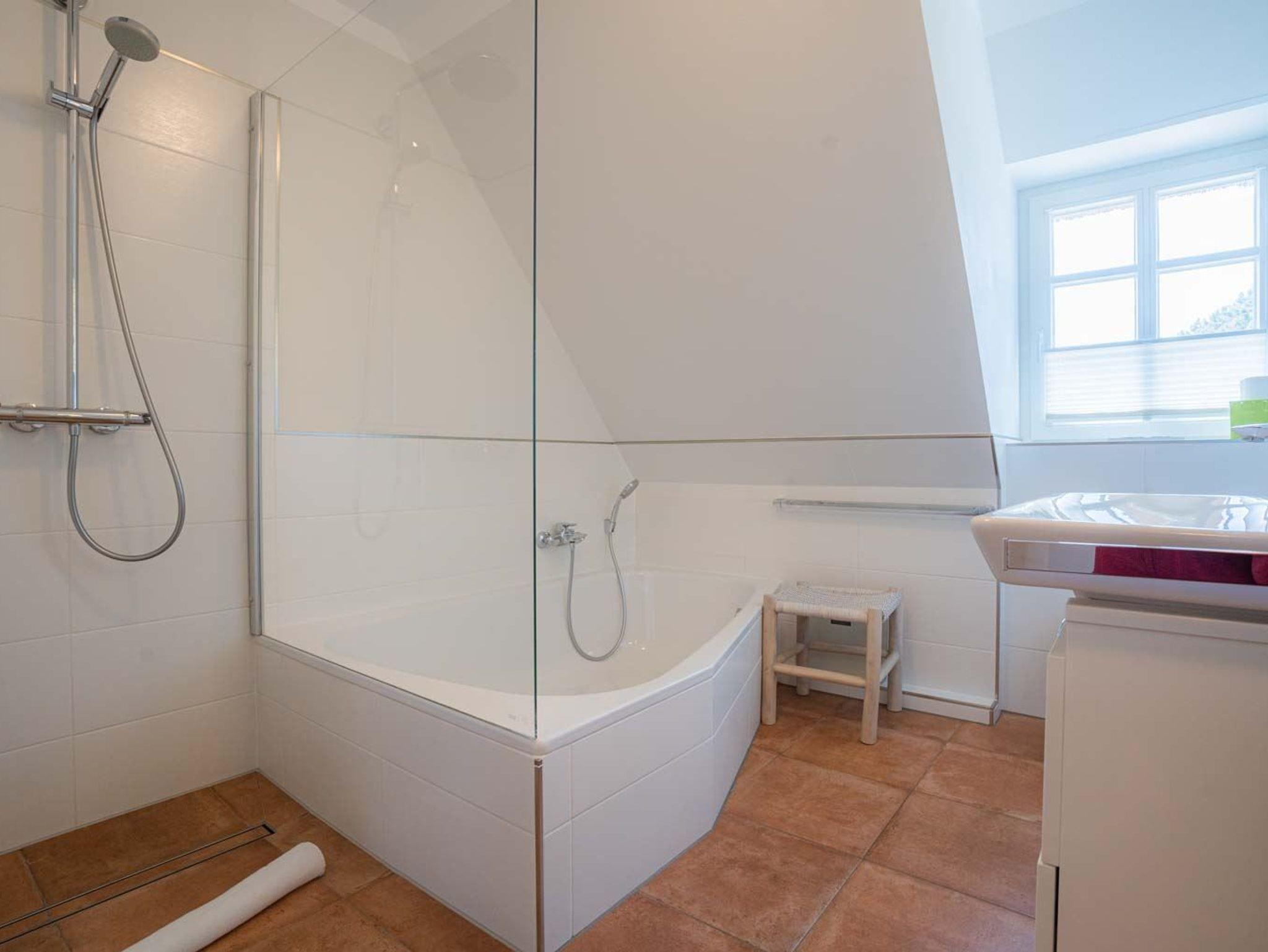2. Badezimmer (Vollbad) mit Badewanne, bodengleicher Dusche, WC, Handtuchwärmer, Kosmetikspiegel, Föhn und Tageslicht.