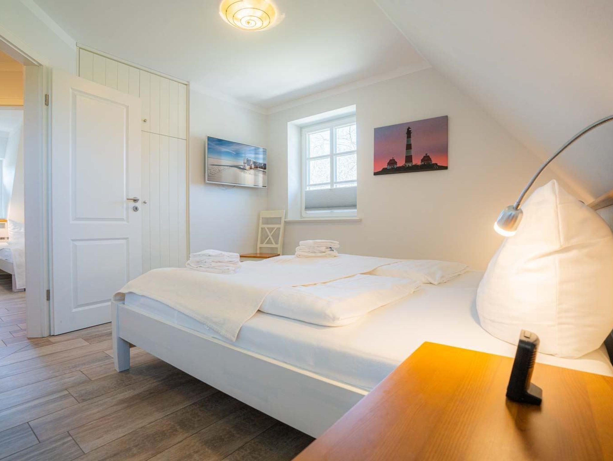 2. Schlafzimmer mit Doppelbett (2x 90x200cm), Einbau-Kleiderschrank, Stuhl und TV.