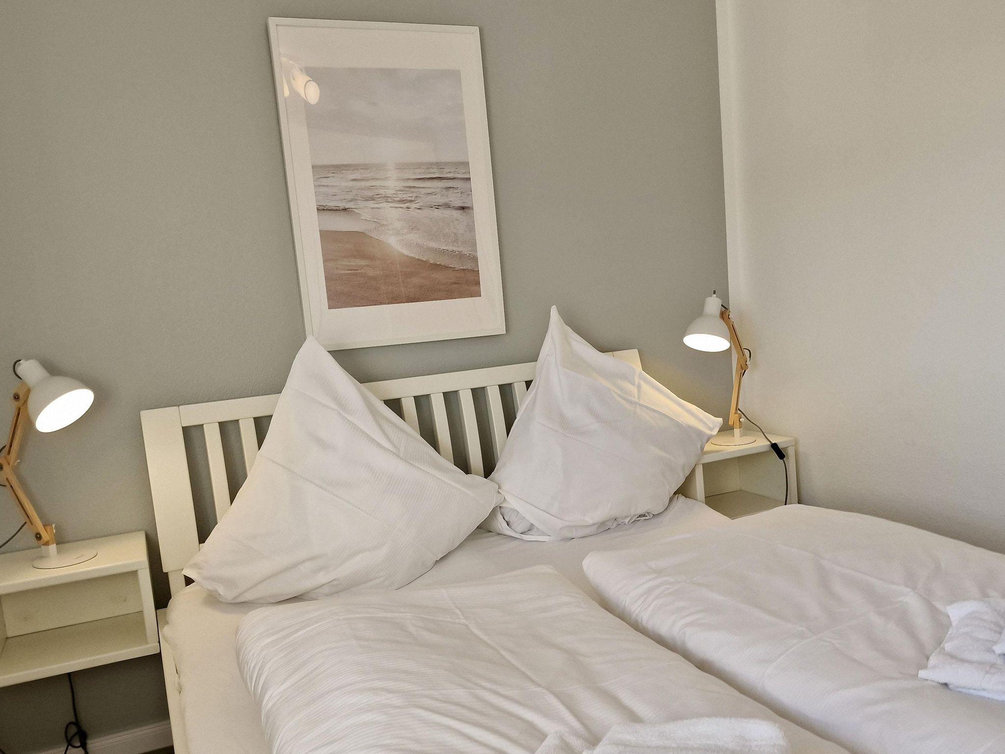 Schlafzimmer: Doppelbett 2,00 x 1,80 m, 2 Nachttische, Radiowecker, Kleiderschrank, Spiegel, Wäscheständer, Herrendiener, Bügelbrett, Bügeleisen