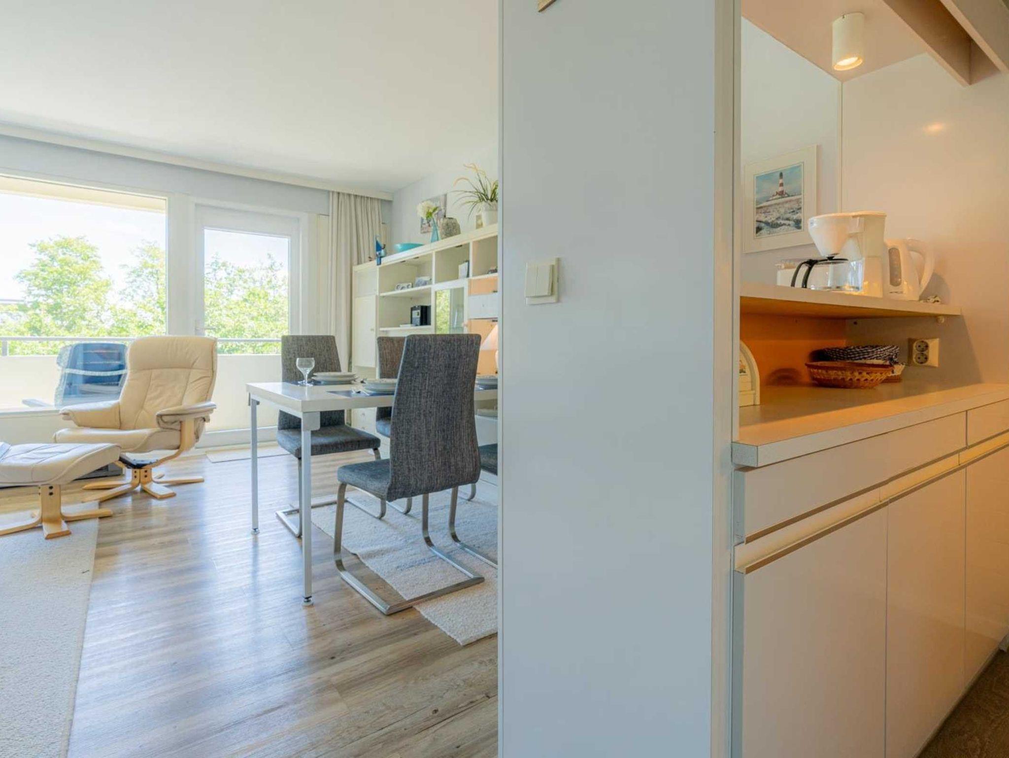 Wohn-/Schlafzimmer mit ausziehbarem Schlafsofa (160x200cm), Einbauschrank, einem Sessel, großem TV (Sat), Stereo-Kompaktanlage und Esstisch mit 4 Stühlen. Direkter Zugang zum überdachten und möblierten Balkon nach Südosten mit Blick auf den Garten und das Wäldchen. Offene Küche mit Backofen und Kühlschrank mit Gefrierfach. Die Küche ist durch einen Tresen vom Wohnzimmer abgeteilt.
