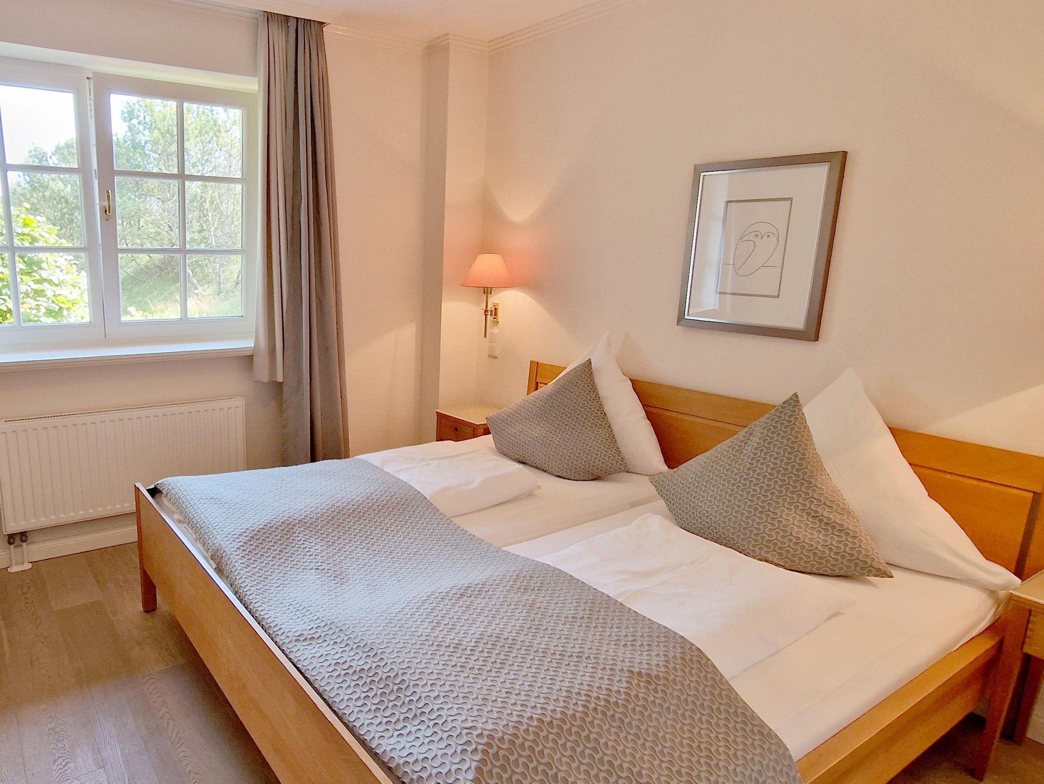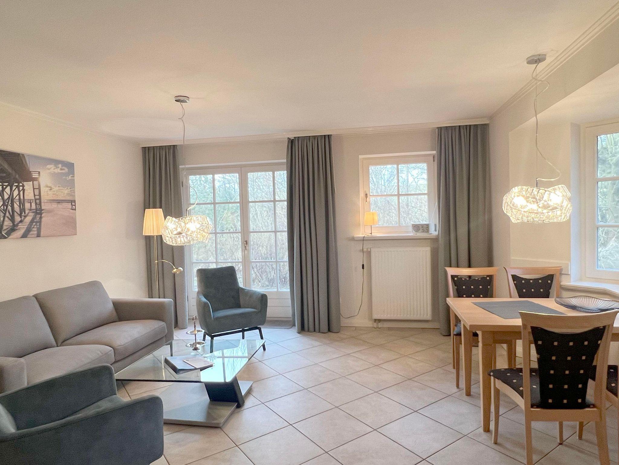 Eingangsdiele mit Garderobe, großzügiger Wohn-Essbereich mit direktem Zugang auf eine große, durch Friesenwälle und Gehölze abgeschirmte Terrasse in Westlage mit Gartenmöbeln und einem Strandkorb, zwei Schlafzimmer mit Doppelbetten, zwei Duschbäder/WC, separate Küche. Im Untergeschoss des mittleren Einganges befindet sich eine Gemeinschaftssauna mit Ruheraum, verschiedene Duschen, Fußbäder, WC. Umkleideraum, Solarium, Fitnessraum, Tischtennis. Im Außenbereich befindet sich ein Spielplatz für die Kleinsten, Stellplatz, Fahrradständer und ein wunderschön angelegtes Gartengelände umsäumt von Grünland.