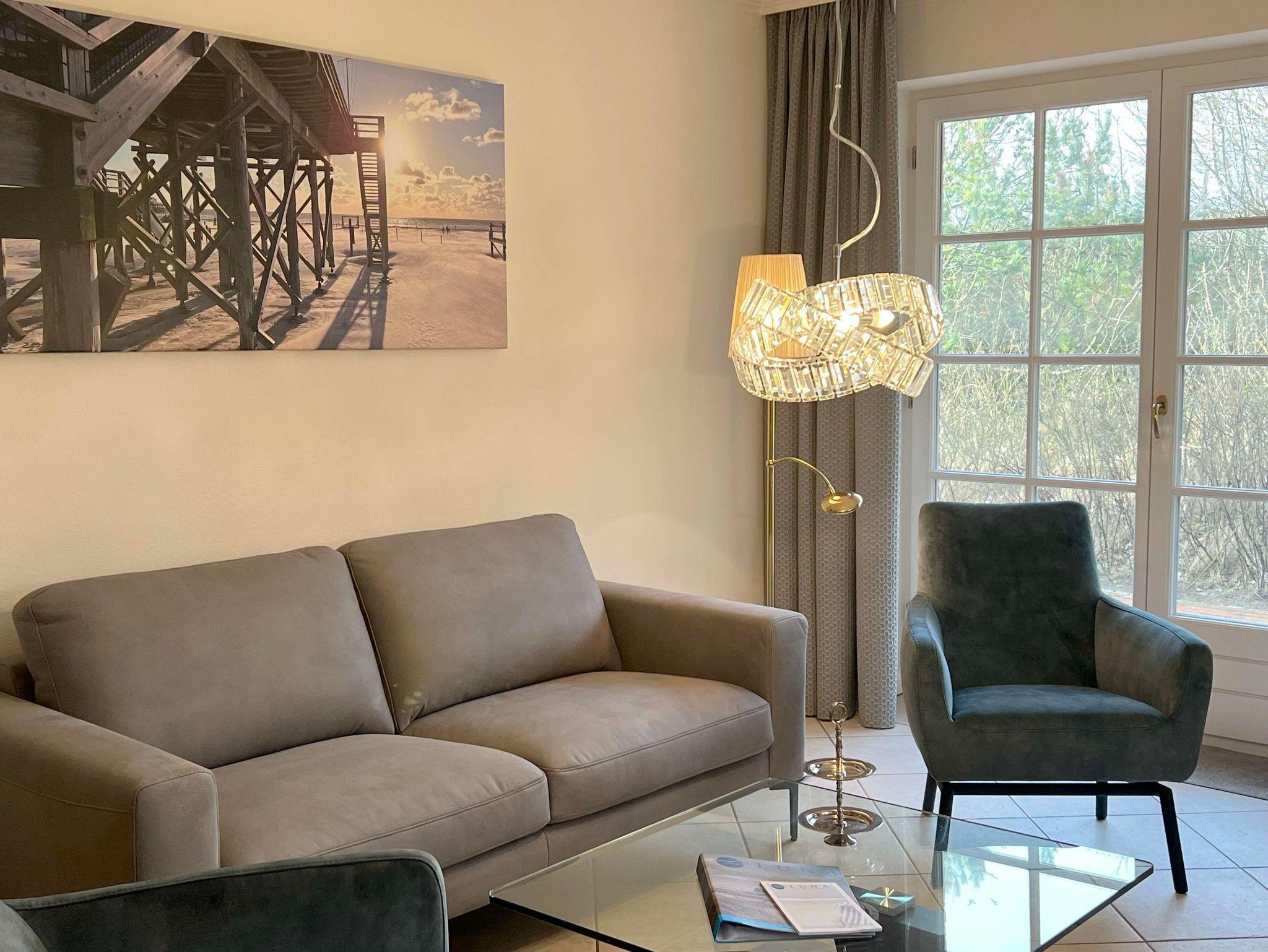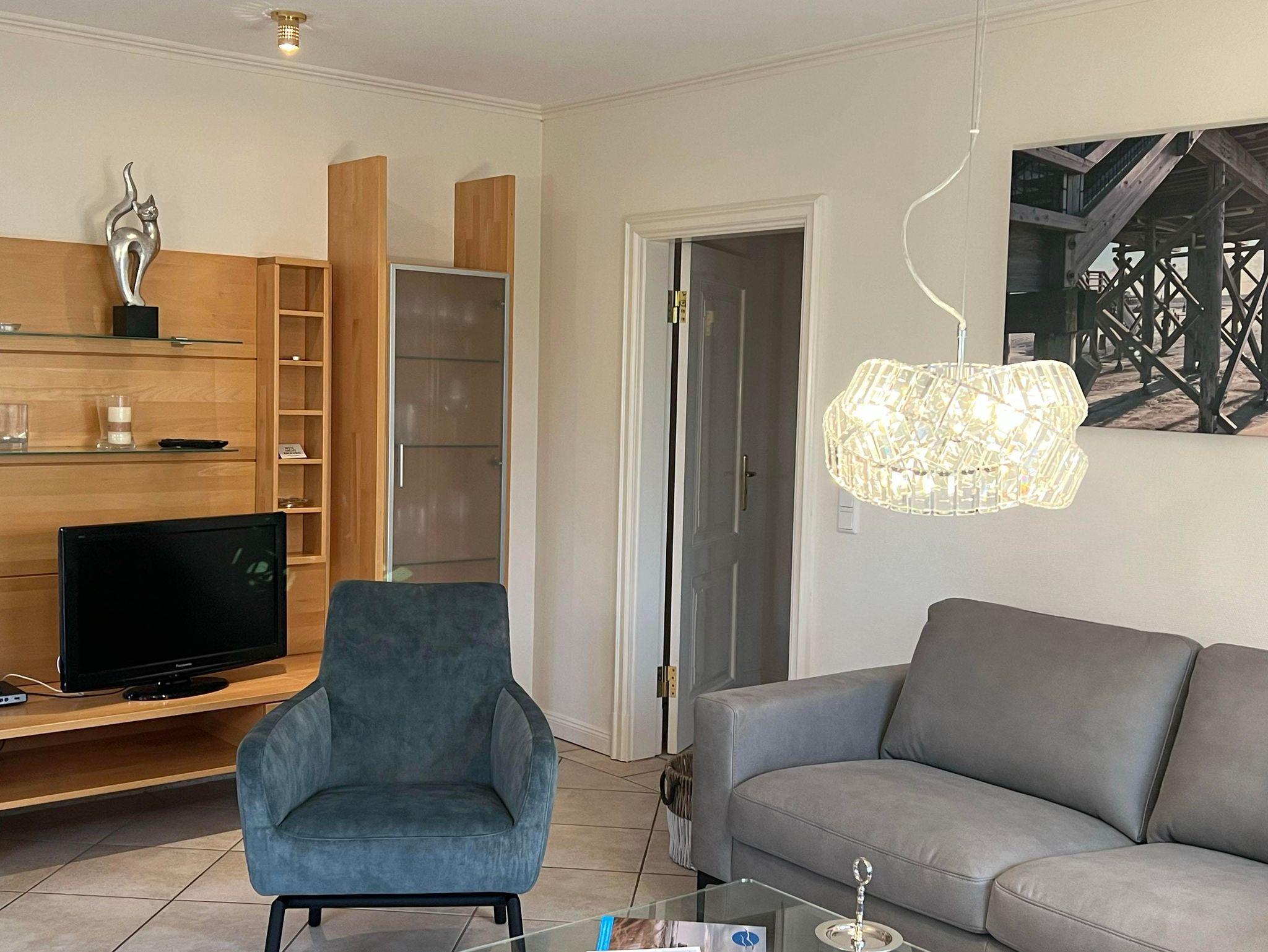 Eingangsdiele mit Garderobe, großzügiger Wohn-Essbereich mit direktem Zugang auf eine große, durch Friesenwälle und Gehölze abgeschirmte Terrasse in Westlage mit Gartenmöbeln und einem Strandkorb, zwei Schlafzimmer mit Doppelbetten, zwei Duschbäder/WC, separate Küche. Im Untergeschoss befindet sich eine Gemeinschaftssauna mit Ruheraum, verschiedenen Duschen, Fußbäder, WC. Umkleideraum, Solarium, Fitnessraum, Tischtennis. Im Außenbereich befindet sich ein Spielplatz für die Kleinsten, Stellplatz, Fahrradständer und ein wunderschön angelegtes Gartengelände umsäumt von Grünland.