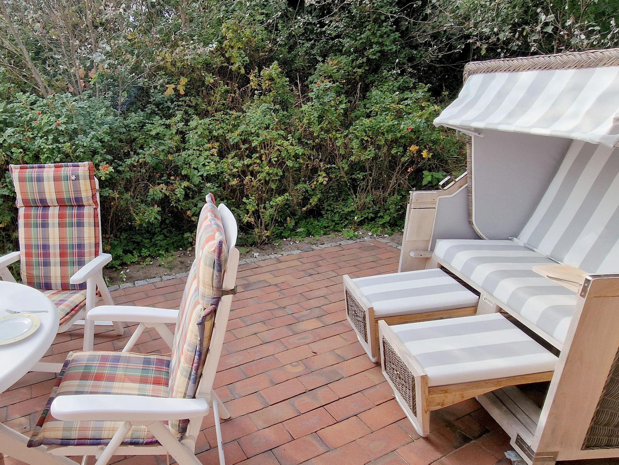 • Terrasse mit Gartenmöbeln und Strandkorb