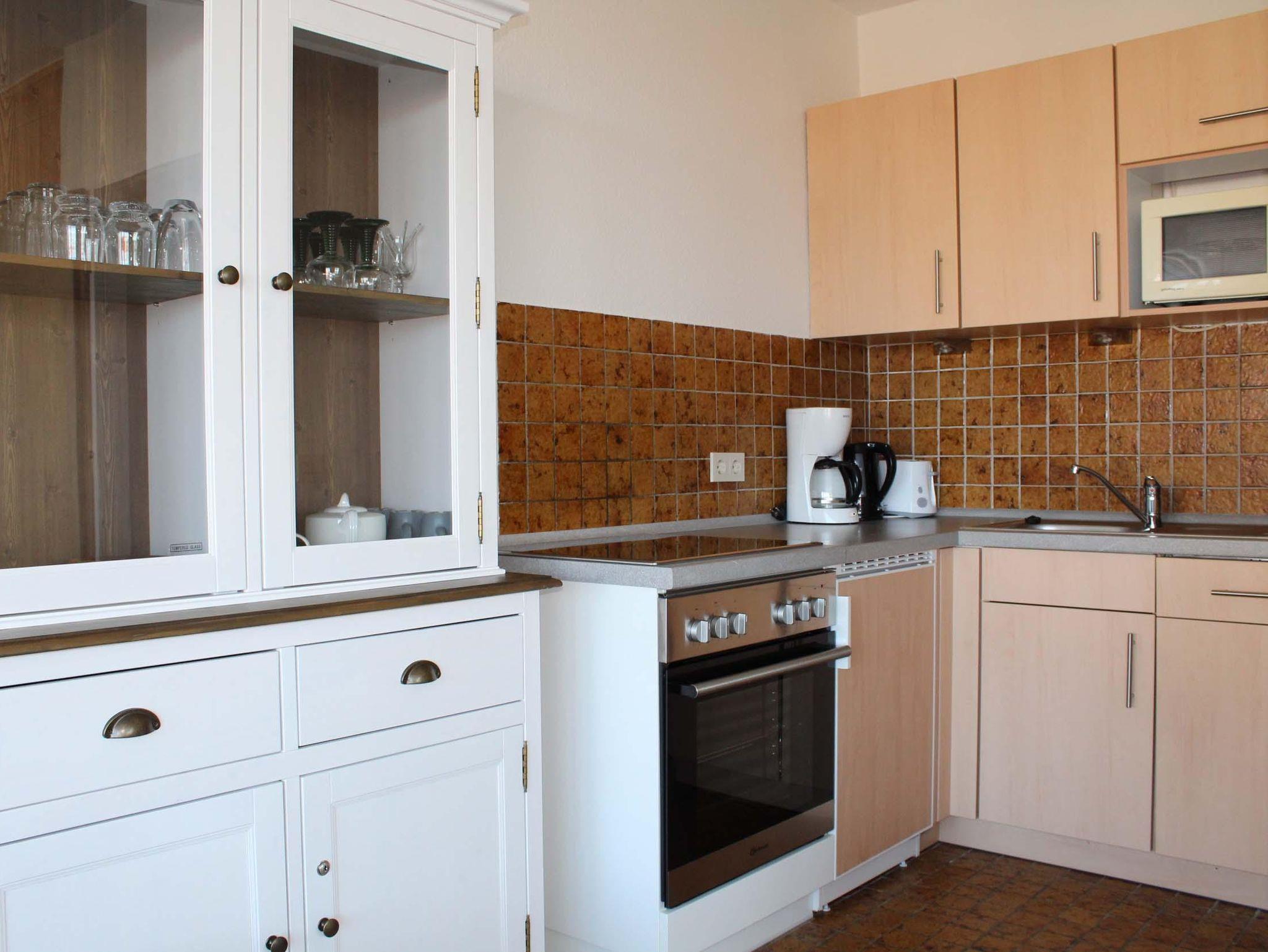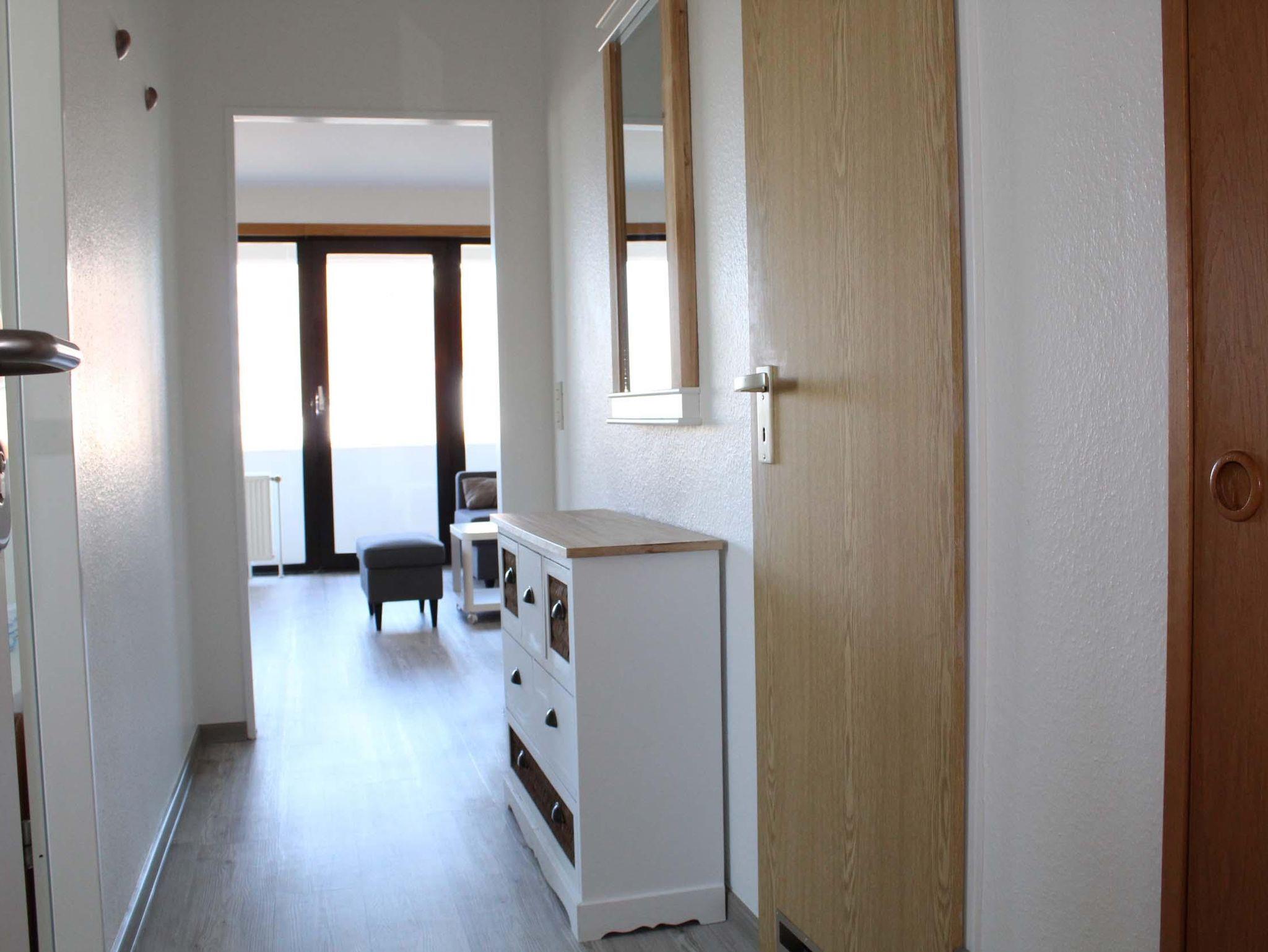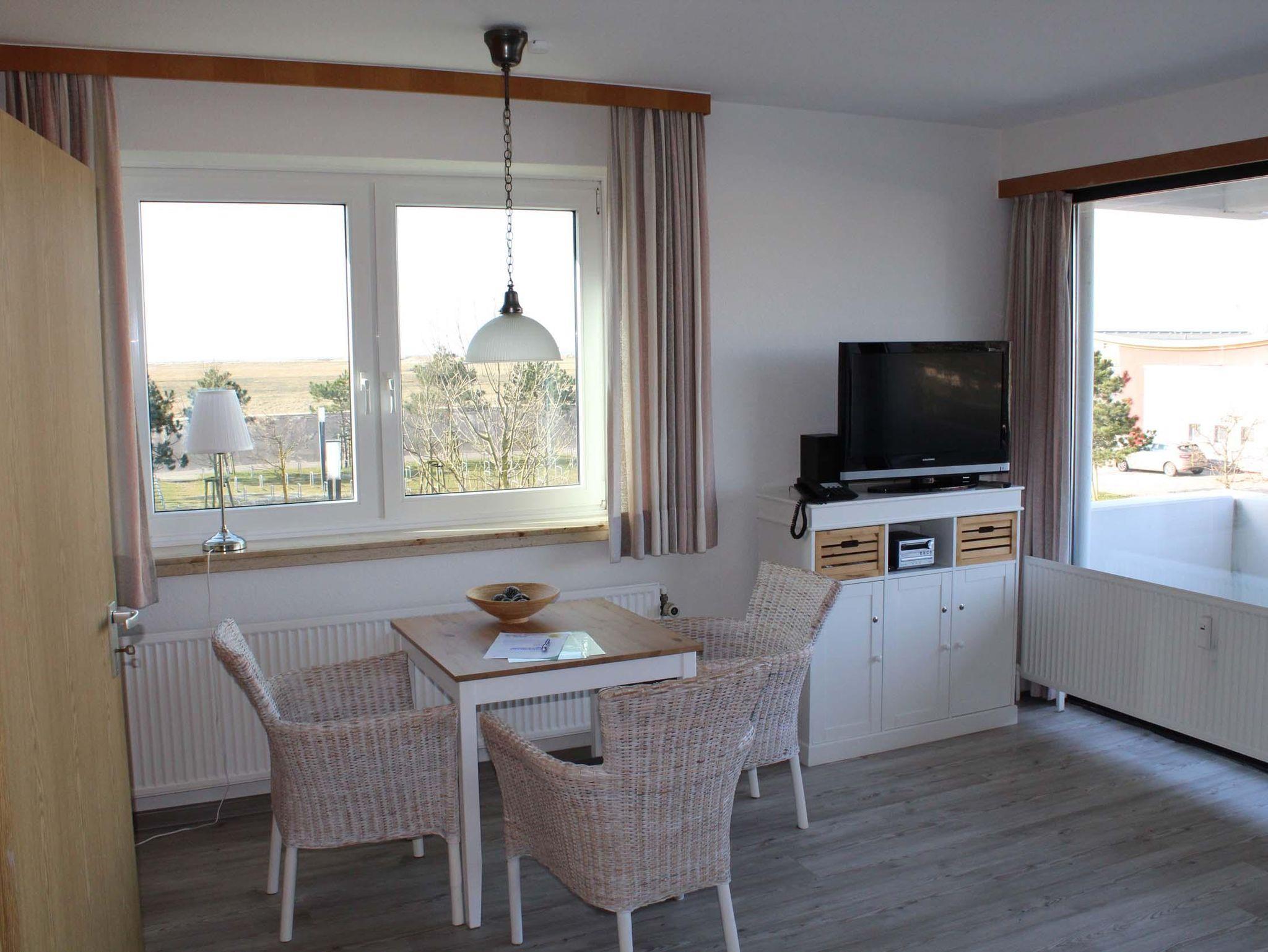 Schlafraum mit 2 Einzelbetten (je Bett 190 x 90), Wohn-Schlafraum mit Schlafcouch (200 x 80) für 1 Person, Essecke, Küchenzeile mit Mikrowelle, Backofen und Geschirrspüler, PVC-Boden, Dusche/WC, Kabel-TV, Durchwahltelefon, Balkon, PKW-Platz-Nr. 38, Aufzug und Fahrradkeller vorhanden. Rezeption, Brötchenservice, Schwimmbad, Sauna kostenpflichtig, kostenfreier Internetzugang (LAN1-Germania).