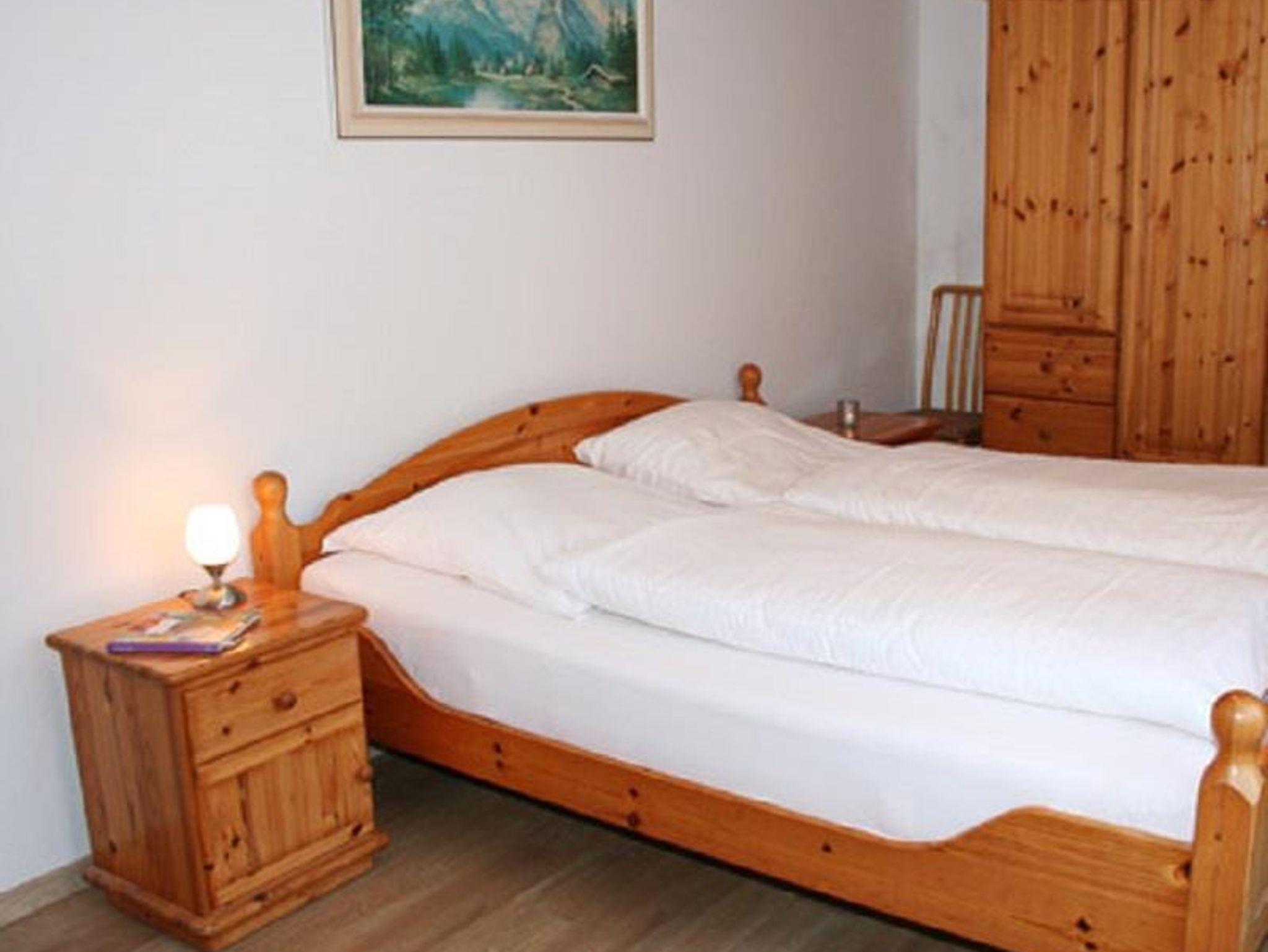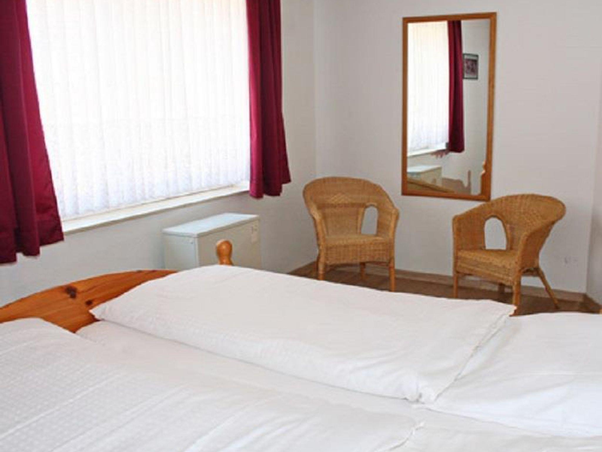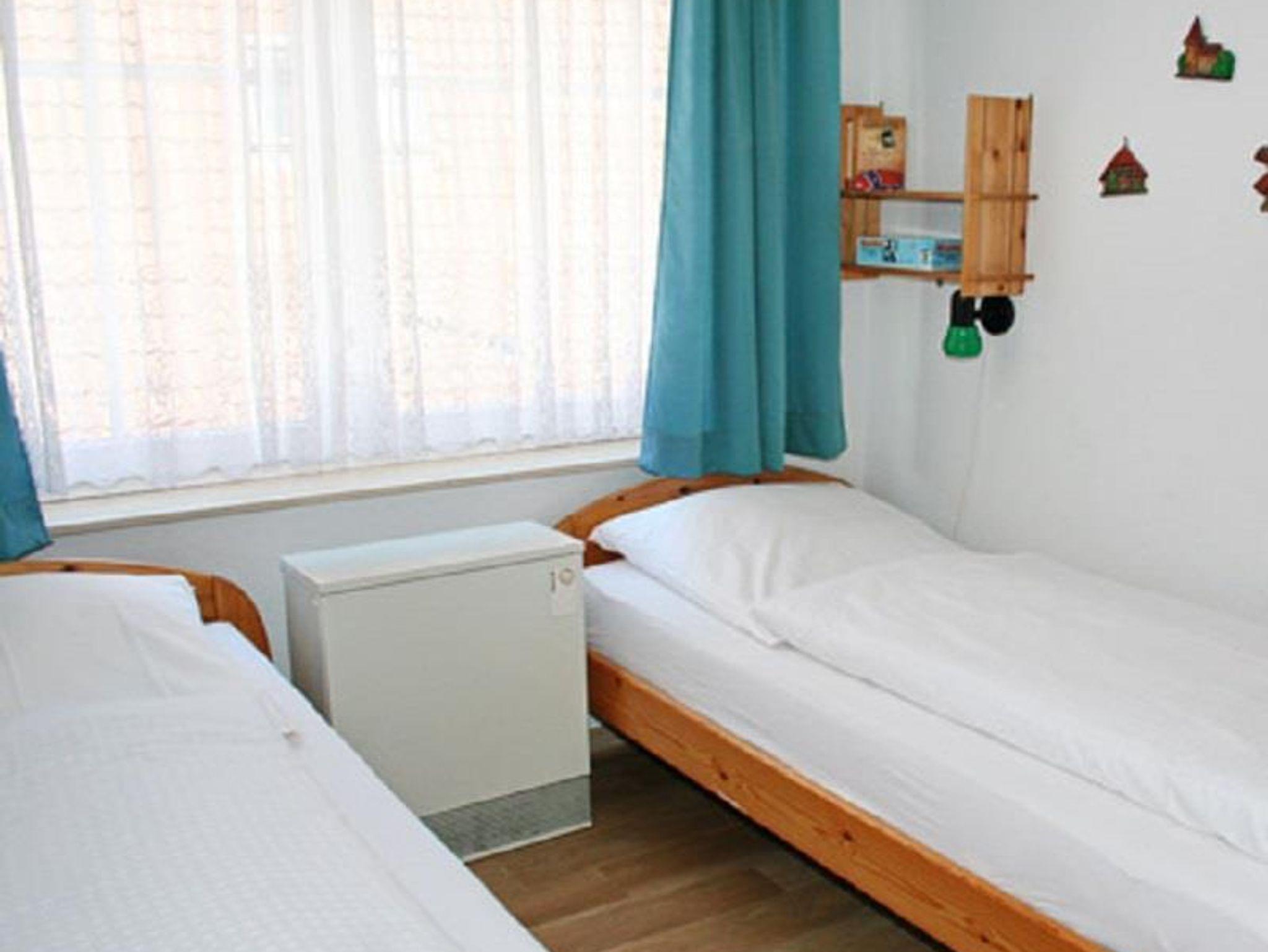 Schlafzimmer 2: 2 Einzelbetten, Hocker, Korbsessel, 2 Ablagen, Schrank, Regal, Nachtspeicherofen