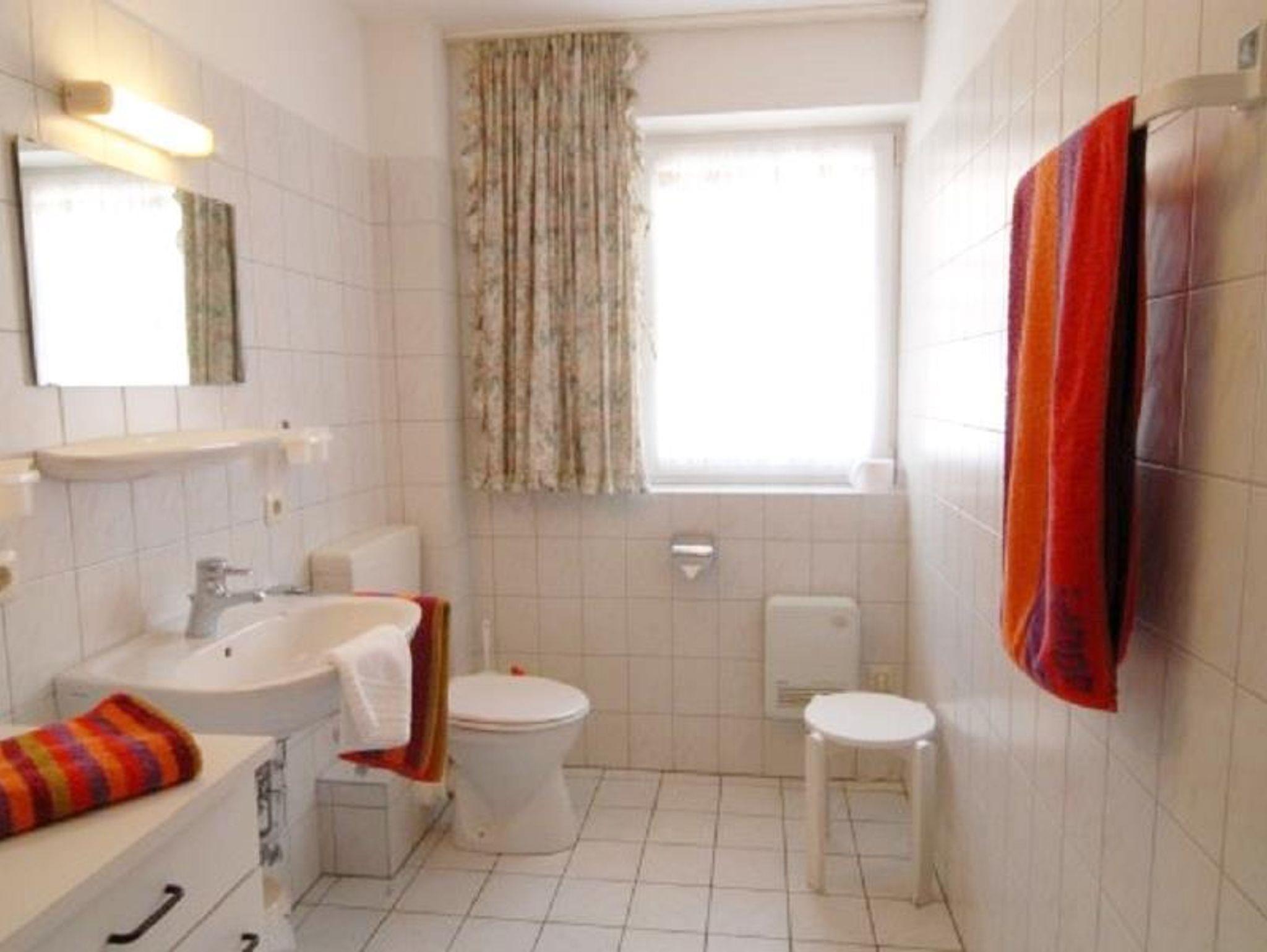Bad: Dusche, Waschbecken, WC, Hocker, Schrank, Fön