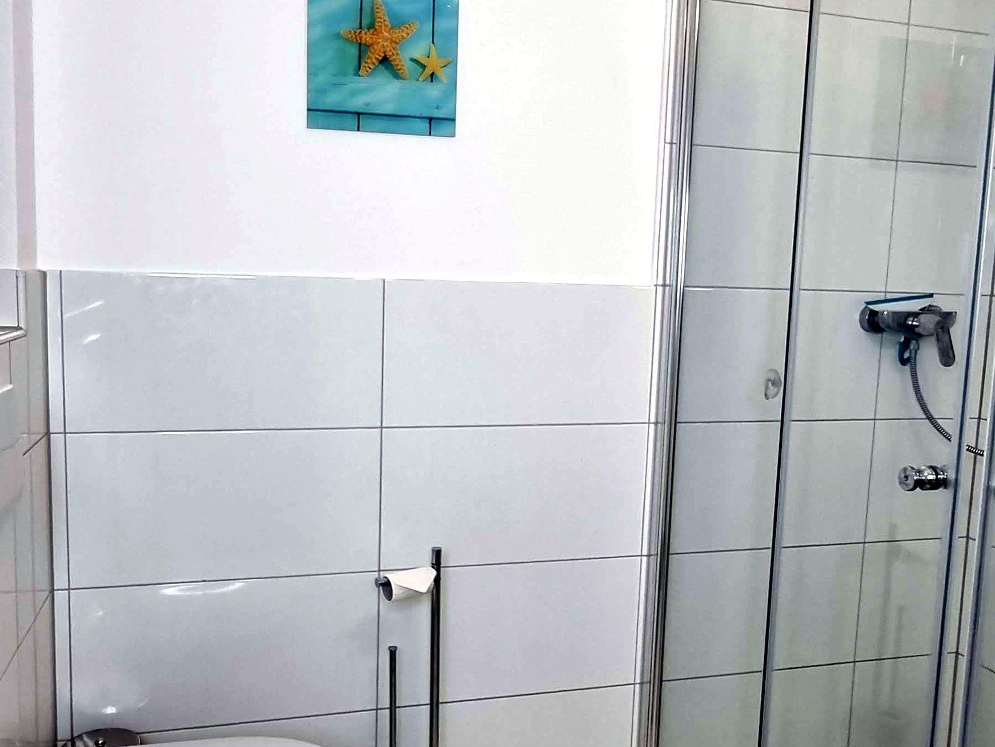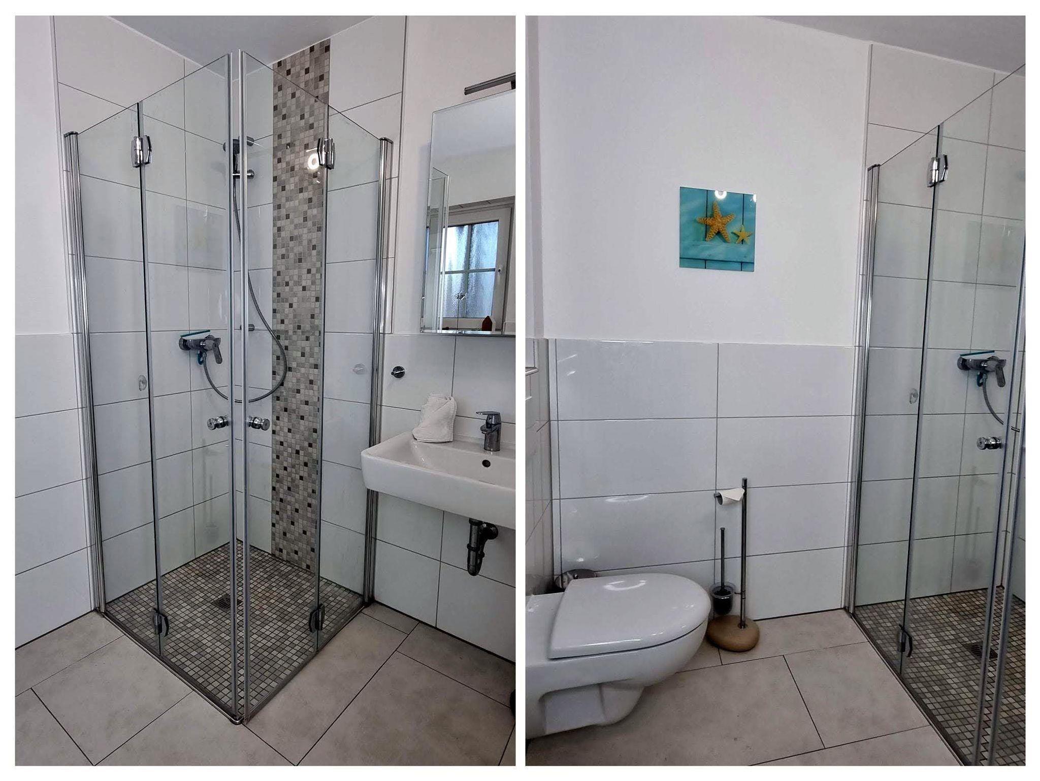 • 1 Badezimmer im EG (Duschbad) mit bodengleicher Dusche, WC, Waschbecken.