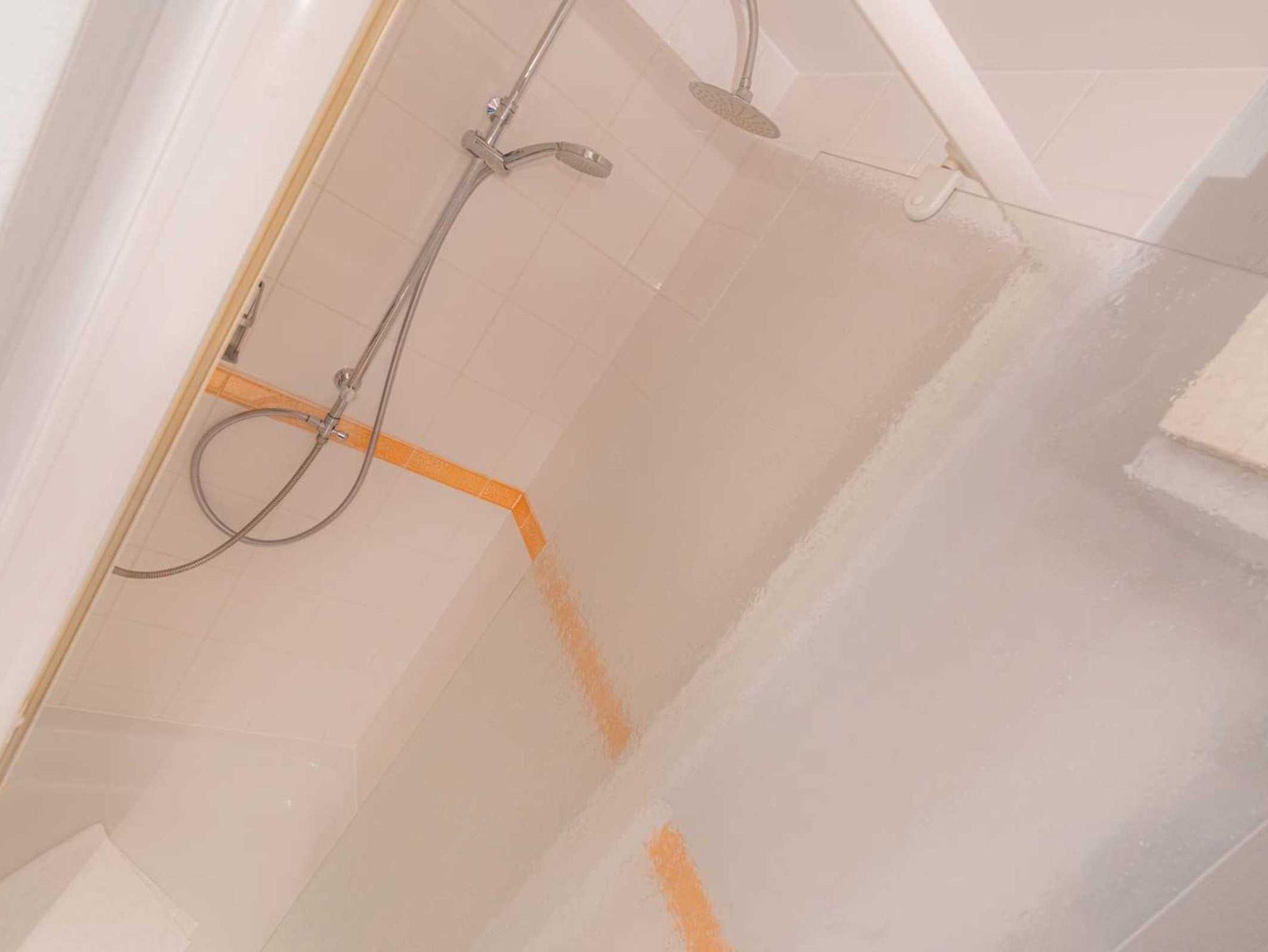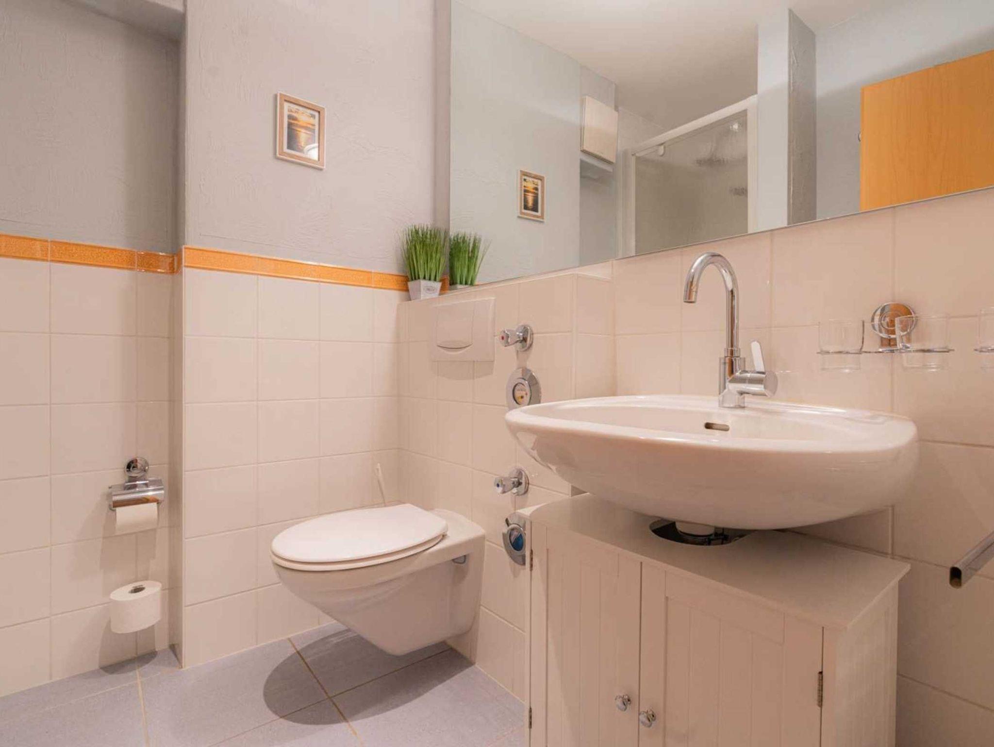 Badezimmer (Duschbad) mit Regen-Dusche, WC und Föhn.