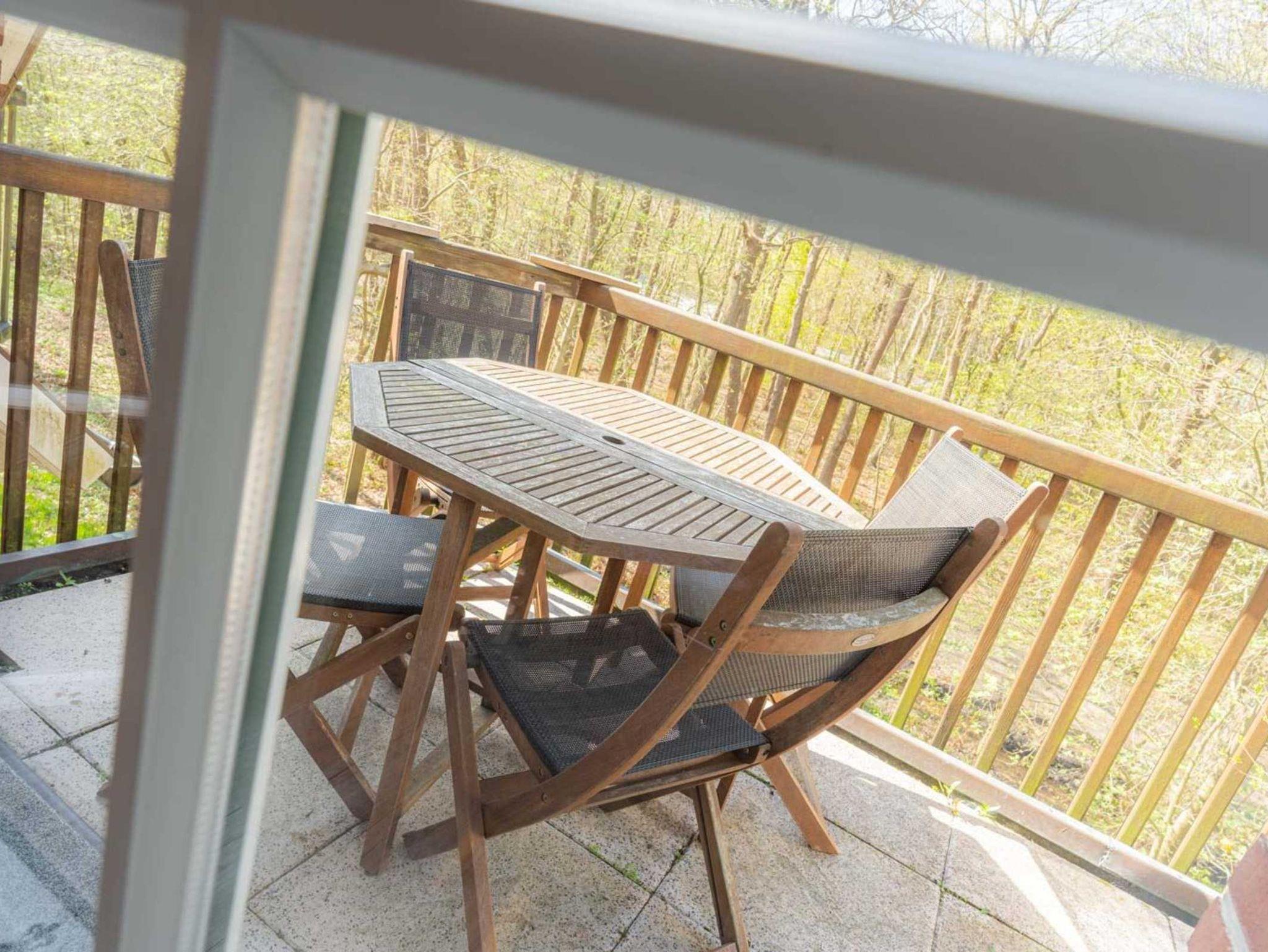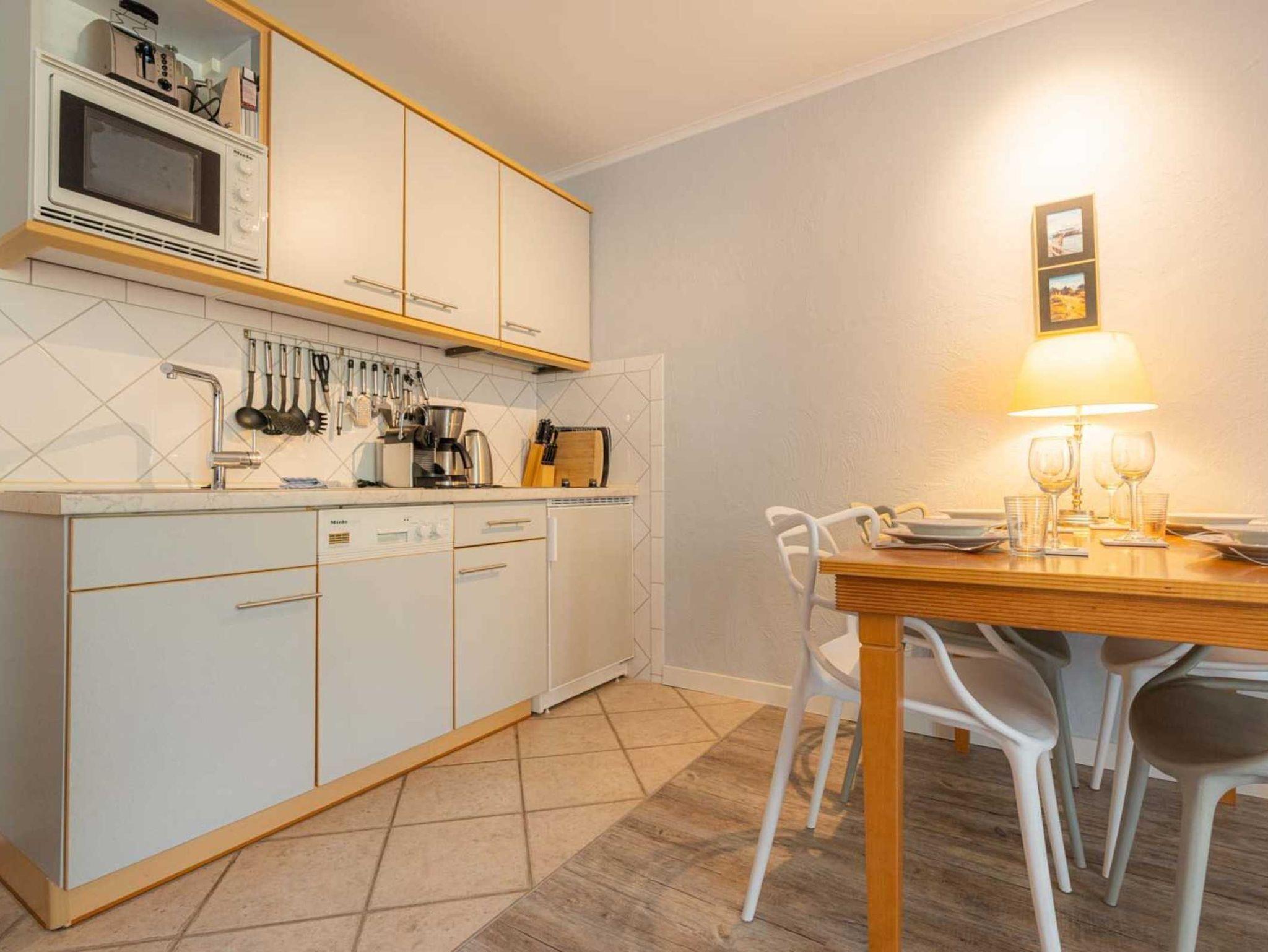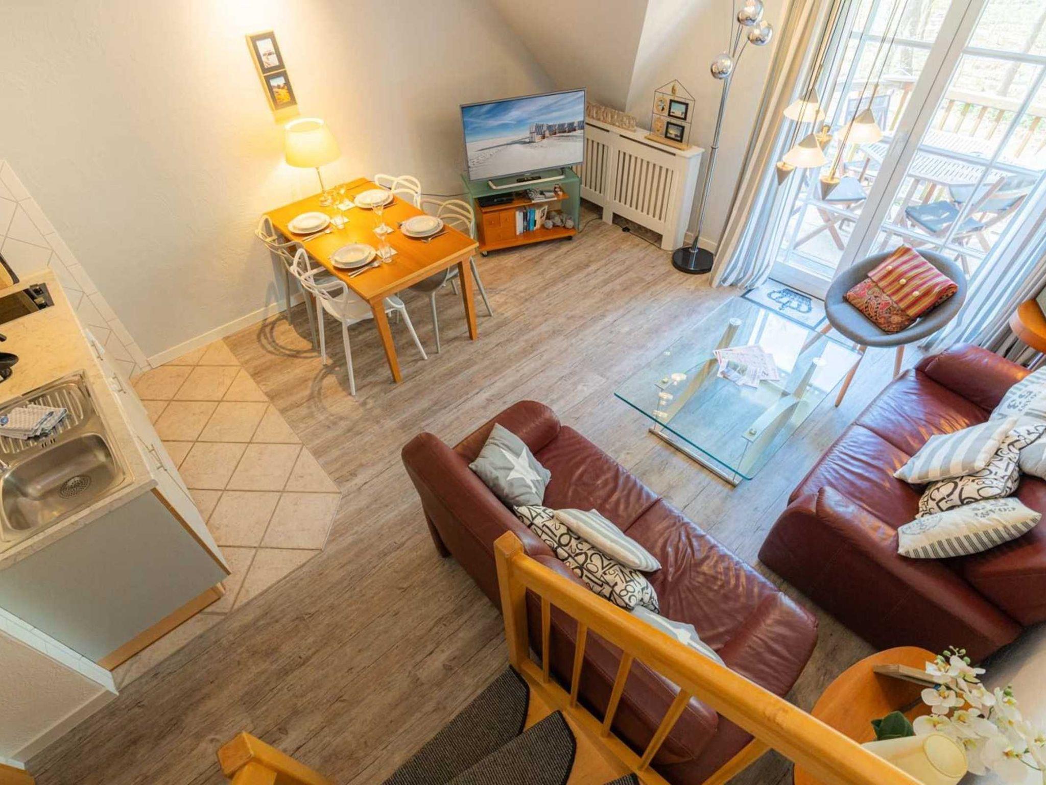 Wohnzimmer mit 2 Sofas für je 2 Personen, 1 Sessel, TV (Kabel), Sony Playstation 3, Bluetooth-Lautsprecher von Marshall und Esstisch mit 5 Stühlen. Vom Wohnzimmer führt eine Treppe zum 2. Schlafzimmer. Direkter Zugang zum möblierten Balkon nach Südwesten mit Ausblick aufs Wäldchen. Offene Küche mit Herd mit 2 Kochstellen, Mikrowelle mit Grillfunktion, Geschirrspüler, Kühlschrank mit Gefrierfach und De Longhi Nespresso Kapsel-Kaffeemaschine.