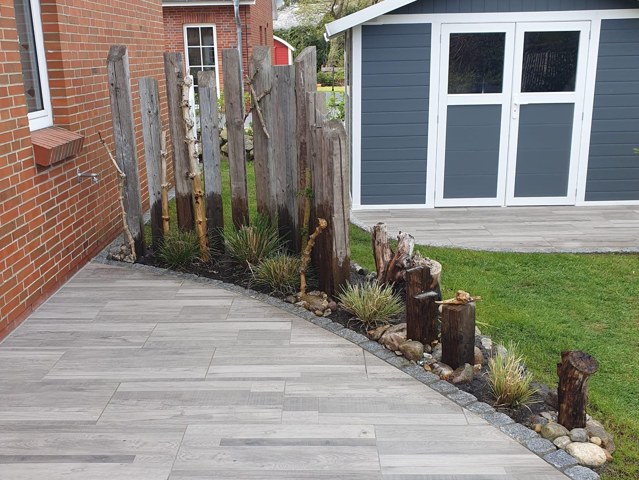 Zum Haus gehört ein eigener KfZ-Stellplatz. Fahrräder, Bollerwagen etc. finden Platz auf der großen, L-förmigen Terrasse.