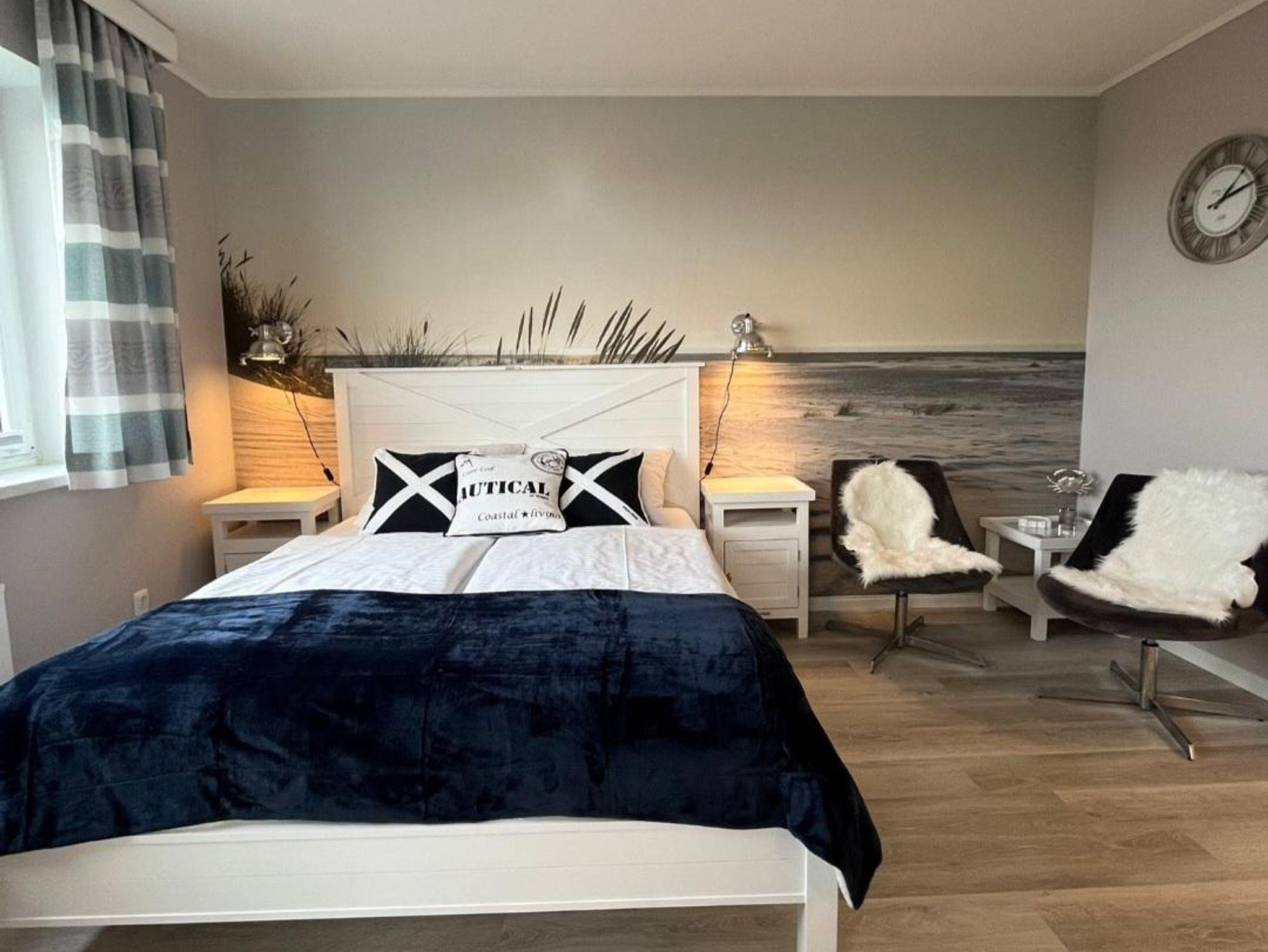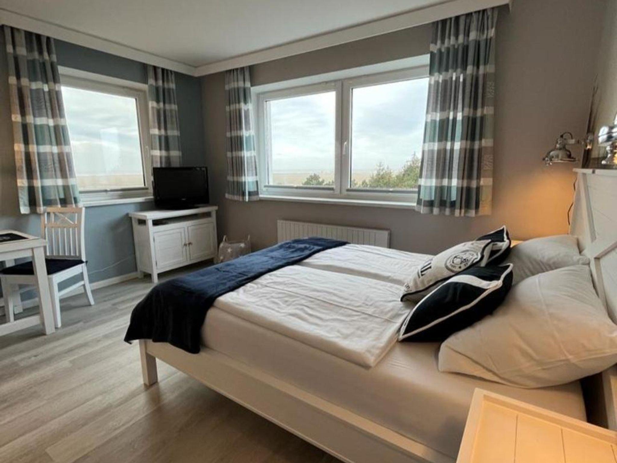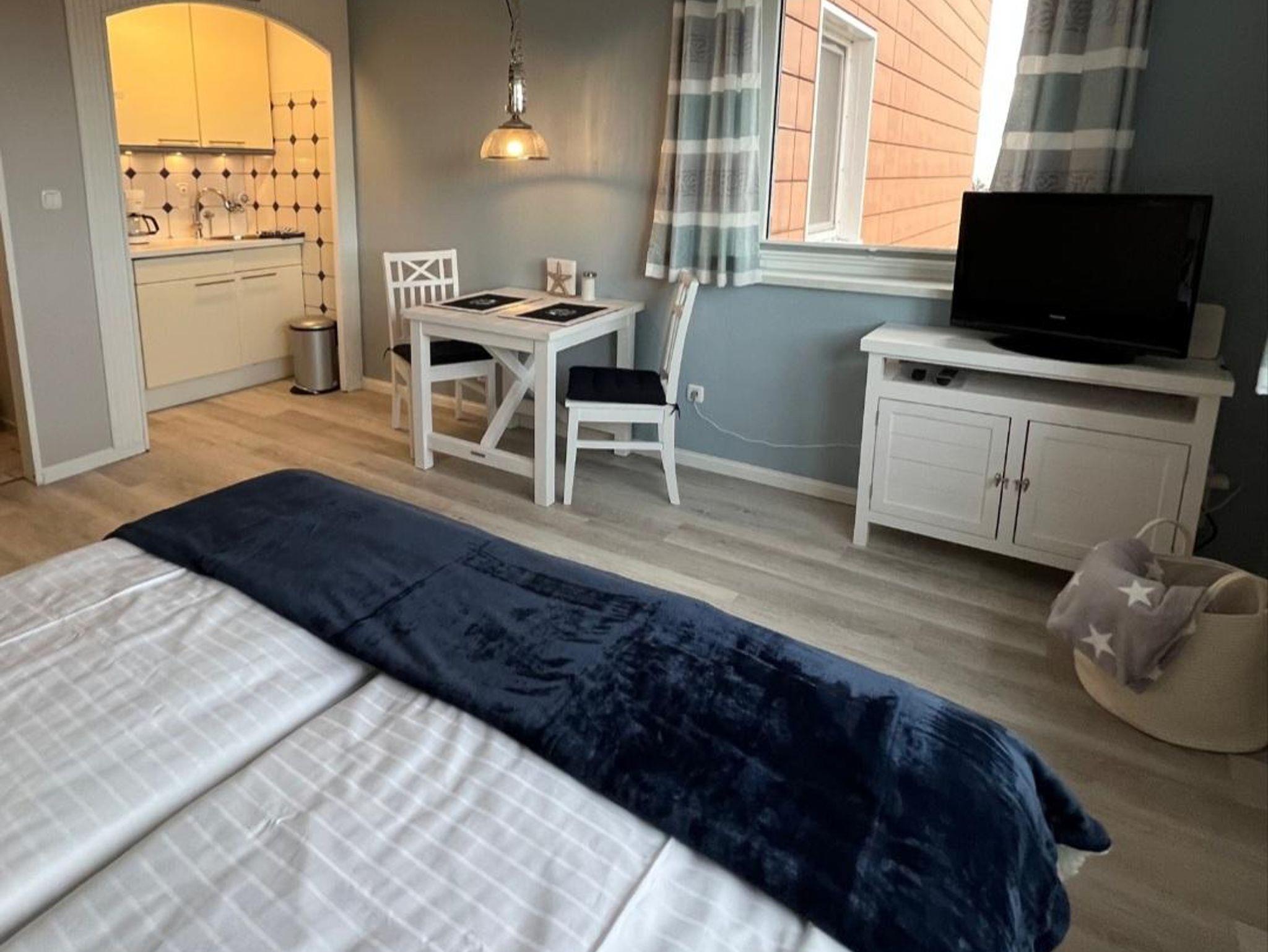Die Wohnung verfügt über einen Wohn-/Schlafzimmerbereich mit kleiner Küchenecke, Bad und einem kleinen begehbaren Kleiderschrank. Die Größe der Wohnung beträgt 28 qm und ist modern und hochwertig eingerichtet. Das Highlight der Wohnung ist der großzügige Wohn-/Schlafbereich mit einem großen Doppelbett, einer gemütlichen Sitzecke und einer Essecke, sowie einer offenen Küche. Die offene Küche ist gut ausgestattet, um kleine Mahlzeiten zuzubereiten. Hier können Sie entspannen und den Blick auf die Nordsee genießen.