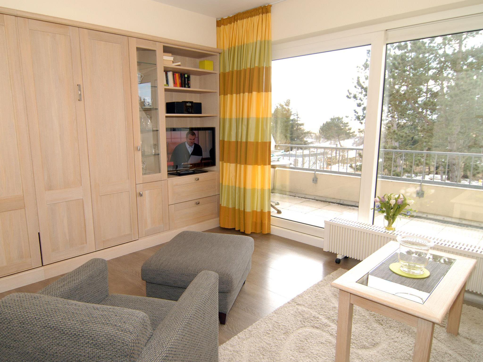 In der behaglich und modern eingerichteten 2-Zimmer-Ferienwohnung Atlantis Nr.07 im 2. OG finden Sie eine gut ausgestattete, neue Küchenzeile mitCerankochfeld und ein modernisiertes Bad vor. Schlafen können Sie mit bis zu 4 Personen im Schlafzimmer mit zwei Einzelbetten oder im Wohnzimmer mit Schrankdoppelbett. Vom West-Balkon sehen Sie durch die Bäume zum Meer.