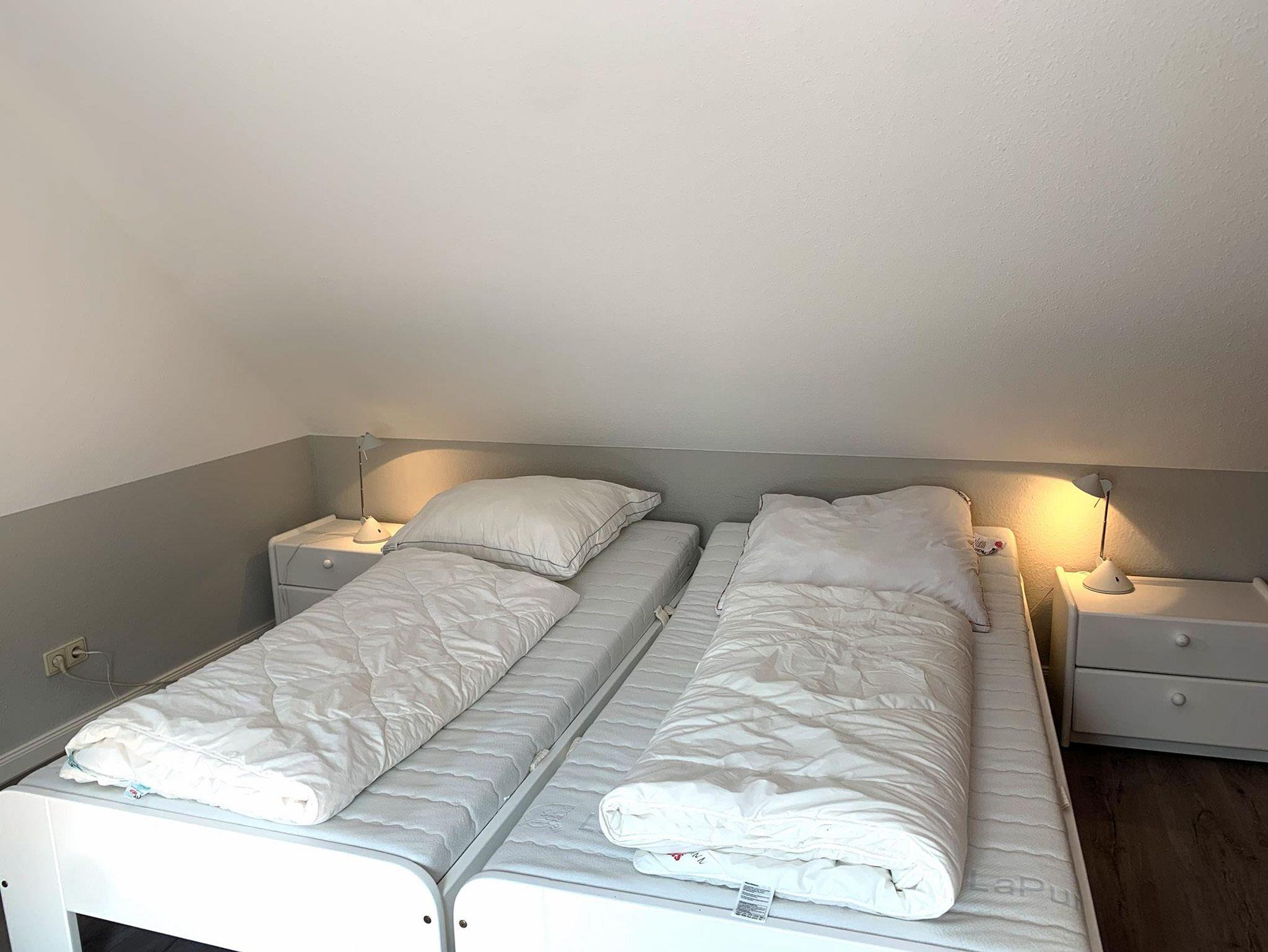 Schlafzimmer: 2 Einzelbetten, 2 Nachttische, Kleiderschrank, Anrichte, Bügelbrett, Bügeleisen