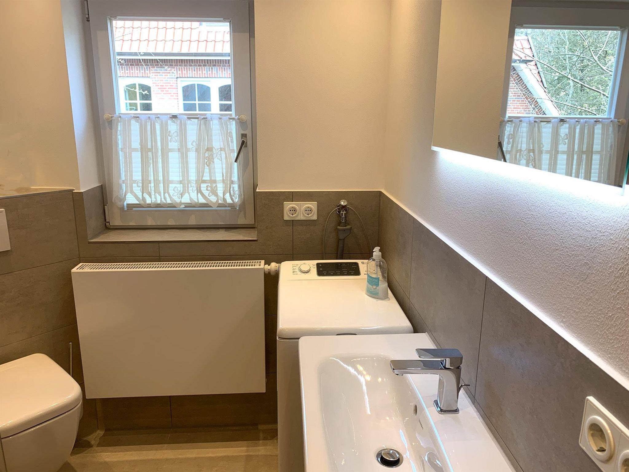 Bad: Dusche, Waschbecken, WC, Duschkabine, Schrank, Staubsauger