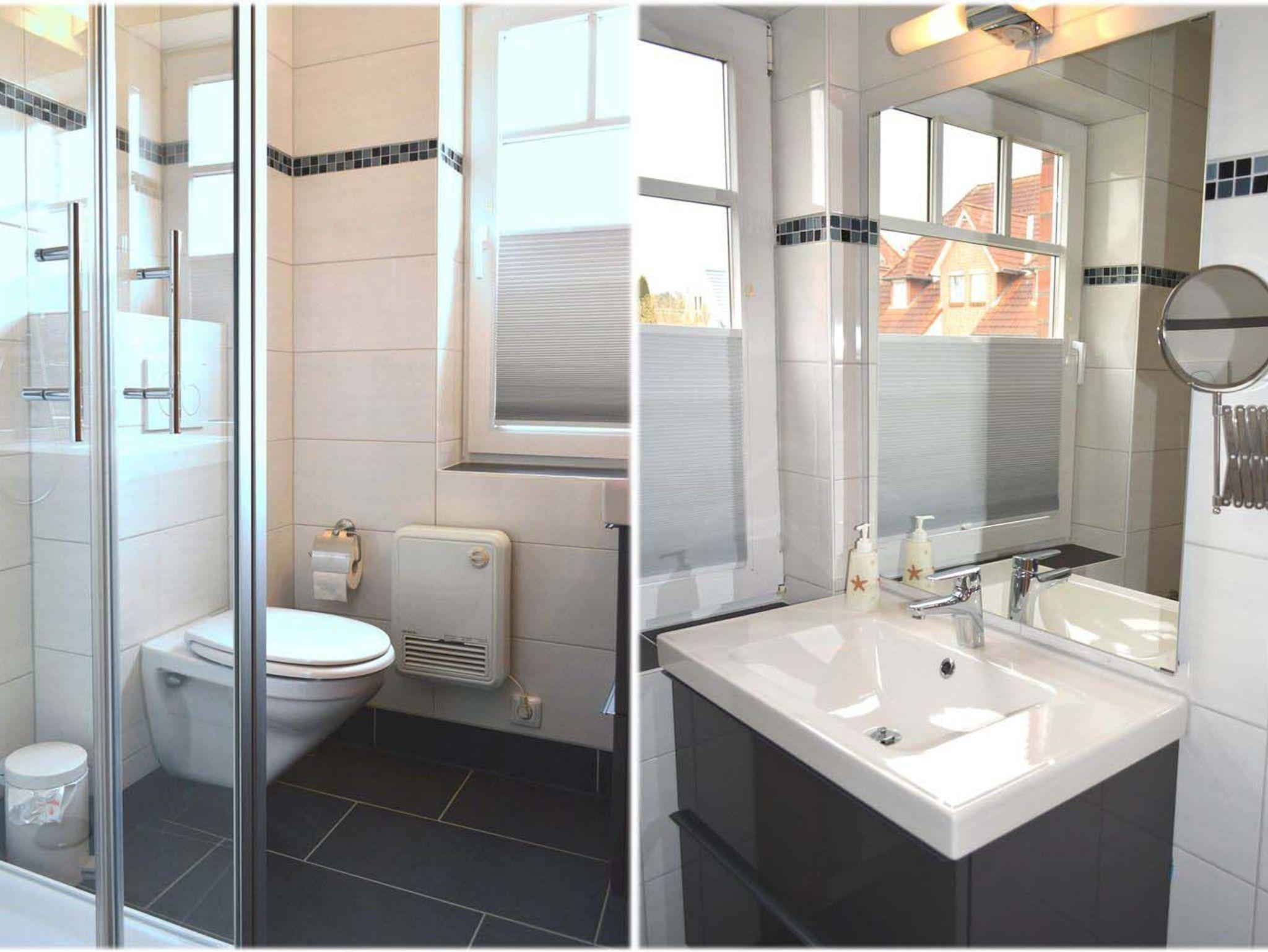Bad: Dusche mit Regendusche, Duschkabine, E-Heizung, Fön, Kosmetikspiegel, Spiegel, Waschtisch, WC