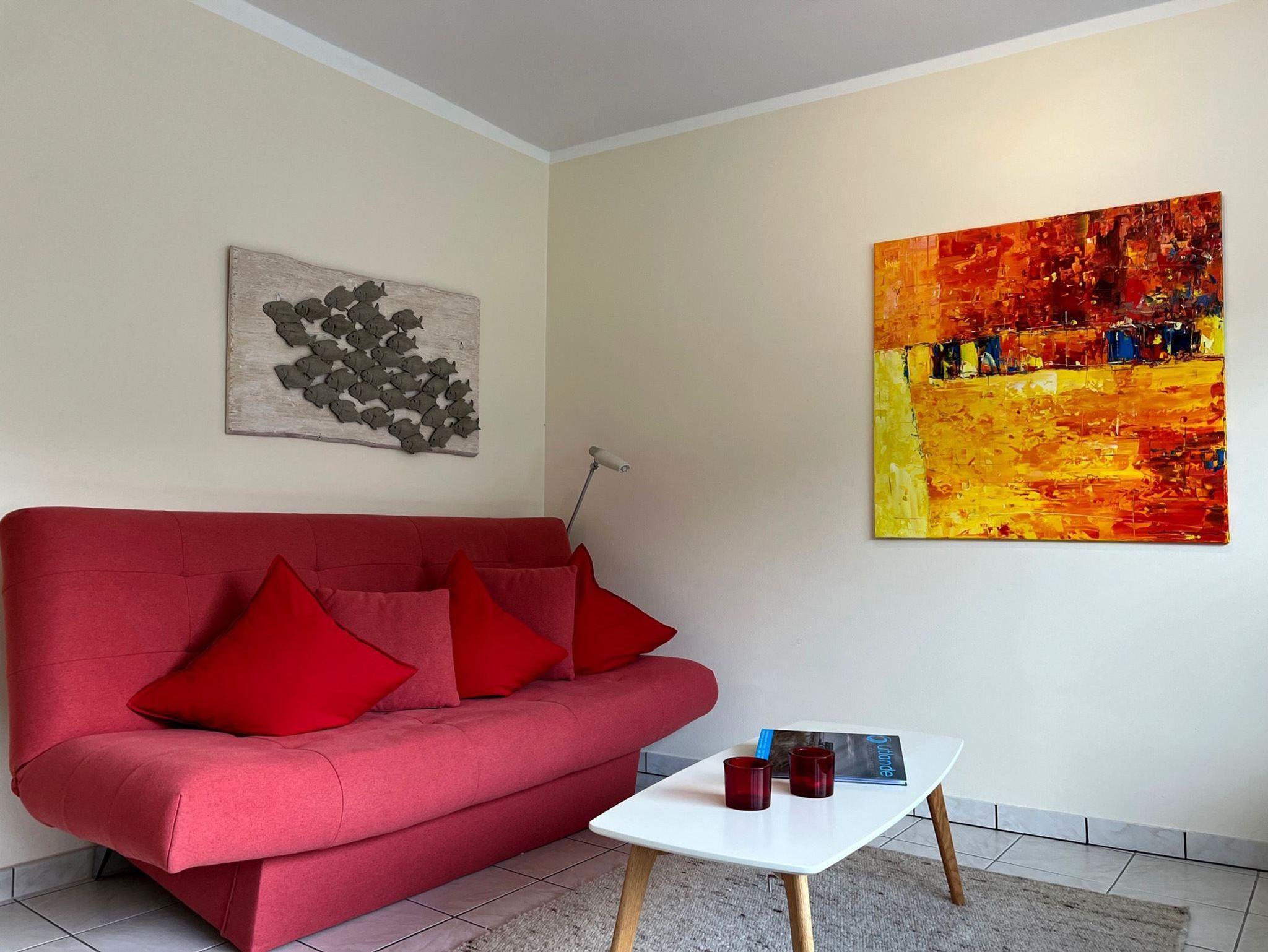 Moderne Einrichtung: Die gesamte Wohnung ist mit hochwertigen Fliesen ausgestattet und bietet moderne, gemütliche Möbel, die zum Entspannen einladen.