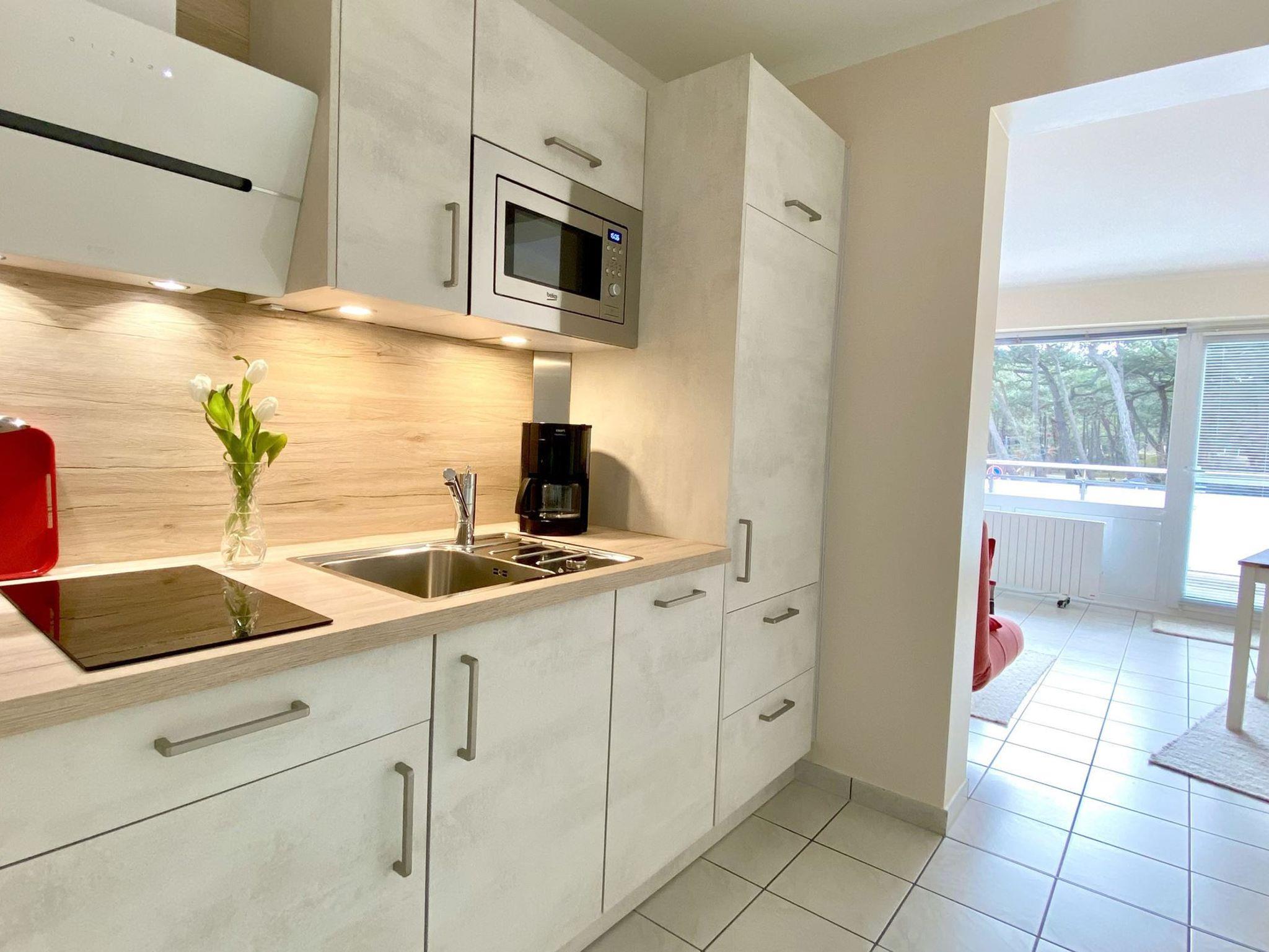 Gut ausgestattete Küchenecke: Die neue Küchenecke verfügt über eine Spülmaschine, ein Induktionskochfeld und eine Mikrowelle, sodass Sie mühelos köstliche Gerichte zubereiten können.