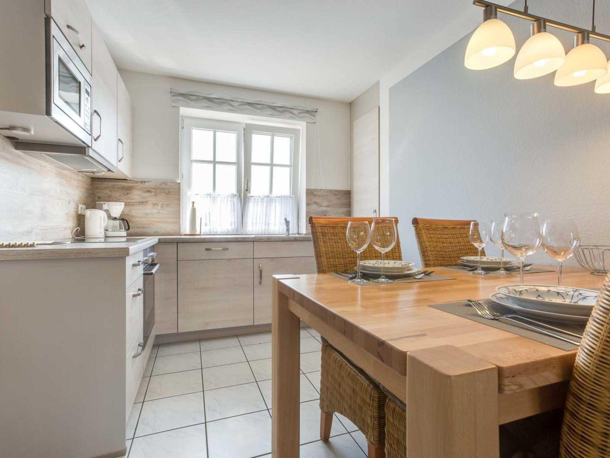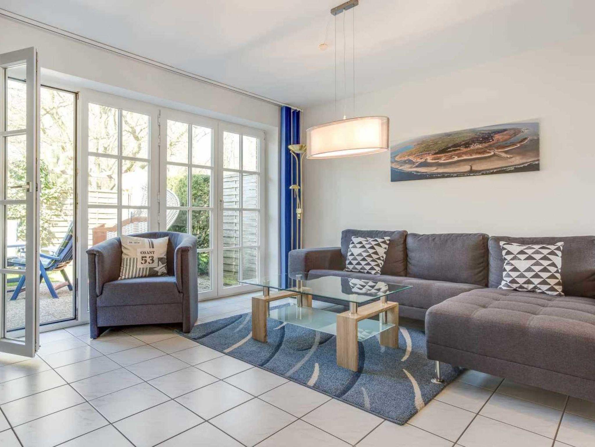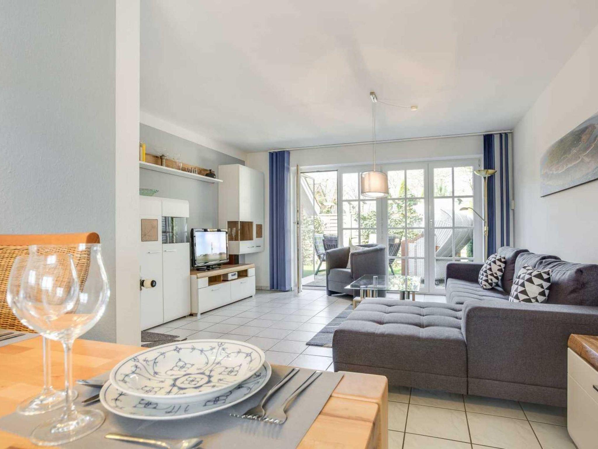 Wohnzimmer mit Ecksofa (3er), Sessel, TV (Kabel) und direktem Zugang zur Terrasse. Offene Küche mit Backofen, Mikrowelle, Kühlschrank mit Gefrierfach, Geschirrspüler und Esstisch mit 5 Stühlen.
