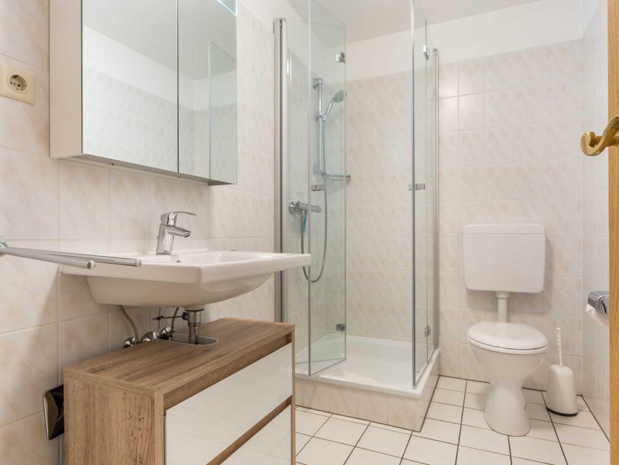 Badezimmer (Duschbad) mit Dusche, WC und Föhn.