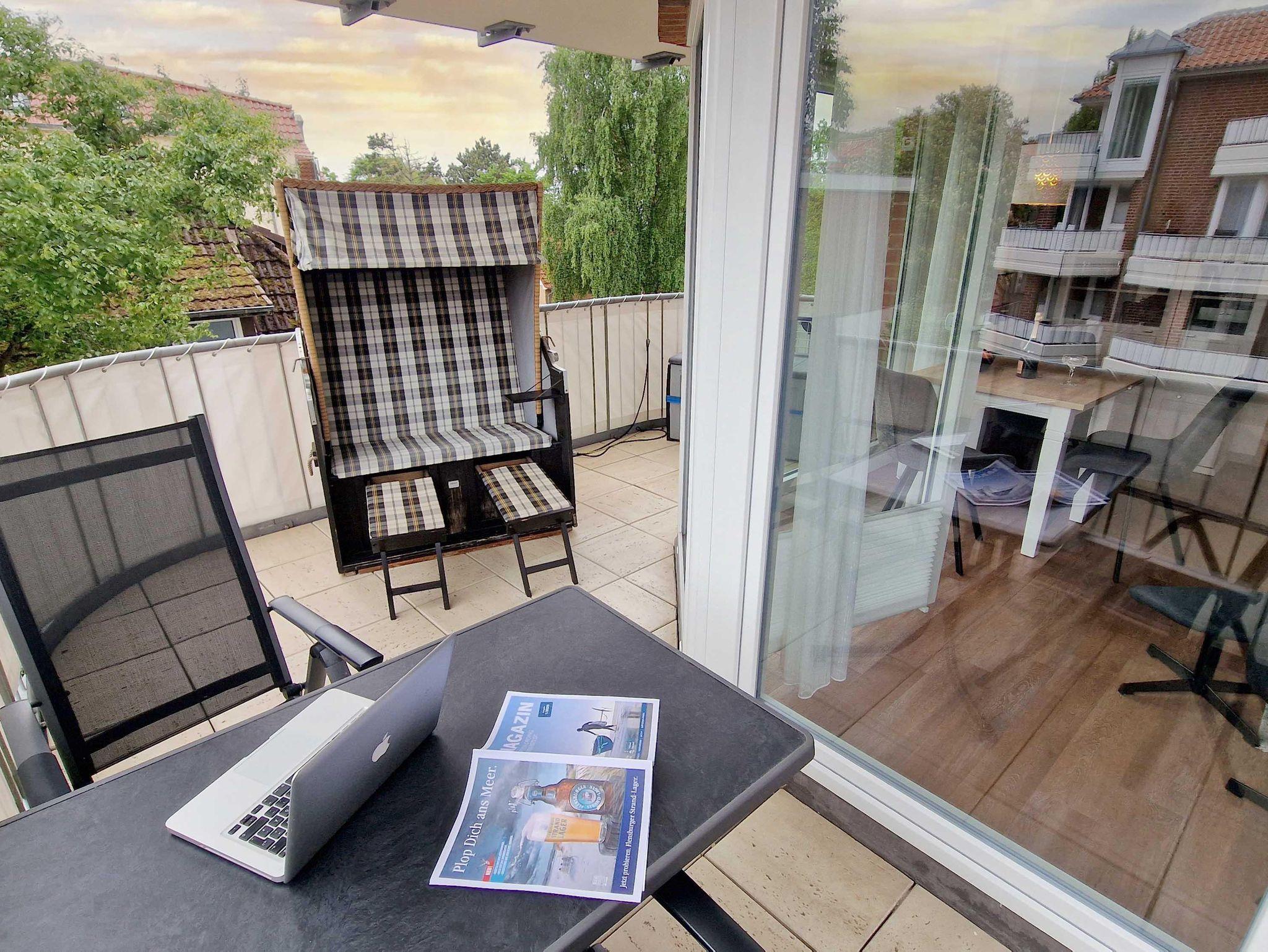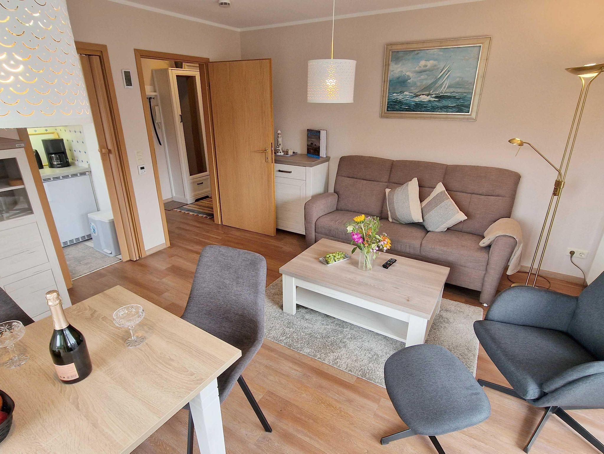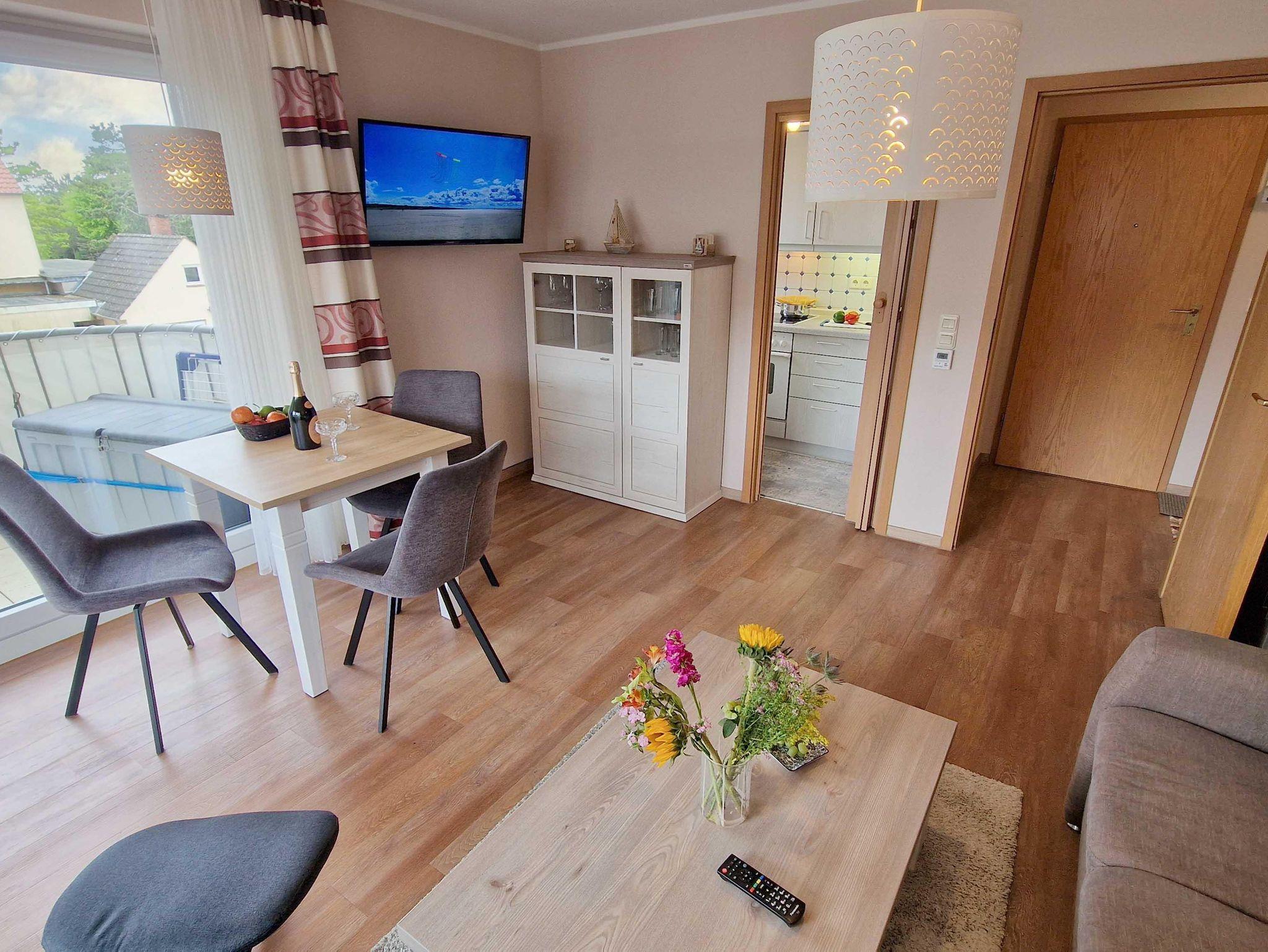 Die gemütliche 2-Zimmer-Ferienwohnung hat einen großen, sonnigen Süd-West-Balkon mit Strandkorb. Tagsüber können Sie es sich im Wohnzimmer gemütlich machen und abends im Doppelbett im Schlafzimmer erholen. In der Küche finden Sie ein 4-Platten-Ceranfeld und Backofen. Ein Geschirrspüler und der Kühlschrank mit Gefrierfach vervollständigt das Ganze. Das modernisierte Bad ist schön hell gefliest.