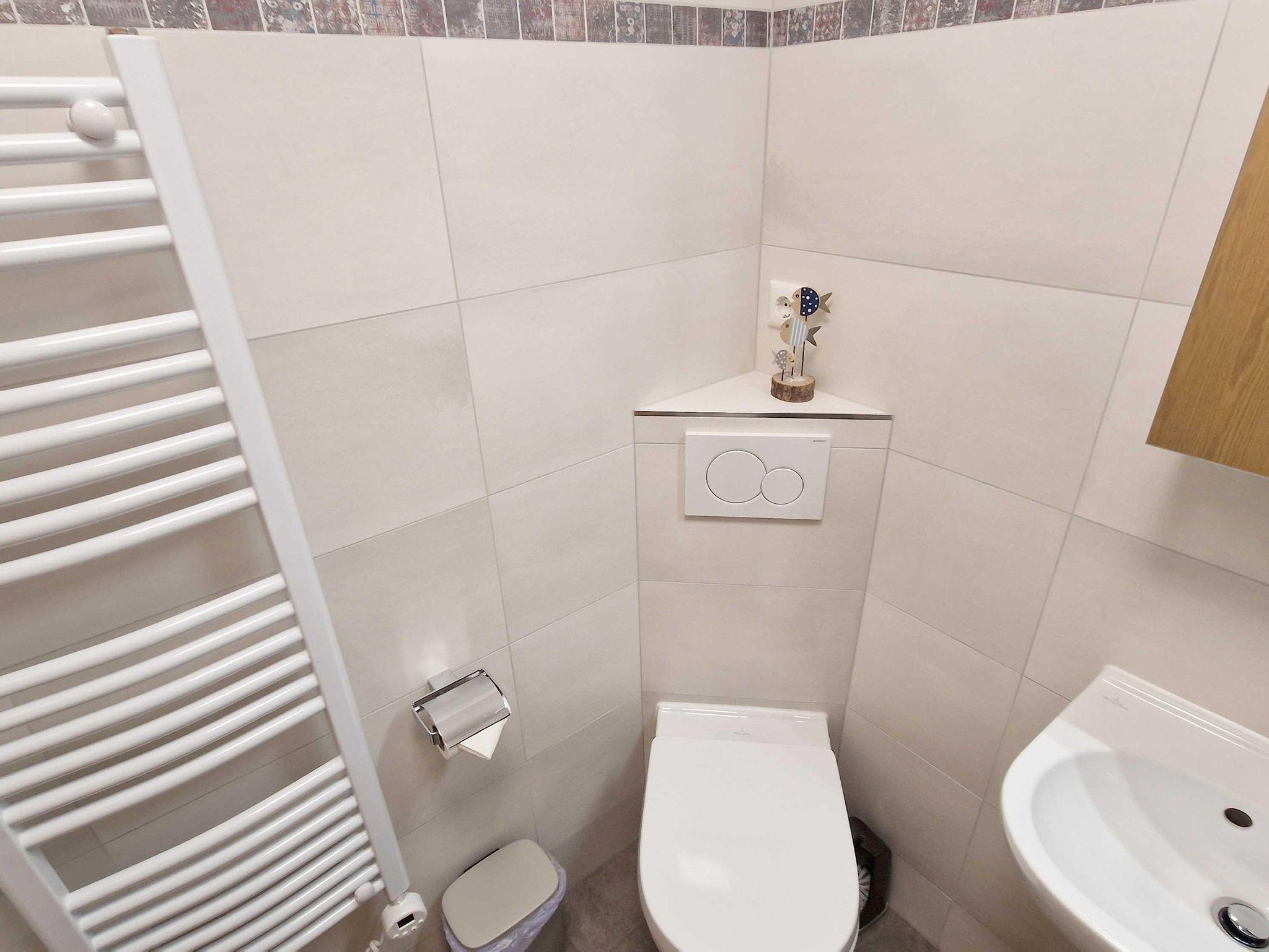 Bad: Dusche, Waschbecken, WC, Regal, Duschkabine