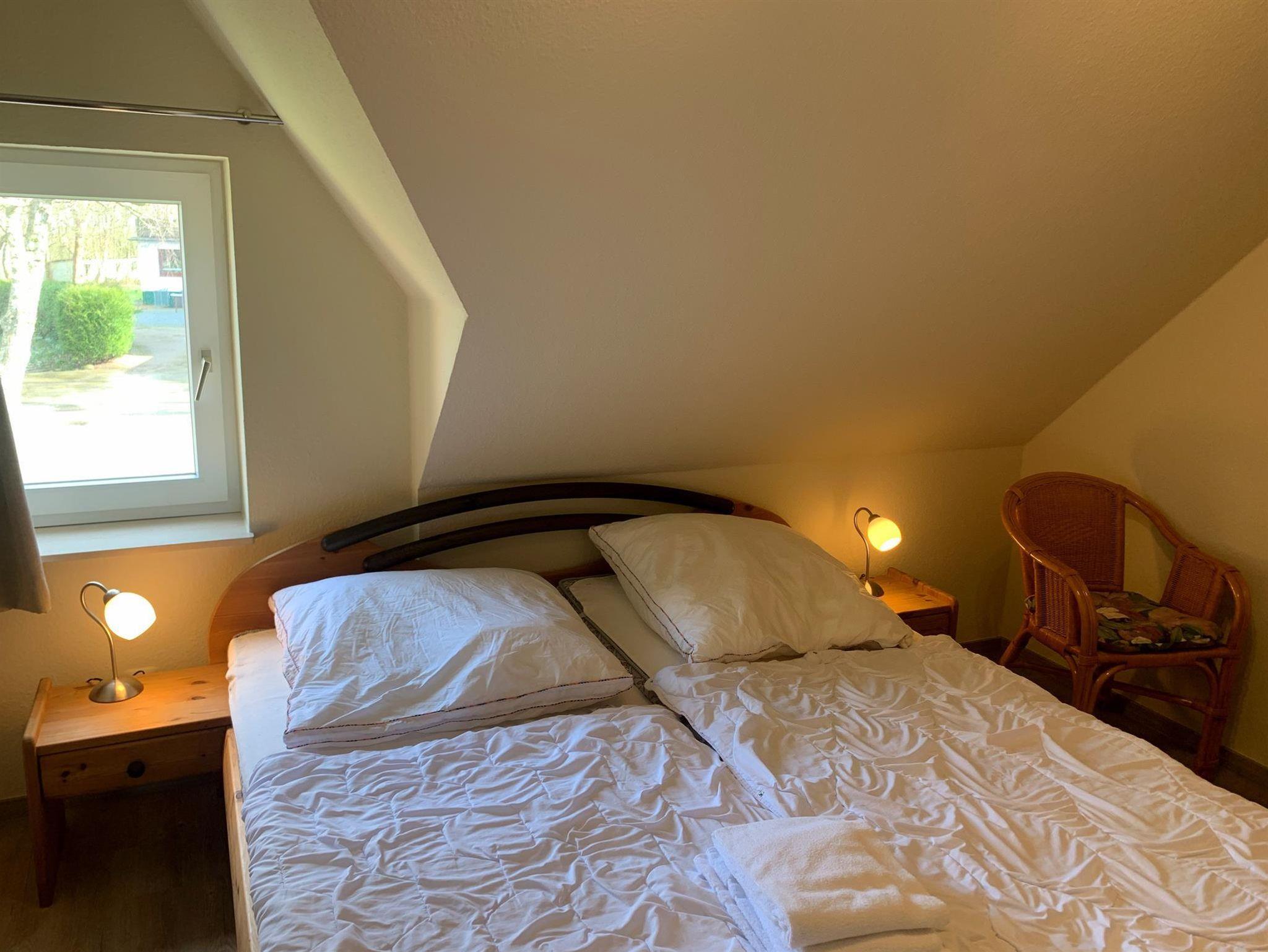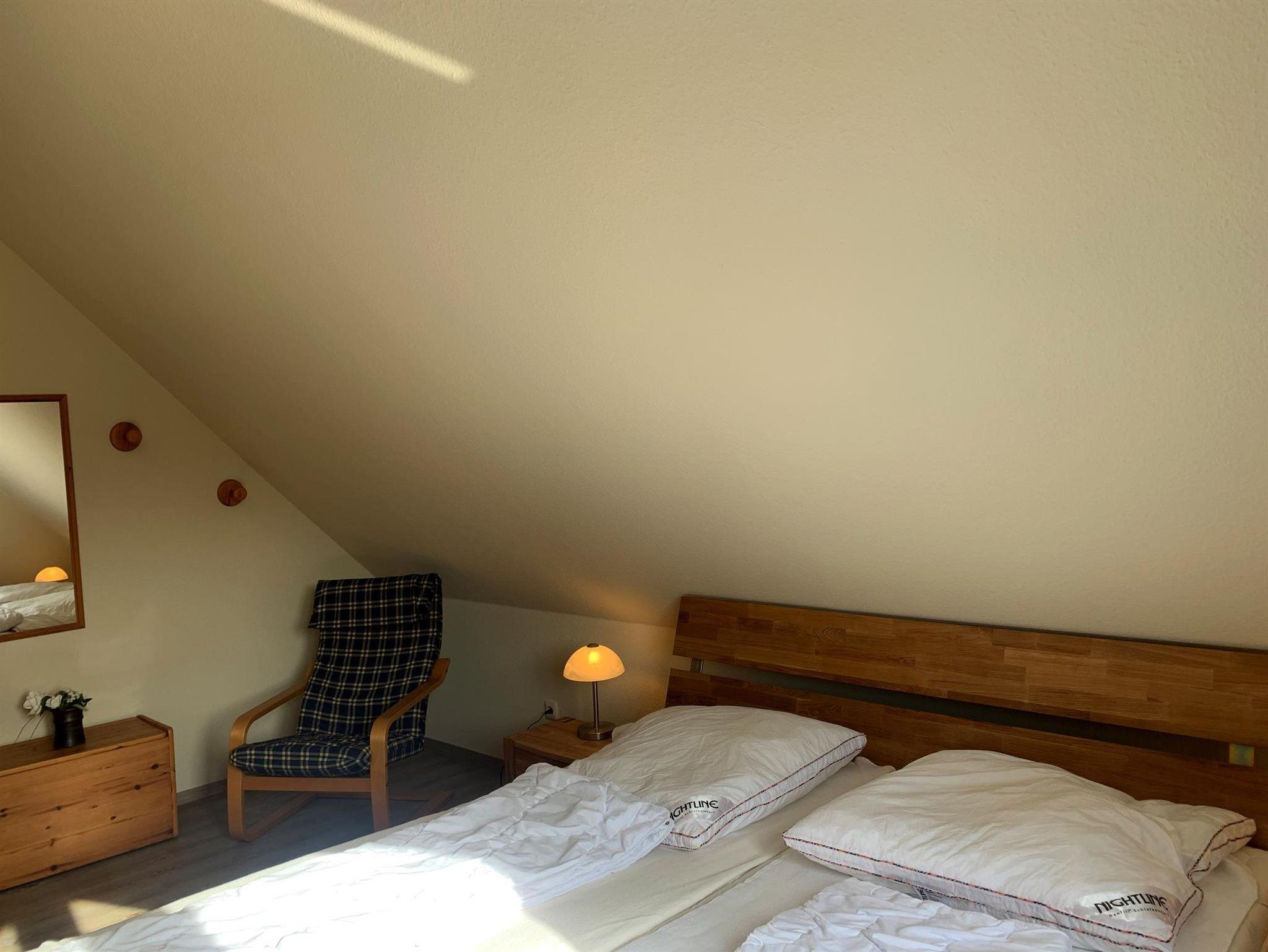 Schlafzimmer 22 Einzelbetten, 2 Nachttische, Sessel, Spiegel, Ablage, Einbauschrank, Wecker, Tisch, 2 Stühle, Treppe nach unten