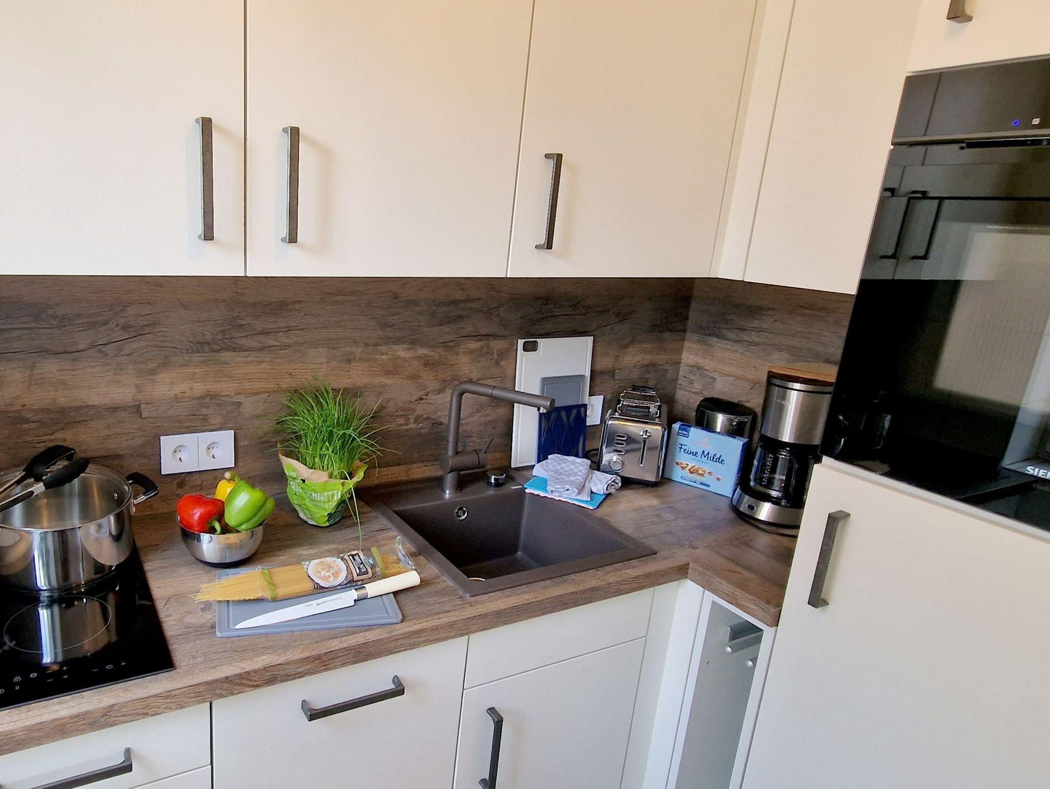Gut ausgestattete Küchennische: In der separaten Küchennische finden Sie 2 Ceranfelder, einen Geschirrspüler und einen Backofen mit Mikrowellenfunktion, die Ihnen die Zubereitung von köstlichen Mahlzeiten erleichtern.