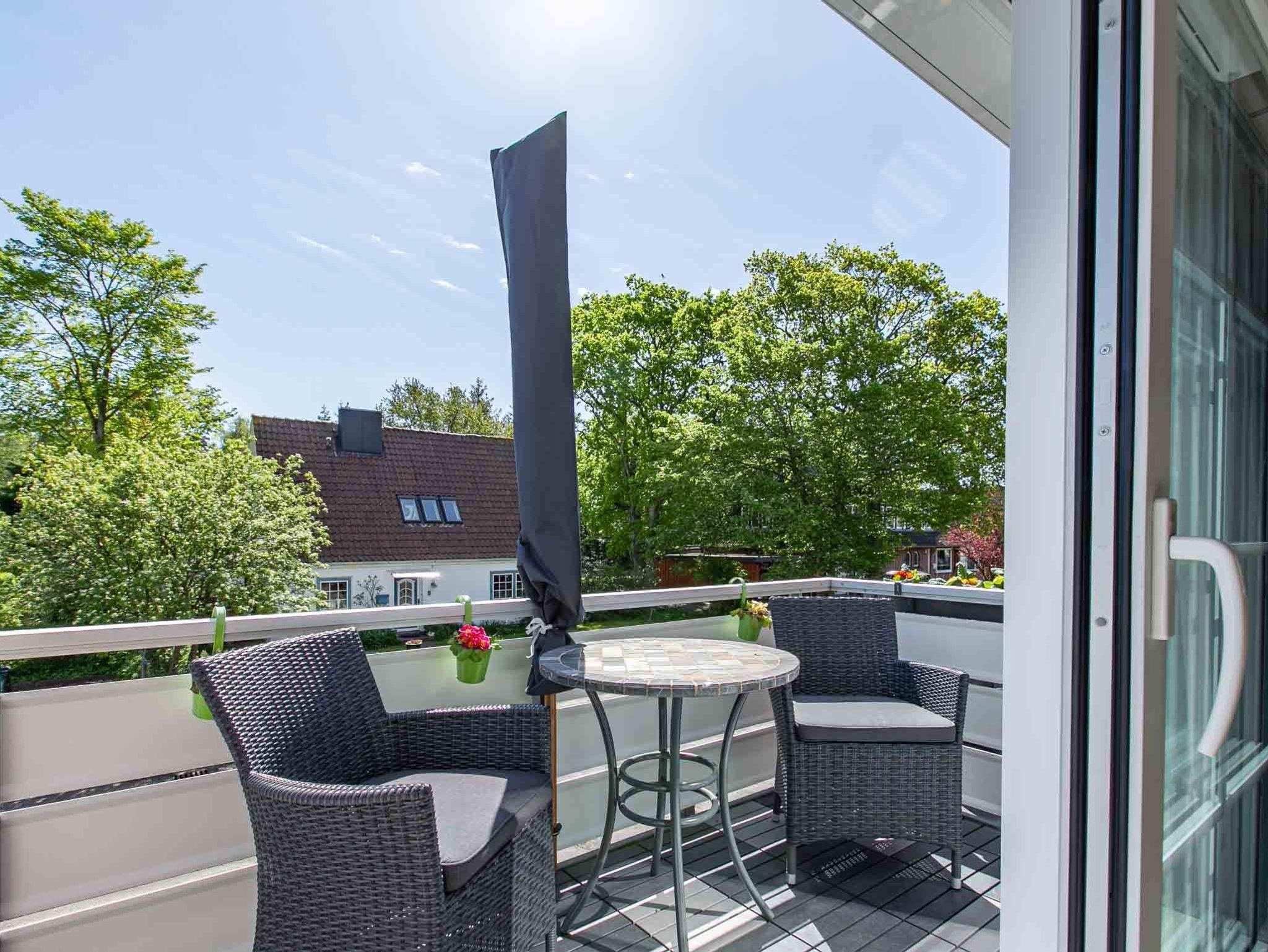 Wohn- und Esszimmer mit Sofa, Sessel, SMART-TV (Kabel), Bluetooth-Soundsystem und Esstisch für 4 Personen. Direkter Zugang zum großen, möblierten Balkon nach Osten mit Blick auf das Wäldchen. Offene Küche mit Backofen, Geschirrspüler, Kühlschrank mit Gefrierfach und viel Komfort.