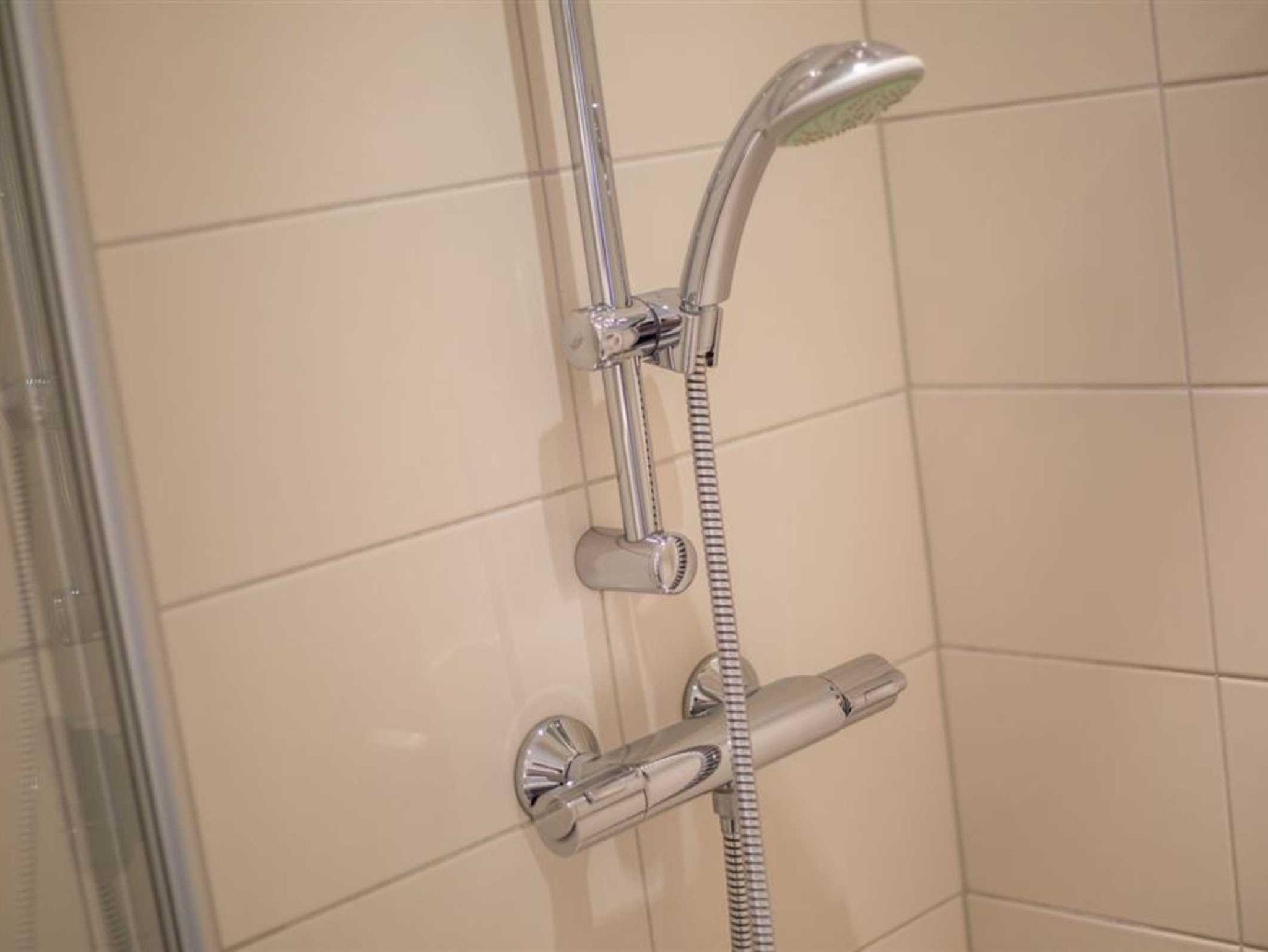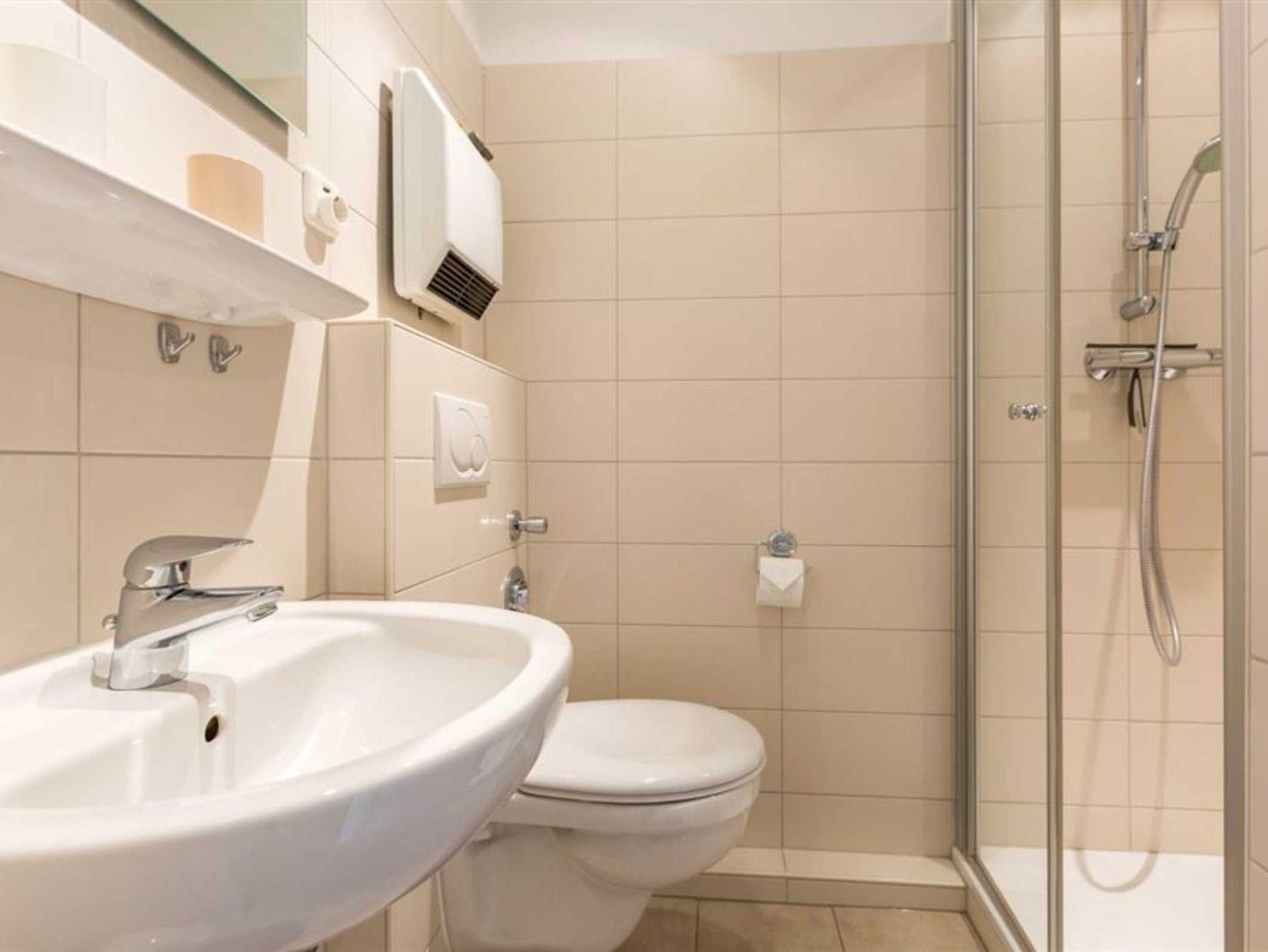 Modernisiertes Badezimmer (Duschbad) mit Dusche und WC.