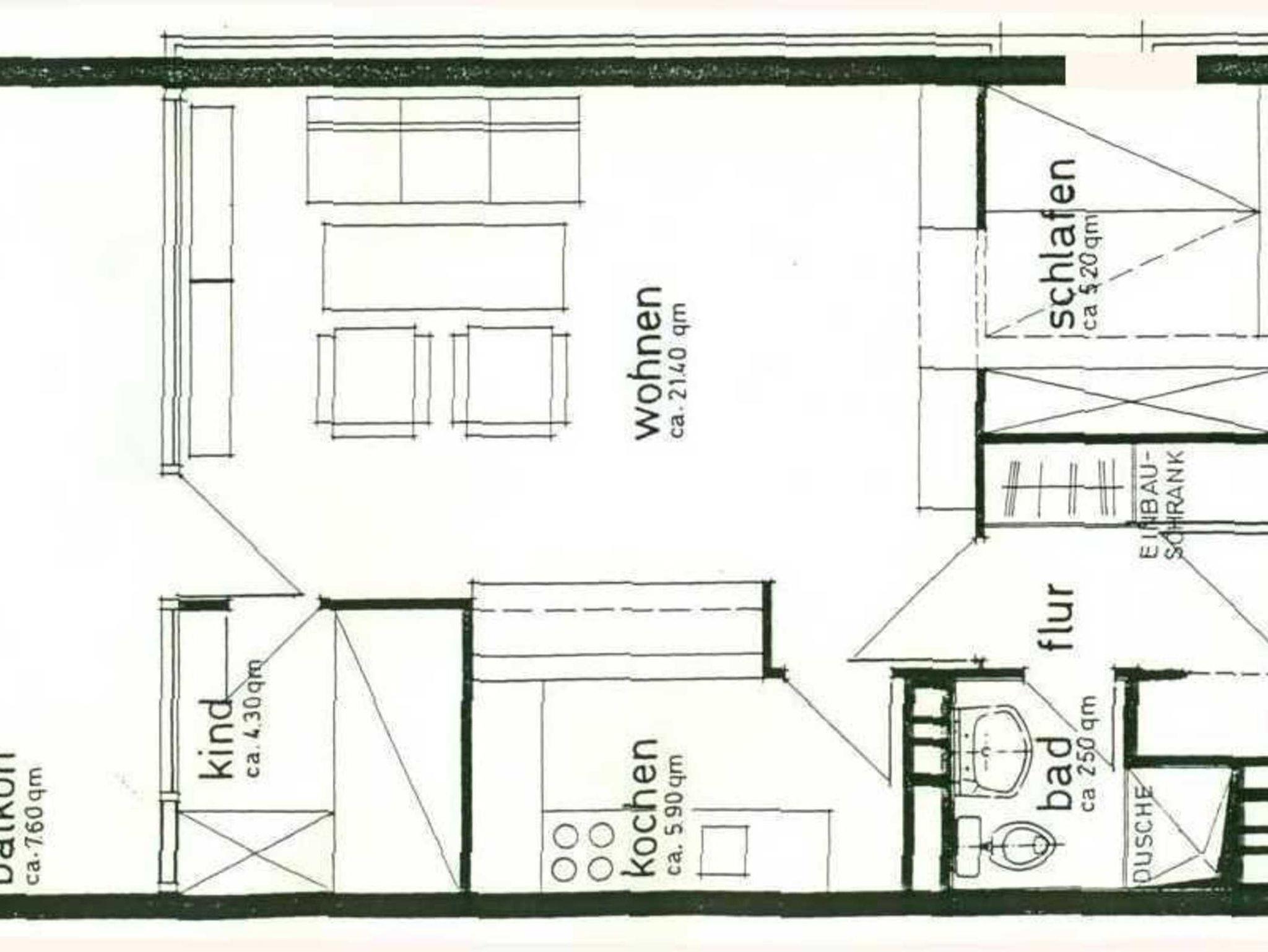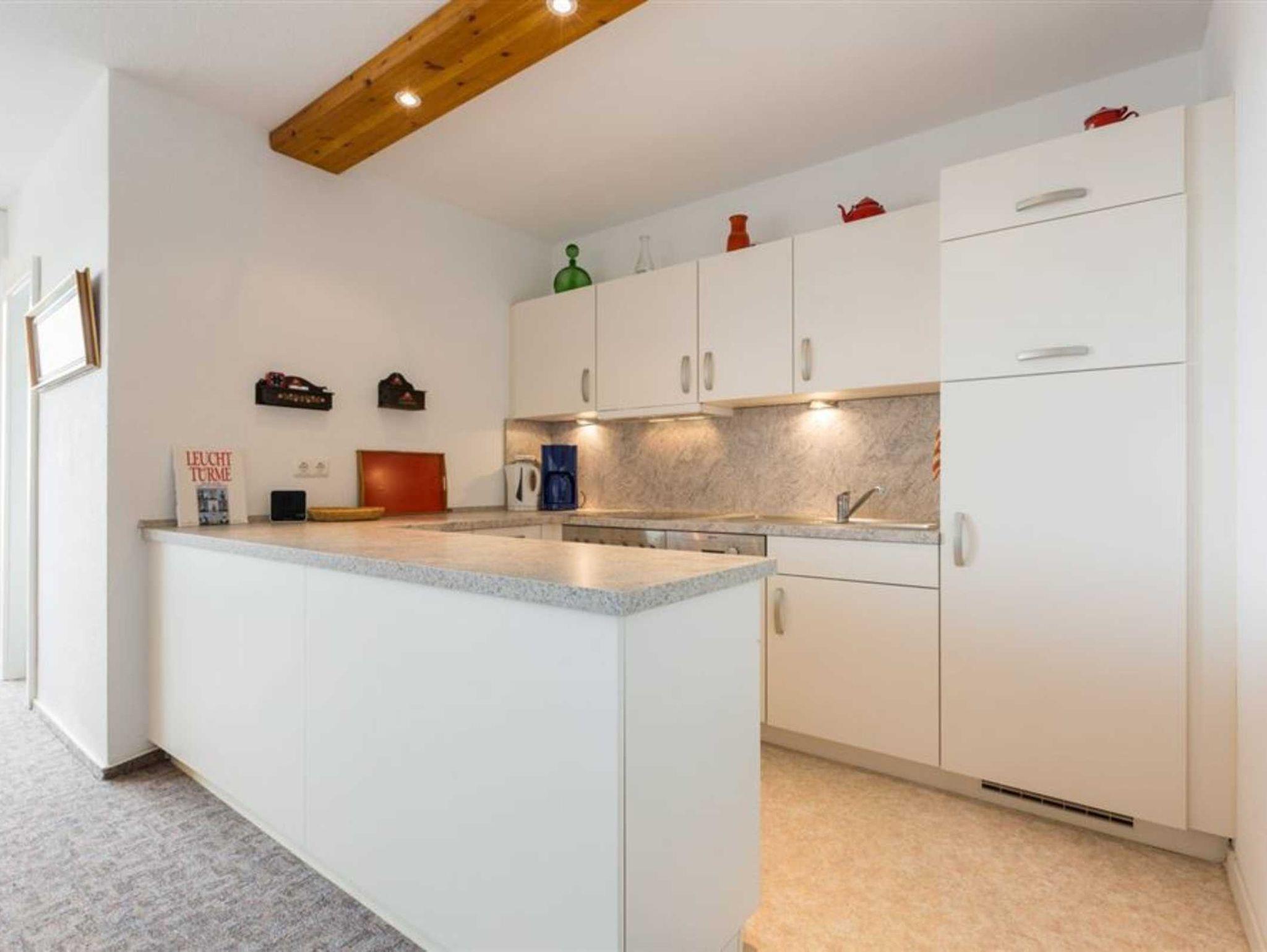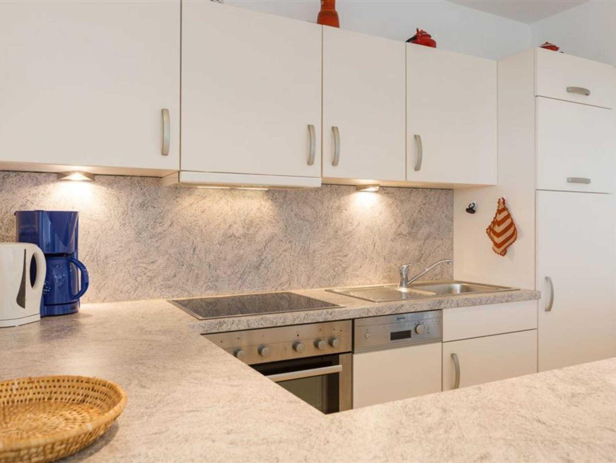 Wohnzimmer mit 2 Sofas für je 2 Personen, großem TV (Sat) und Esstisch mit 4 Stühlen. Direkter Zugang zum möblierten Balkon nach Westen mit herrlichem Ausblick über den Wald bis zum Meer. Offene Küche mit Backofen, Mikrowelle, Geschirrspüler, Kühlschrank mit Gefrierfach und Radio.