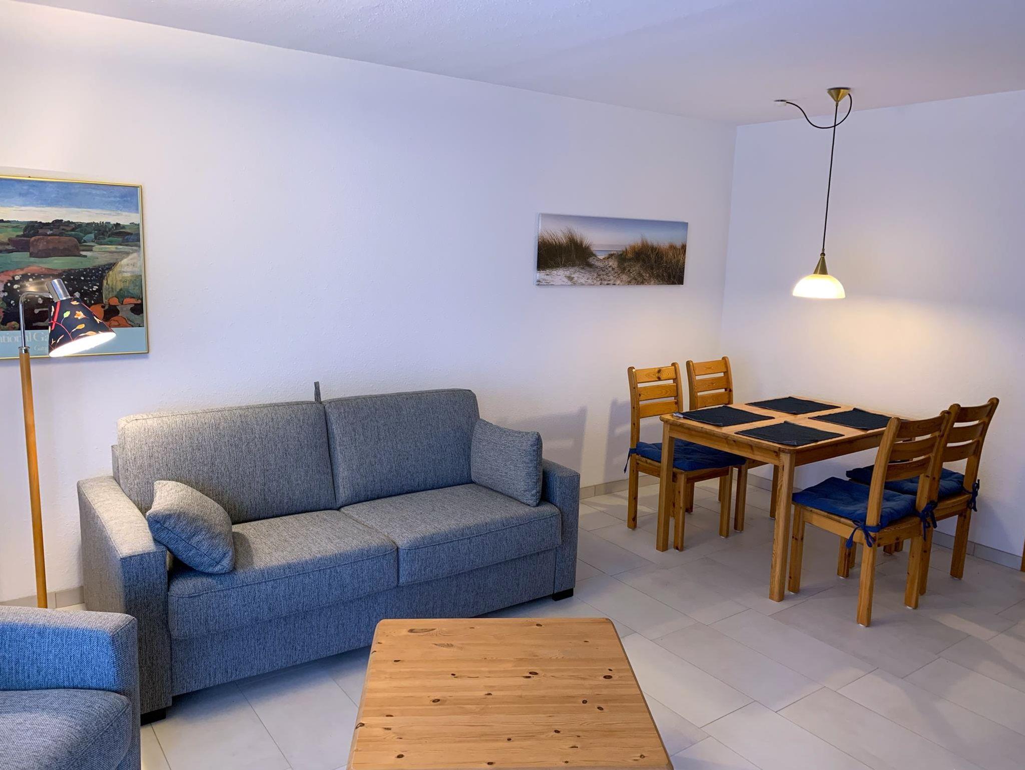 Wohnzimmer: Schlafcouch, Couchtisch, Sessel, Stehlampe, Bettwäschekorb, Anrichte, Nachtspeicherofen, Kabel-TV, Telefon, Stereoanlage mit CD-Player, Esstisch, 4 Stühle, Wecker