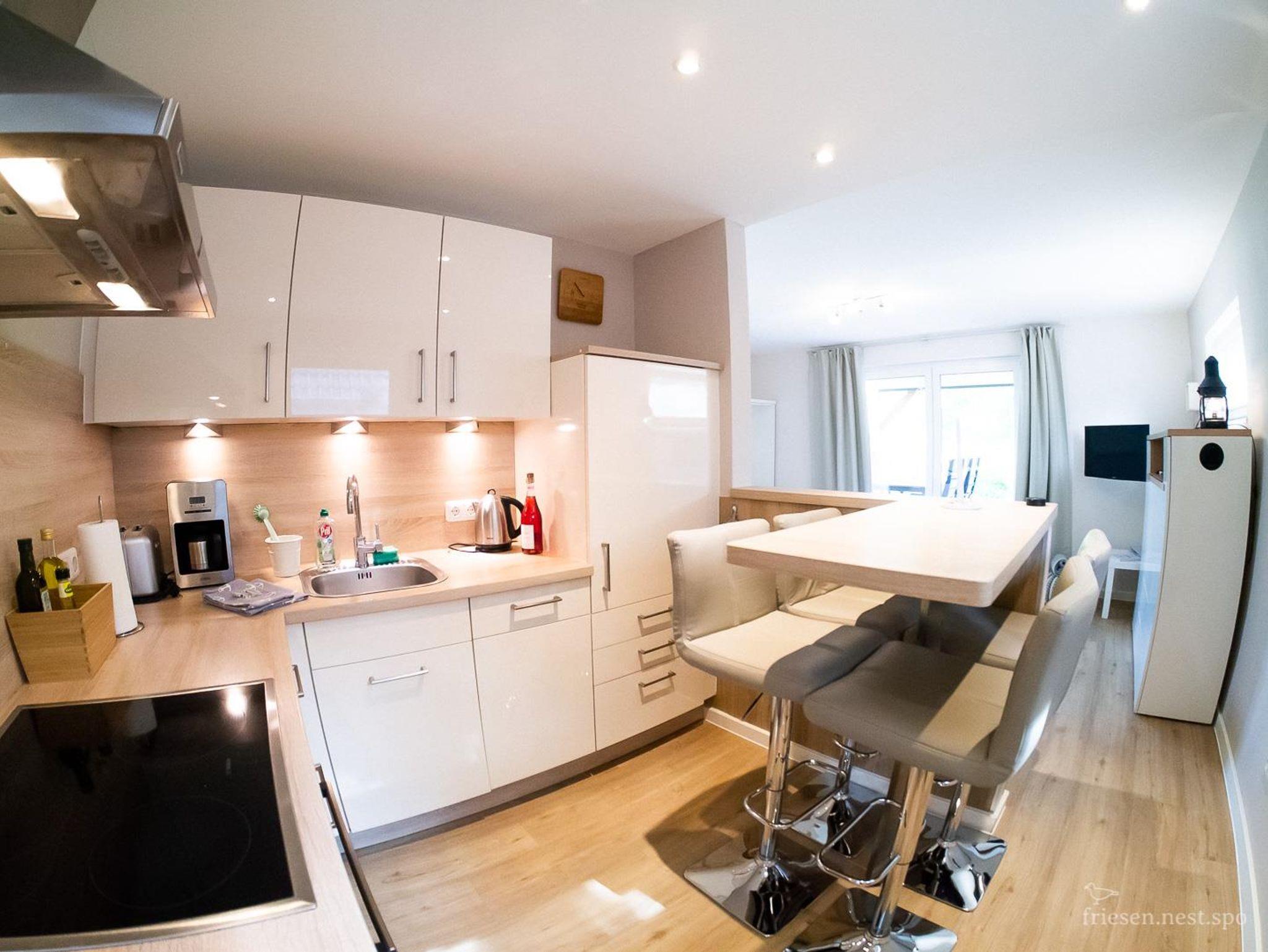 Die Ferienwohnung friesen.nest liegt im EG in der Friesenstrasse 16. Die Wohnung wurde komplett neu saniert und möbliert. Sie ist bestens geeignet für Paare. Die Einrichtung wurde im Rahmen der Sanierung des gesamten Gebäudes geschmackvoll erneuert. Ein schönes großzügiges Badezimmer (6,6m²) sowie eine Einbauküche mit Umluftherd, Geschirrspüler und Kühlschrank sowie komfortablen Sitzmöbeln runden das Angebot ab. Besonders gelungen sind die beiden Terrassen, die eine überdacht und die Südterrasse mit Strandkorb im 160m² großem Garten.