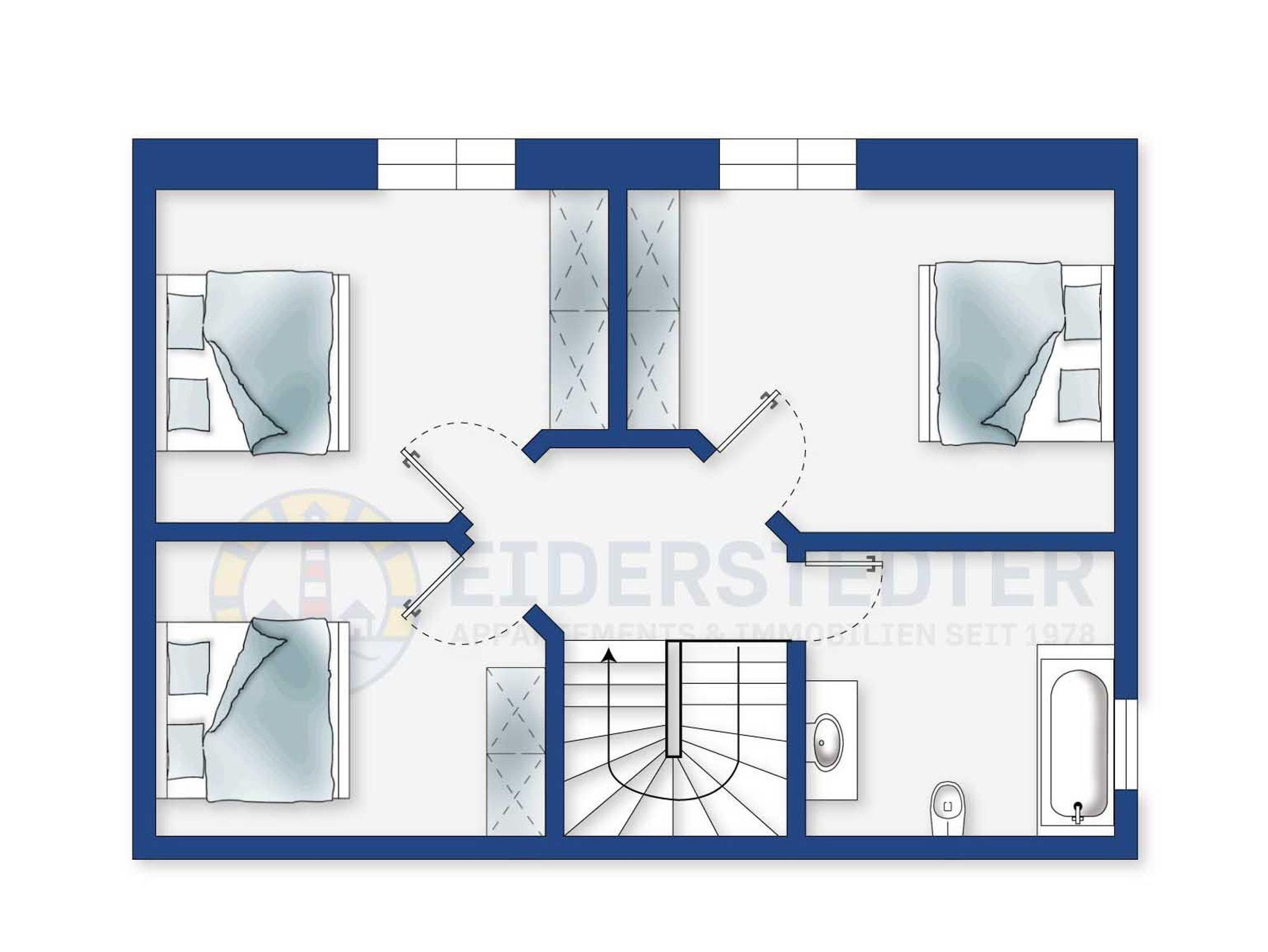 3 Schlafzimmer: Doppelbett (90x200 cm), zwei französische Doppelbetten (140x200 cm), jeweils mit hochwertigen Bugatti-Matratzen, Kleiderschränken, SMART-TV und abdunkelbaren Fenstern mit Fliegengittern. 2 Bäder: Duschbad mit Regen-Dusche, Wannenbad mit Fußbodenheizung.