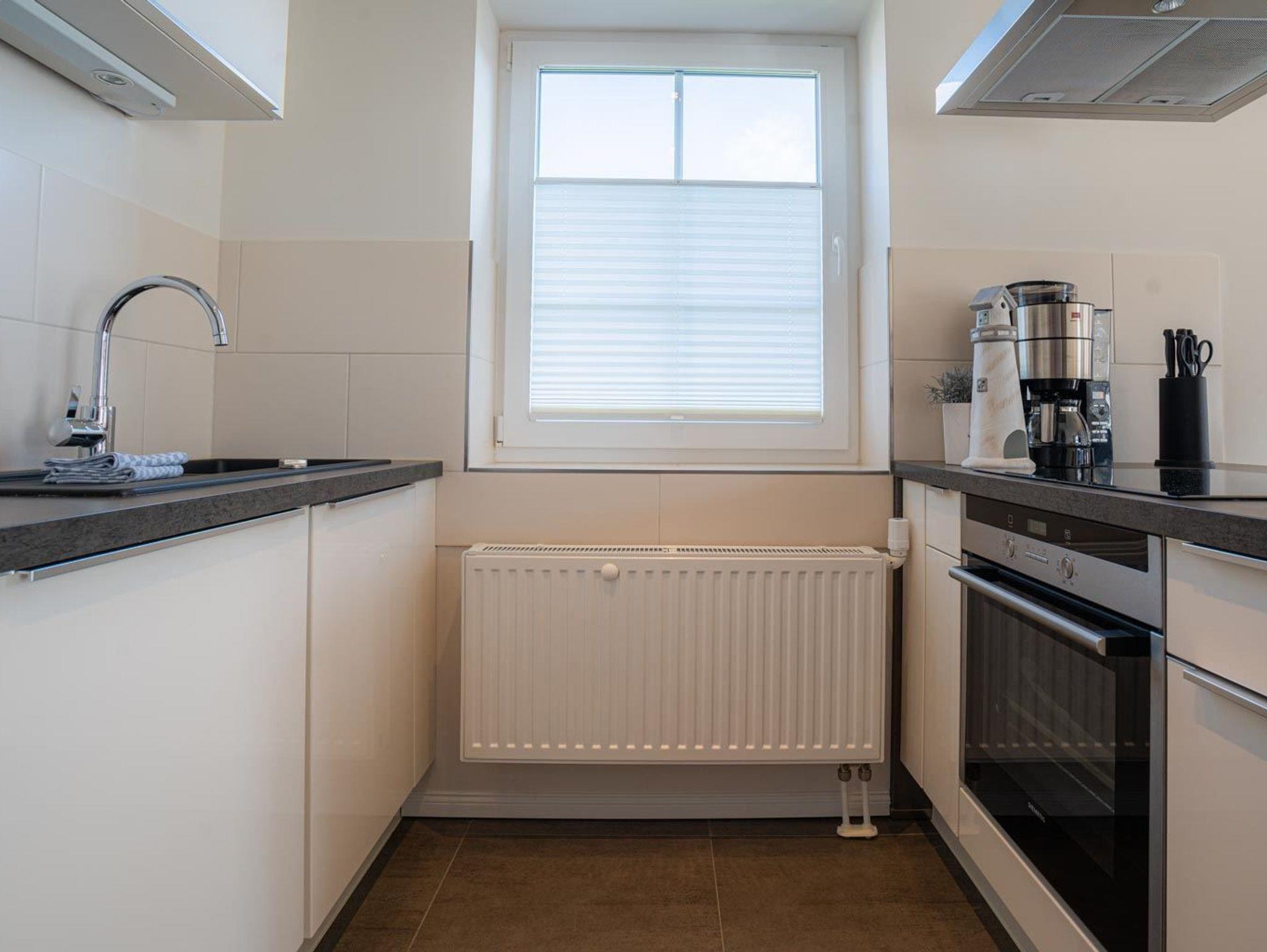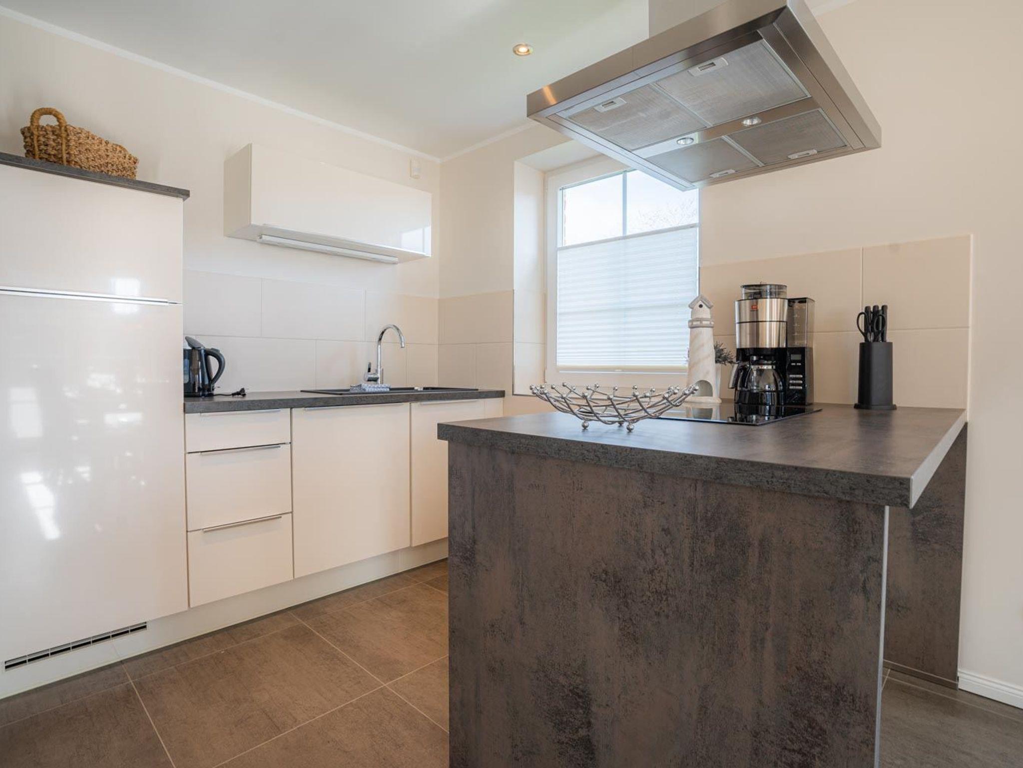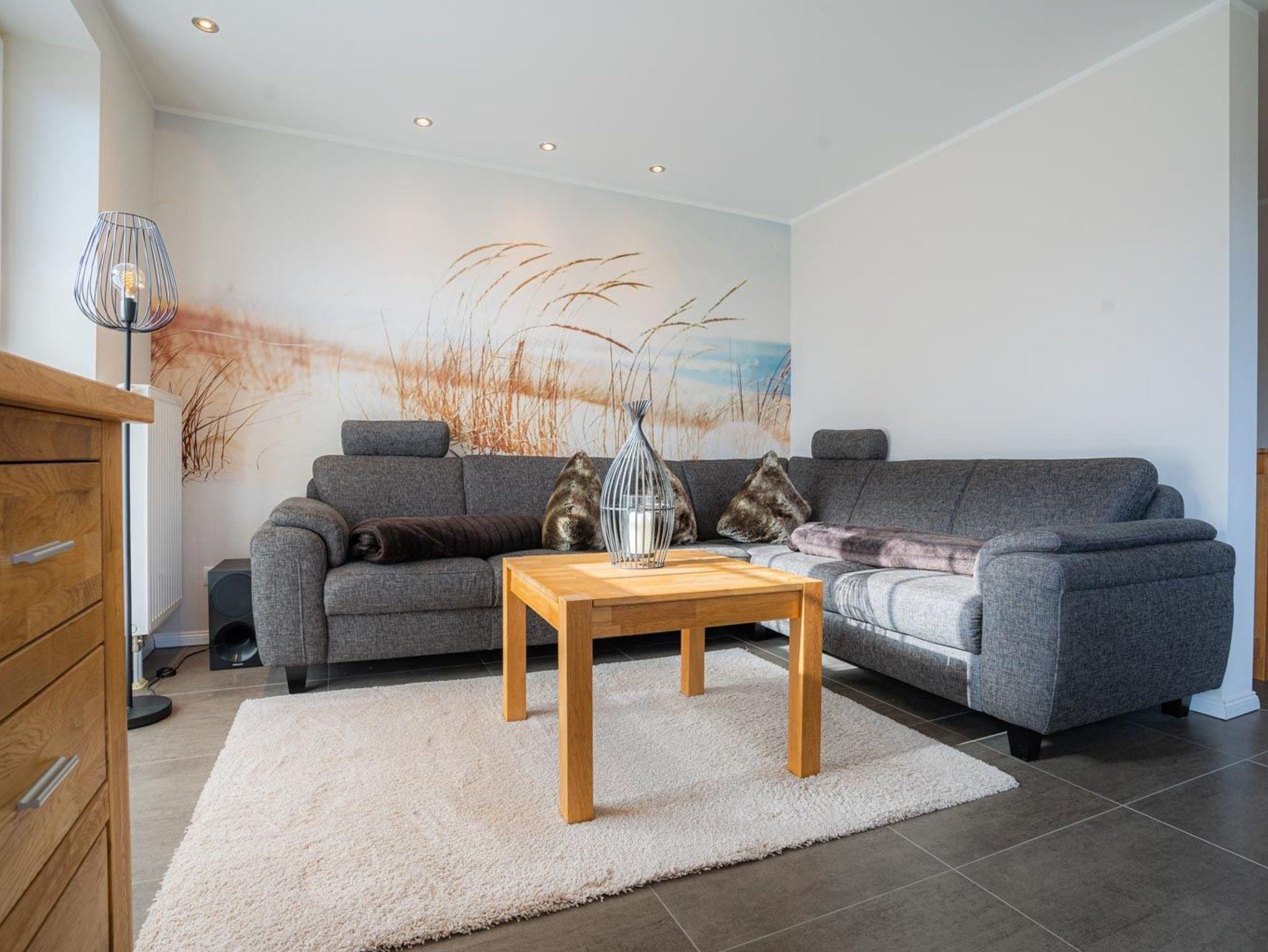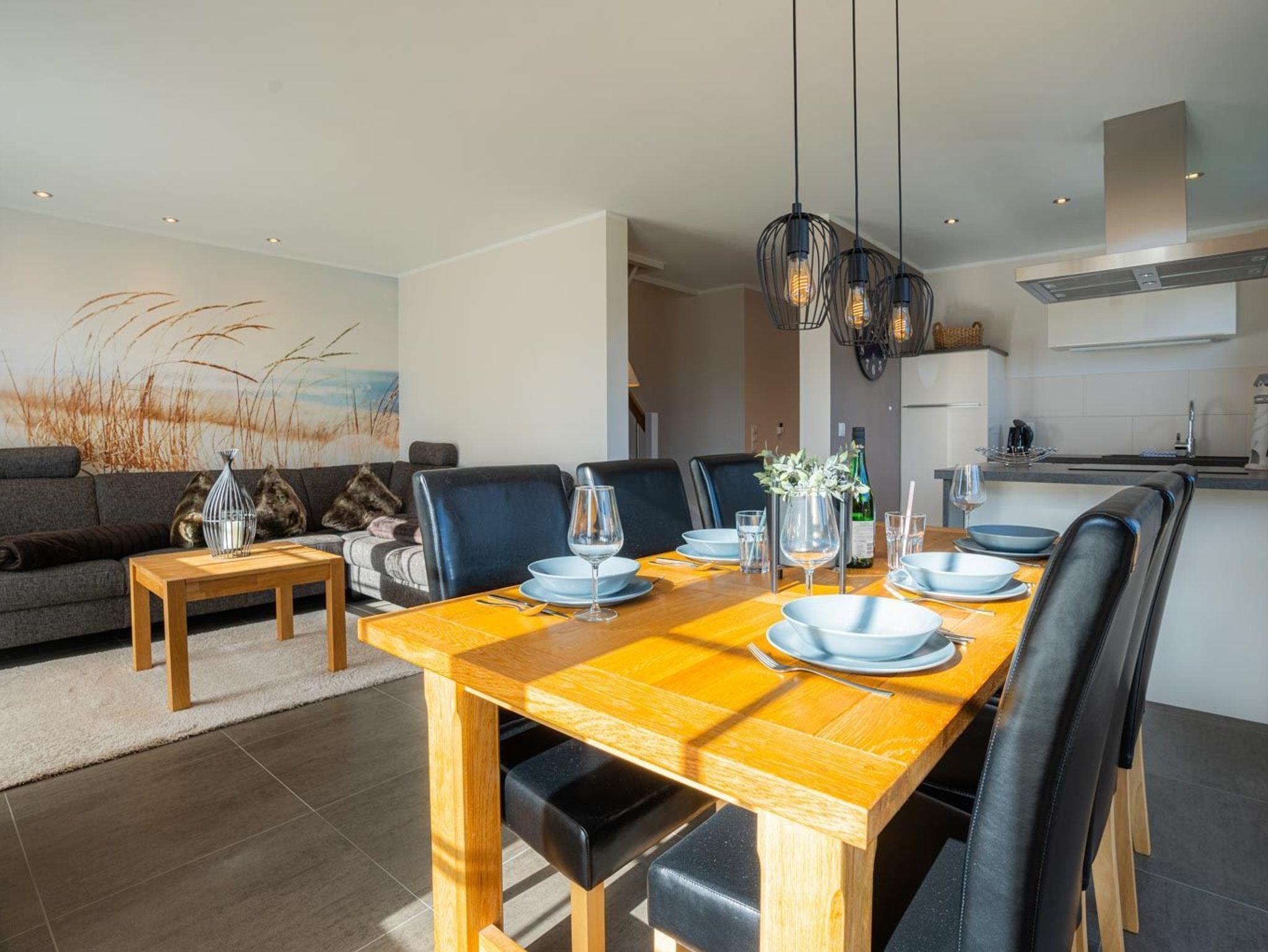 Wohnzimmer mit großem Eck-Sofa, SMART-TV (Sat, 46 Zoll). Zugang zur sonnigen Süd-Terrasse mit Gartenmöbeln und Strandkorb. Offene Küche mit Induktionsherd, Backofen, Geschirrspüler, Kühl-Gefrier-Kombination und Nespresso-Maschine.