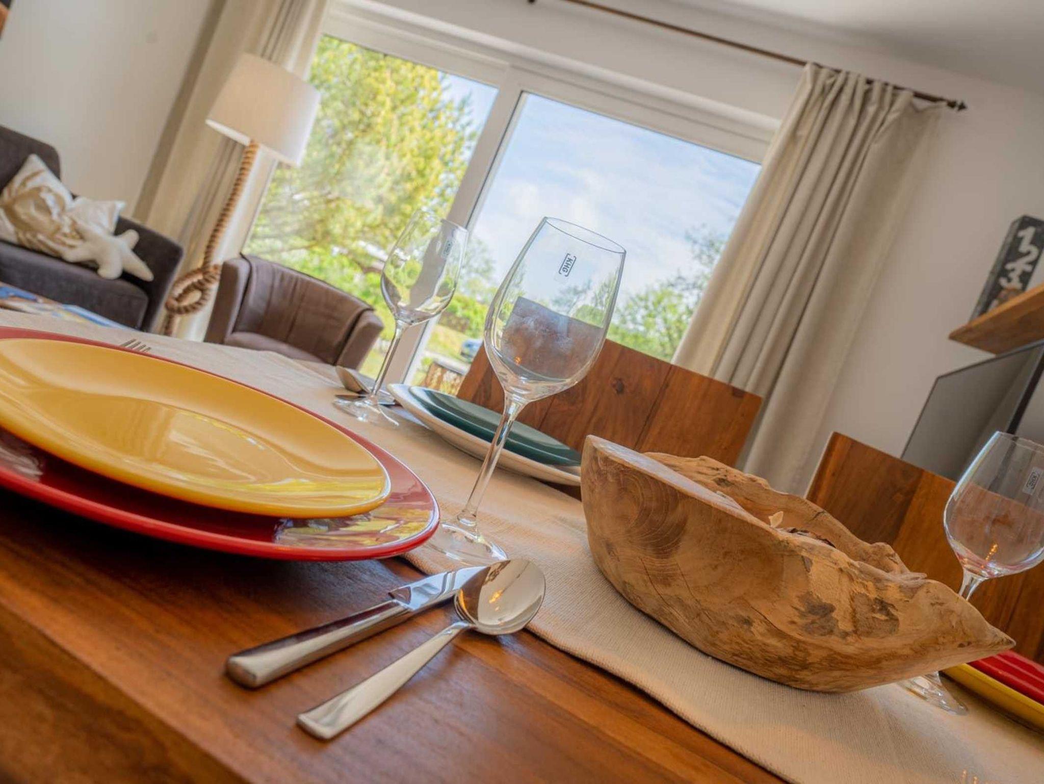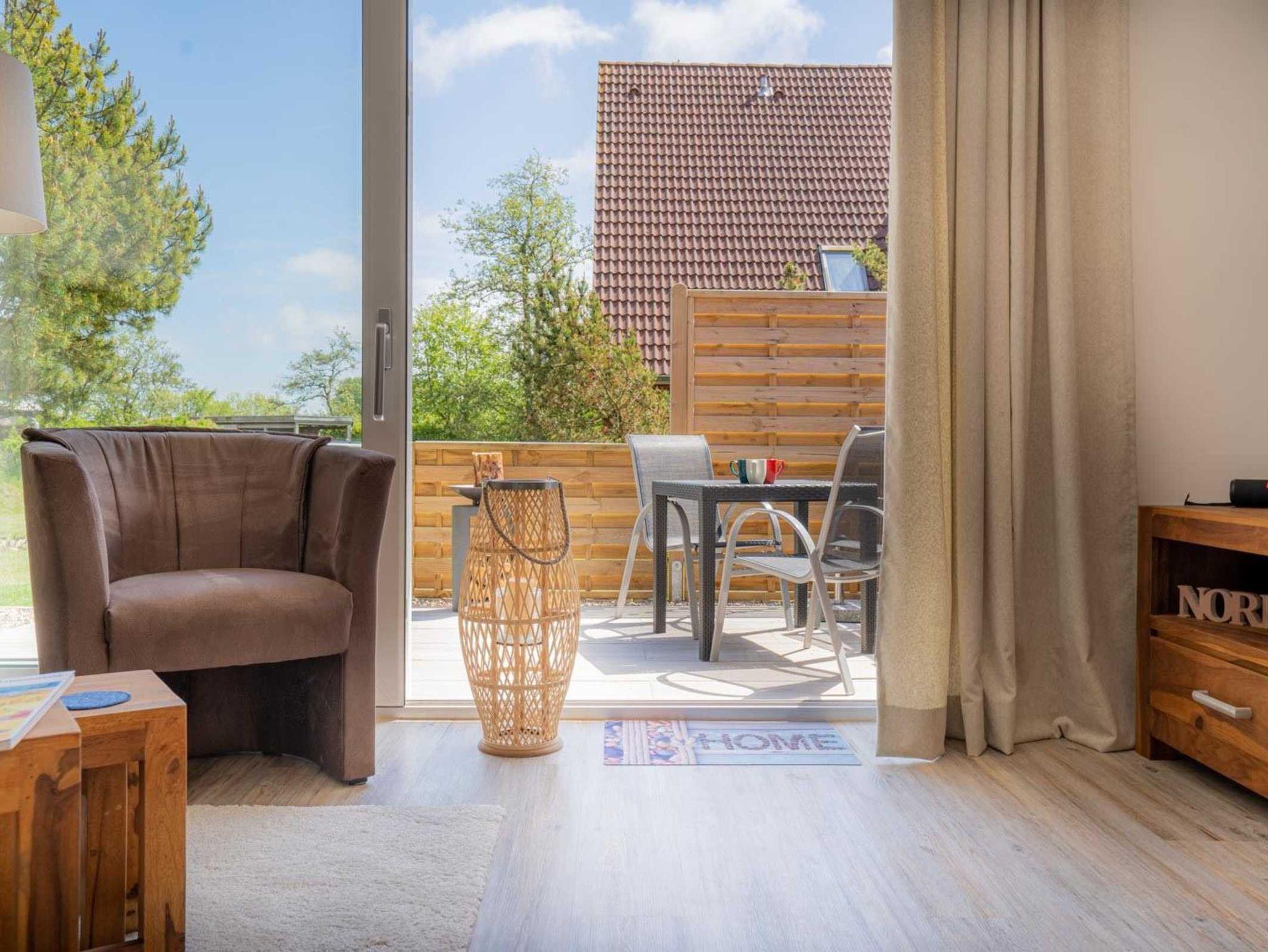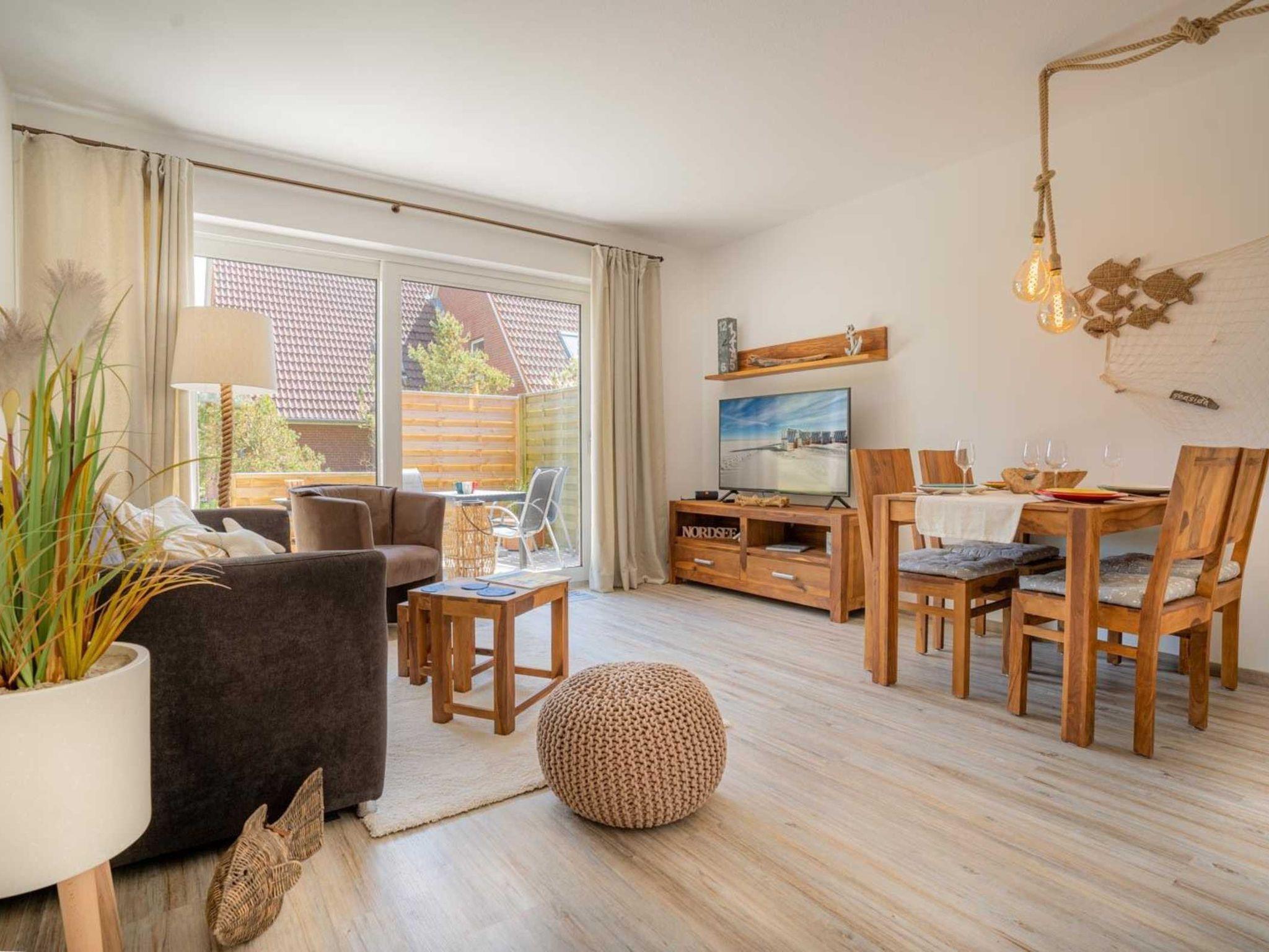 Wohnzimmer mit ausklappbarem (Schlaf-) Sofa (130x190cm), zwei Sesseln, SMART-TV (Sat) mit BlueRay-Player und Esstisch mit 4 Stühlen. Direkter Zugang zur möblierten, windgeschützten Gartenterrasse nach Südosten.