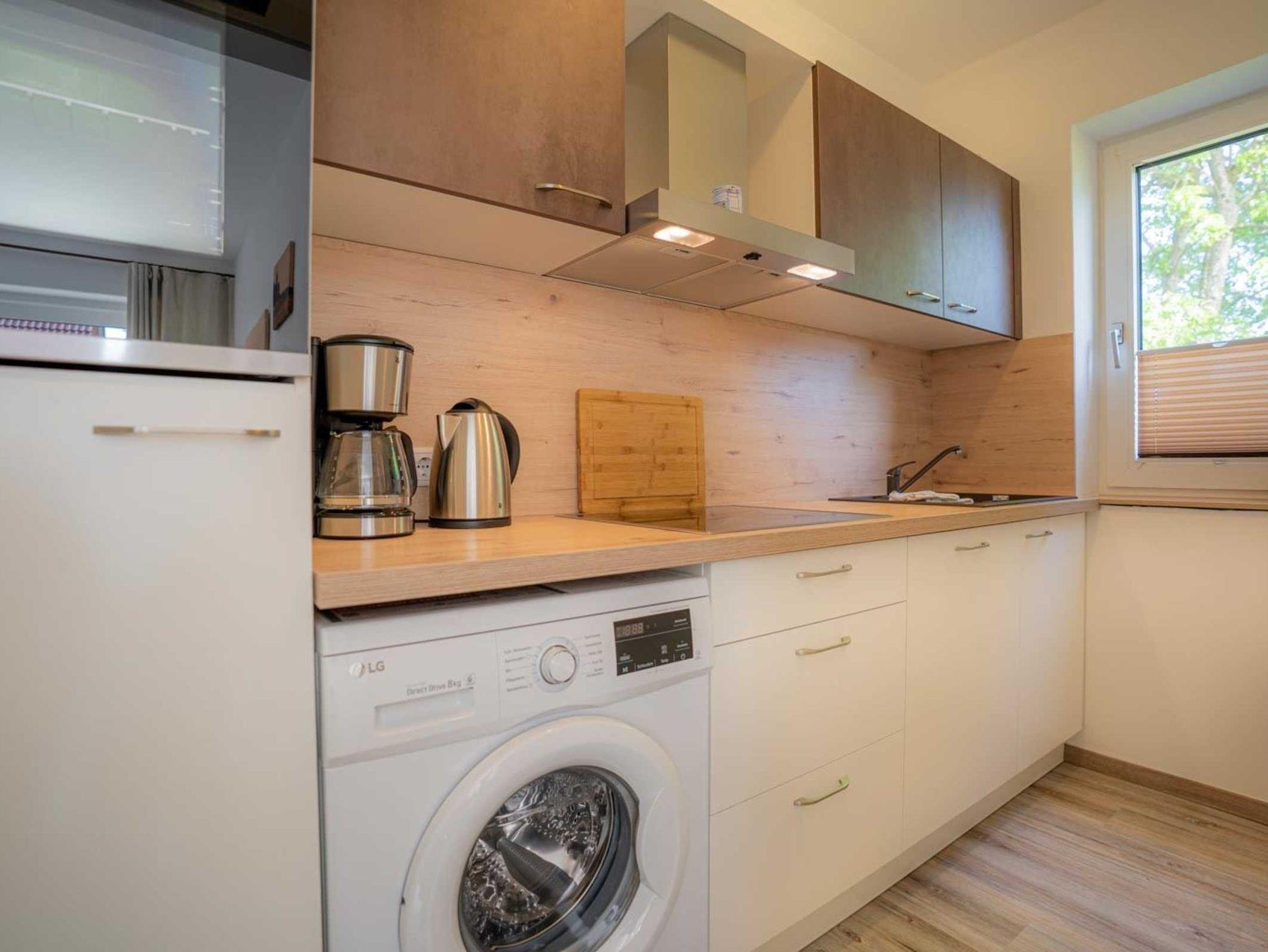 Halboffene Küche mit Backofen, Geschirrspüler, Kühlschrank mit Gefrierfach und Waschmaschine.