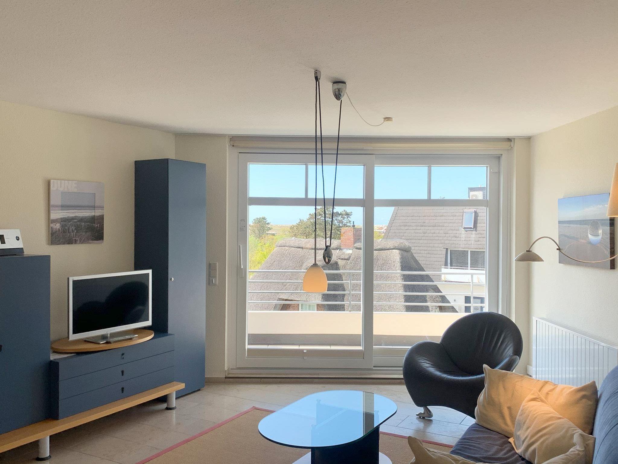 Wohnzimmer: Schlafcouch, Couchtisch, Sessel, Beistelltisch, Stehlampe, Regalschrankwand, Kabel-TV, Stereoanlage mit CD-Player, Nachtspeicherofen, Meerblick, Esstisch, 4 Stühle, Küchenzeile, 2 Plattenherd, Dunstabzugshaube, Kühlschrank, Spülmaschine, Mikrowelle, Kaffeemaschine, Wasserkocher, Toaster, Geschirr, Kochtöpfe